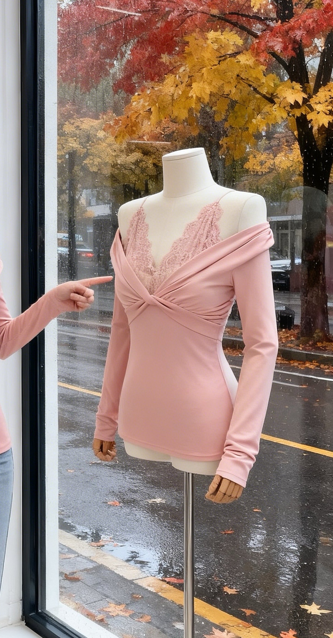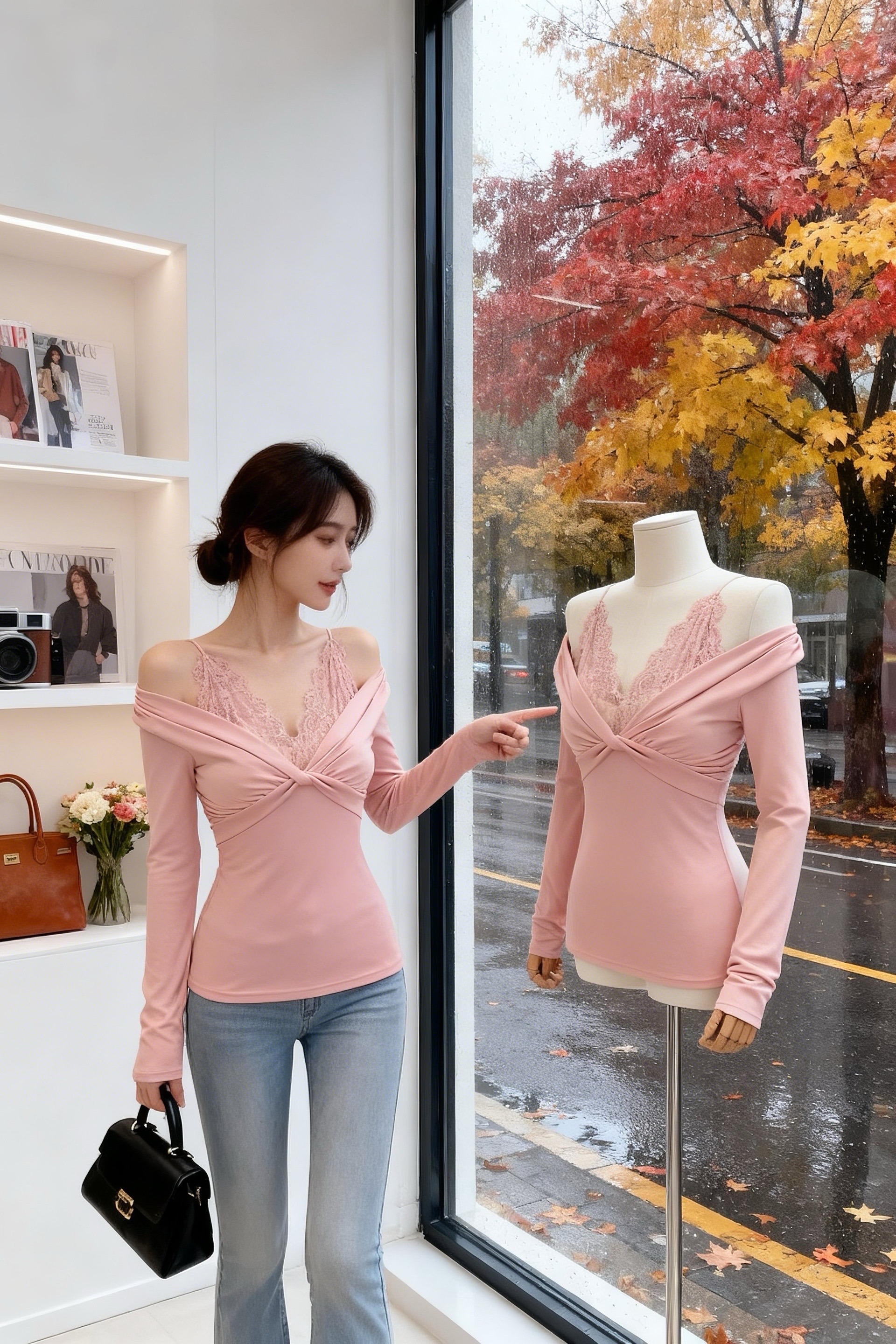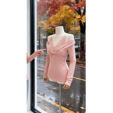 FA45090# 纯欲蕾丝拼接假两件扭结长袖T恤秋季新款法式修身显瘦短款上衣女 服裝批發女裝批發服飾貨源