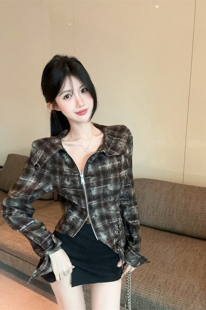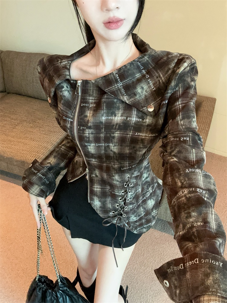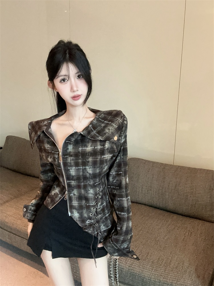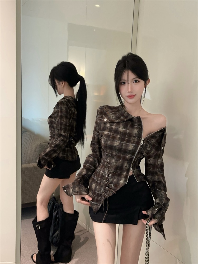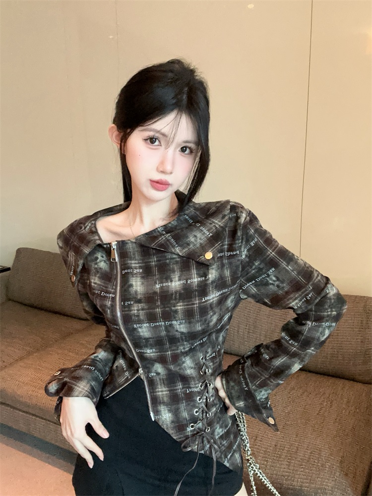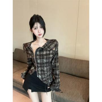 FA45098# 新款秋季美式复古气质格子设计感小众别致甜辣修身长袖上衣 服裝批發女裝批發服飾貨源