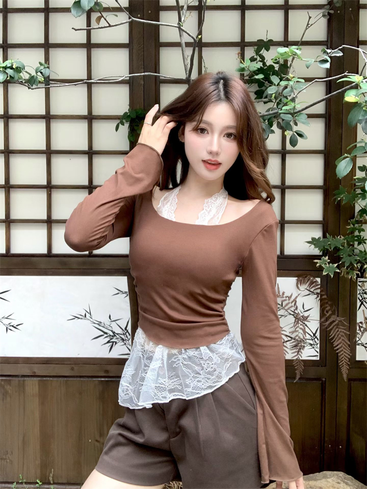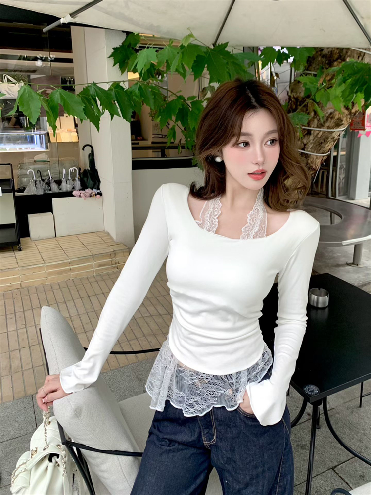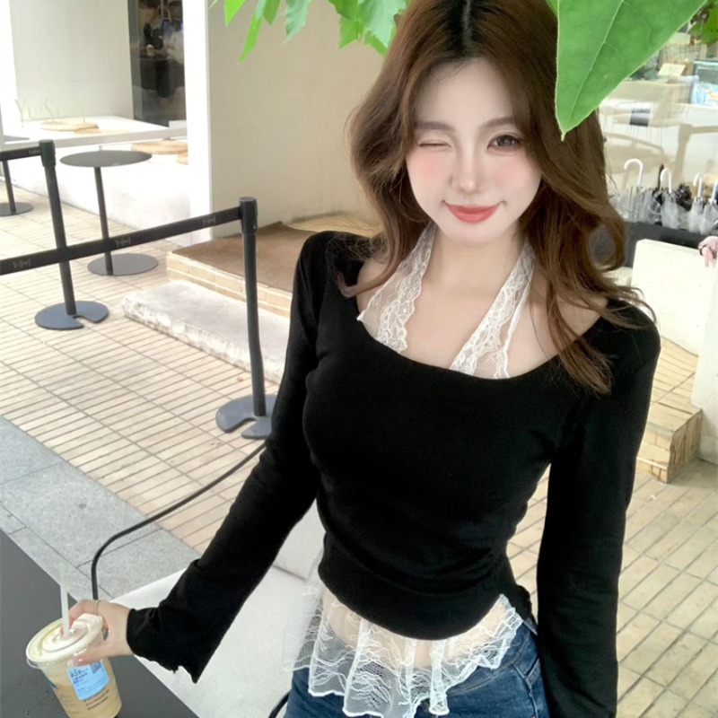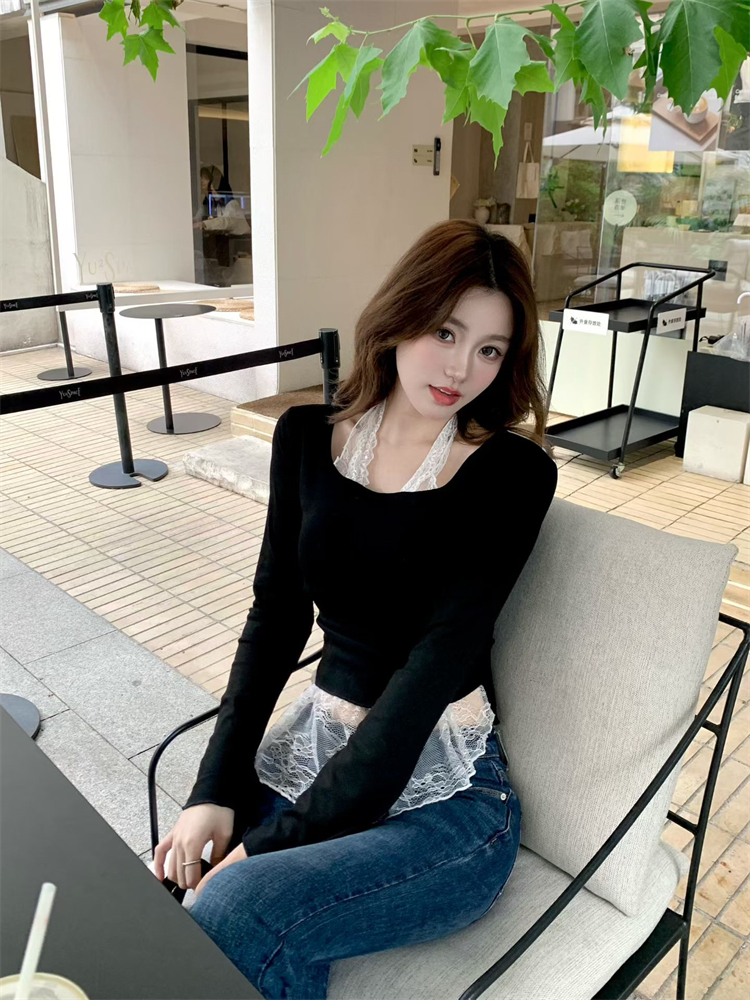 FA45101# 不减假两件蕾丝拼接挂脖长袖T恤女带胸垫修身绝美打底衫 服裝批發女裝批發服飾貨源