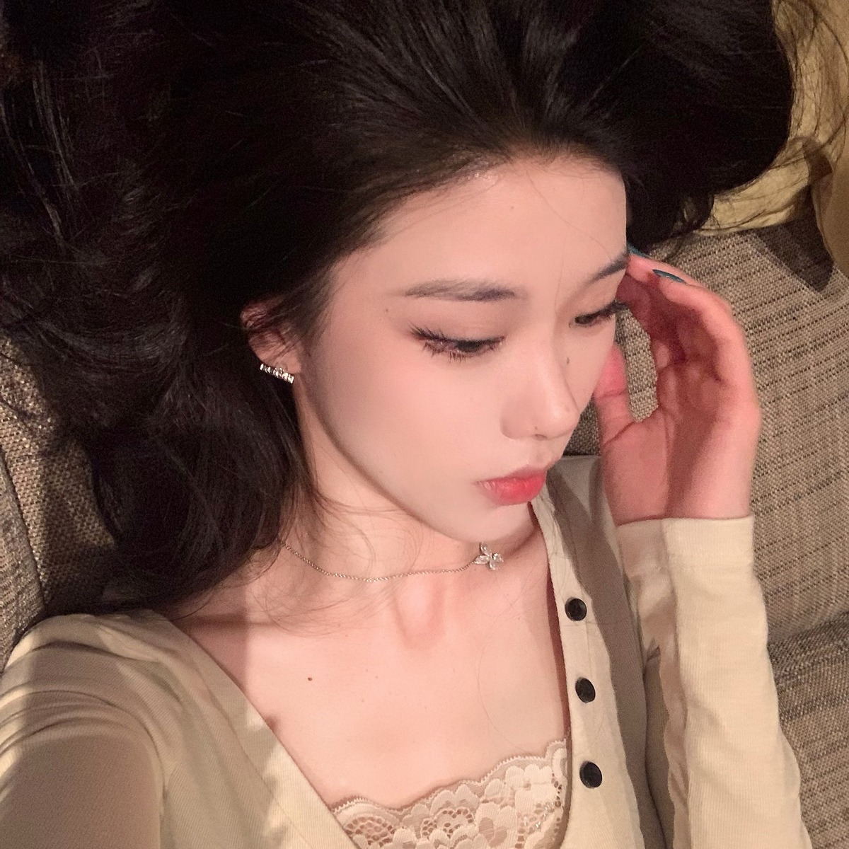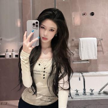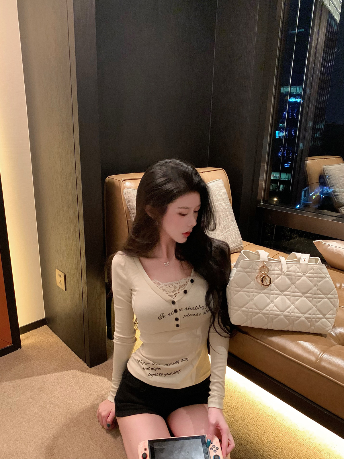 FA45254# 人棉千禧古早字母印花小上衣简约v领蕾丝休闲百搭长袖秋 服裝批發女裝批發服飾貨源