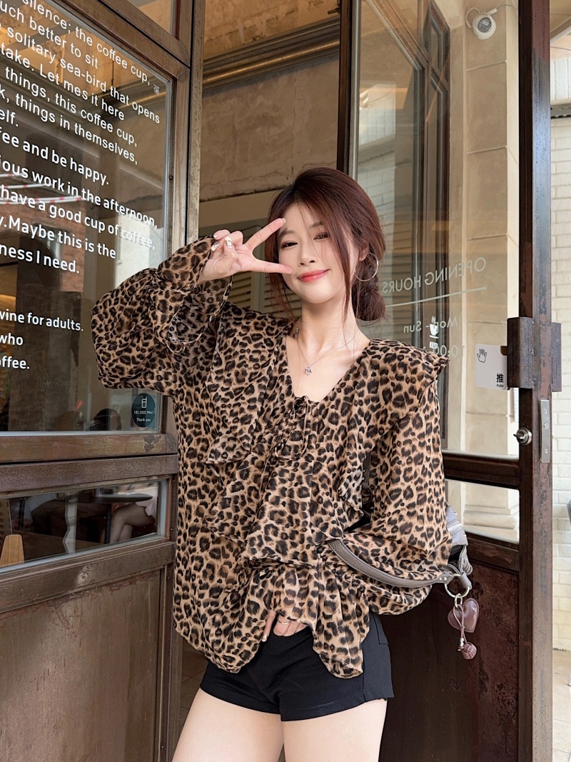 FA45301# 复古豹纹V领衬衫女新款宽松显瘦百搭辣妹上衣 服裝批發女裝批發服飾貨源