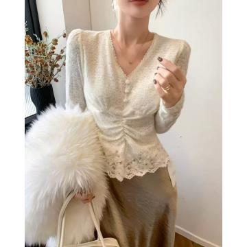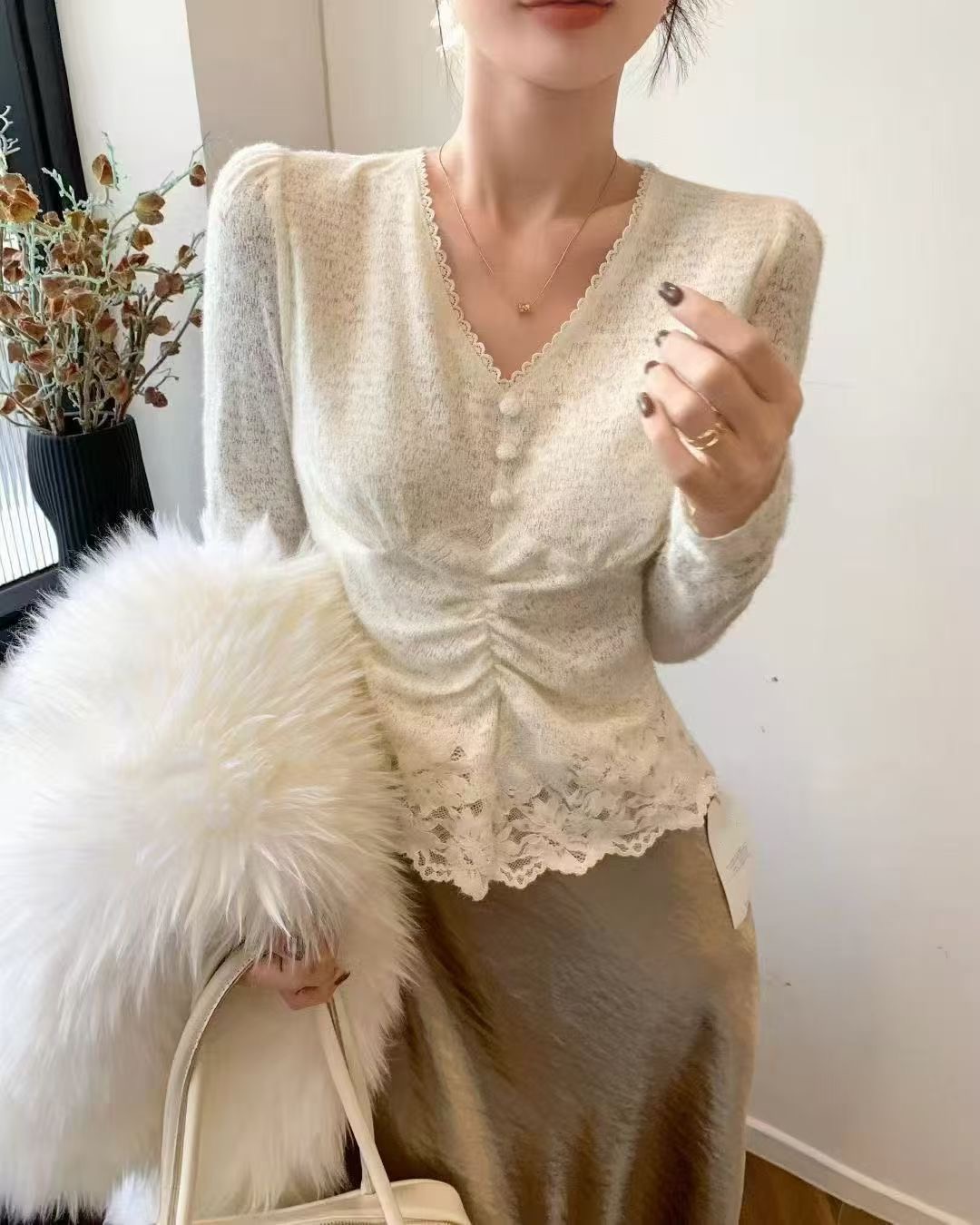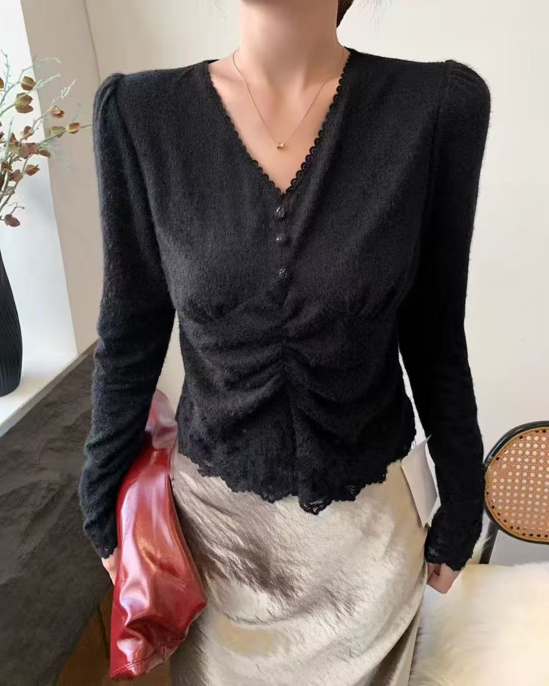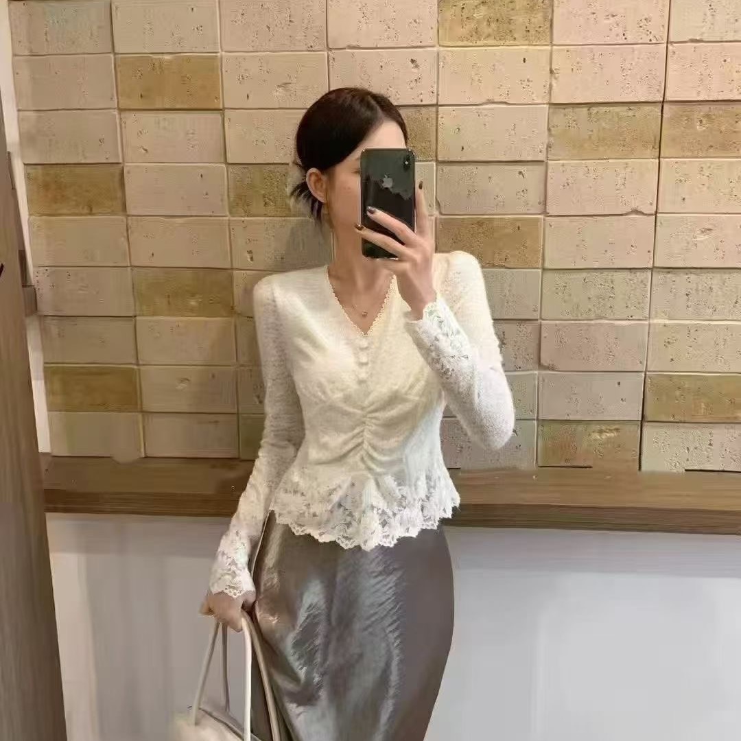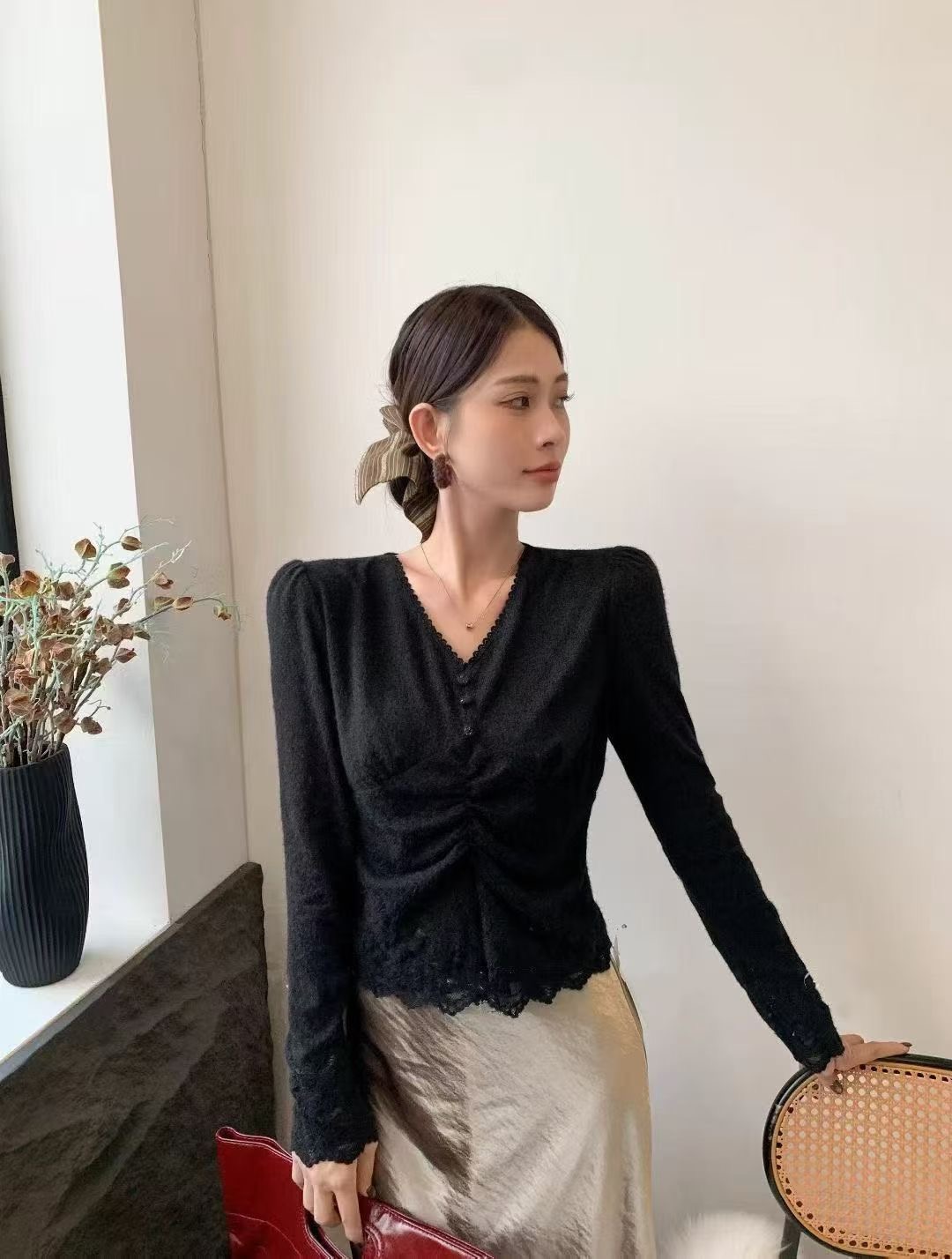 FA45674# 秋冬新款法式蕾丝衬衫女甜美高级感洋气v领修身显瘦内搭上衣 服裝批發女裝批發服飾貨源