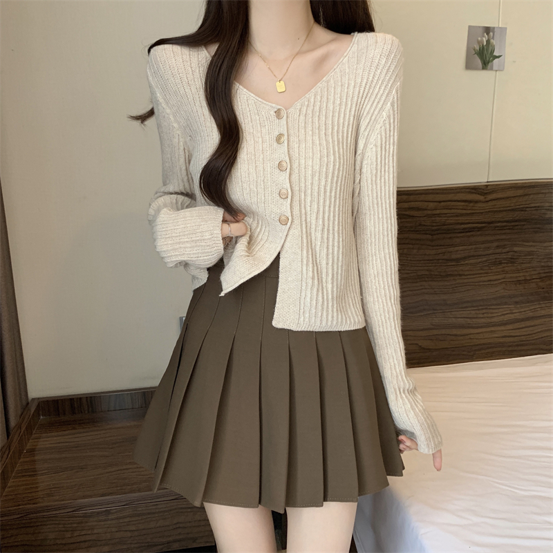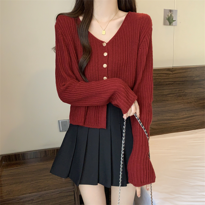 FA45761# V领纯色长袖针织衫女秋季新款簿款外搭短款设计感排扣气质毛衣潮 服裝批發女裝批發服飾貨源
