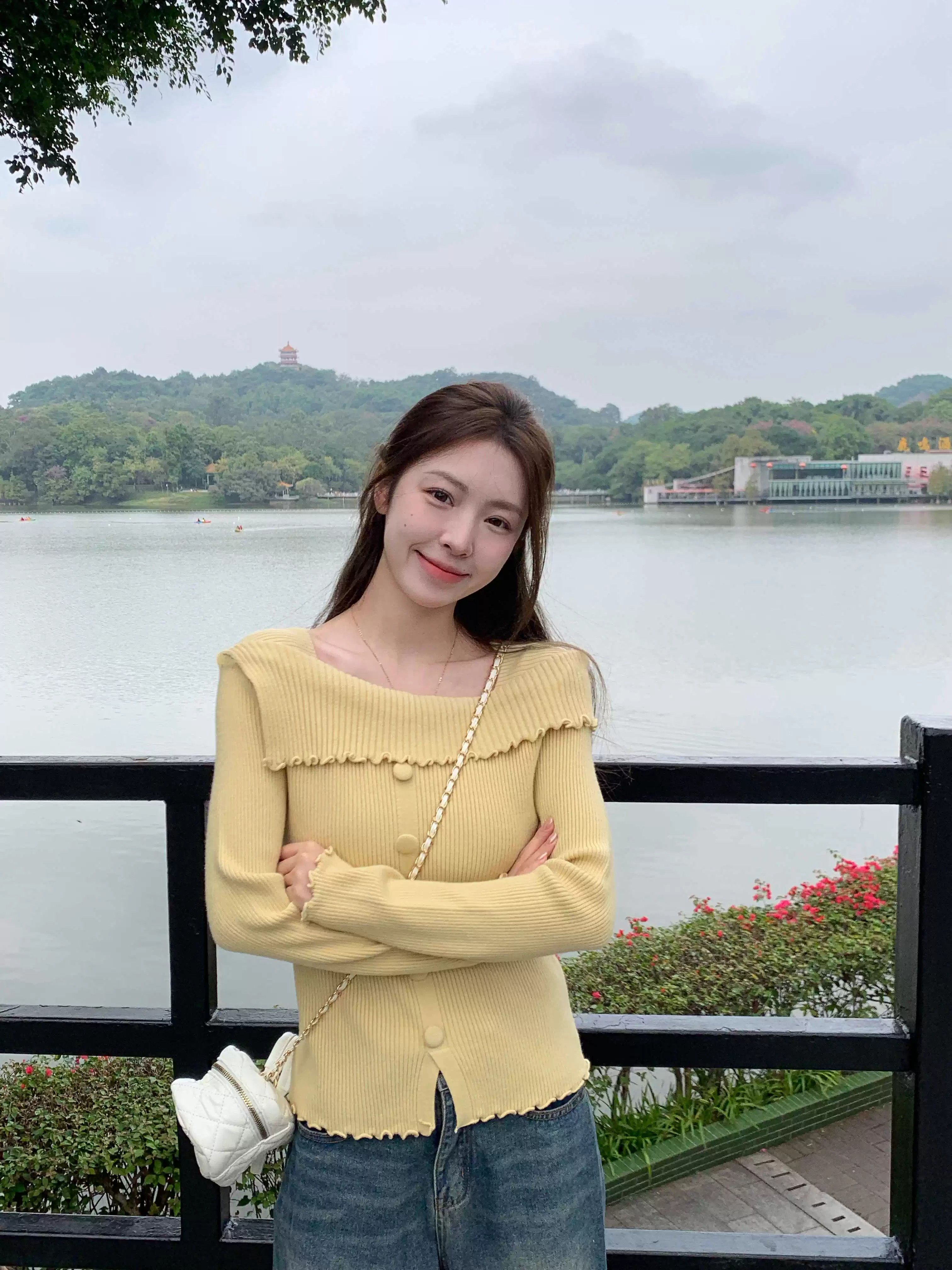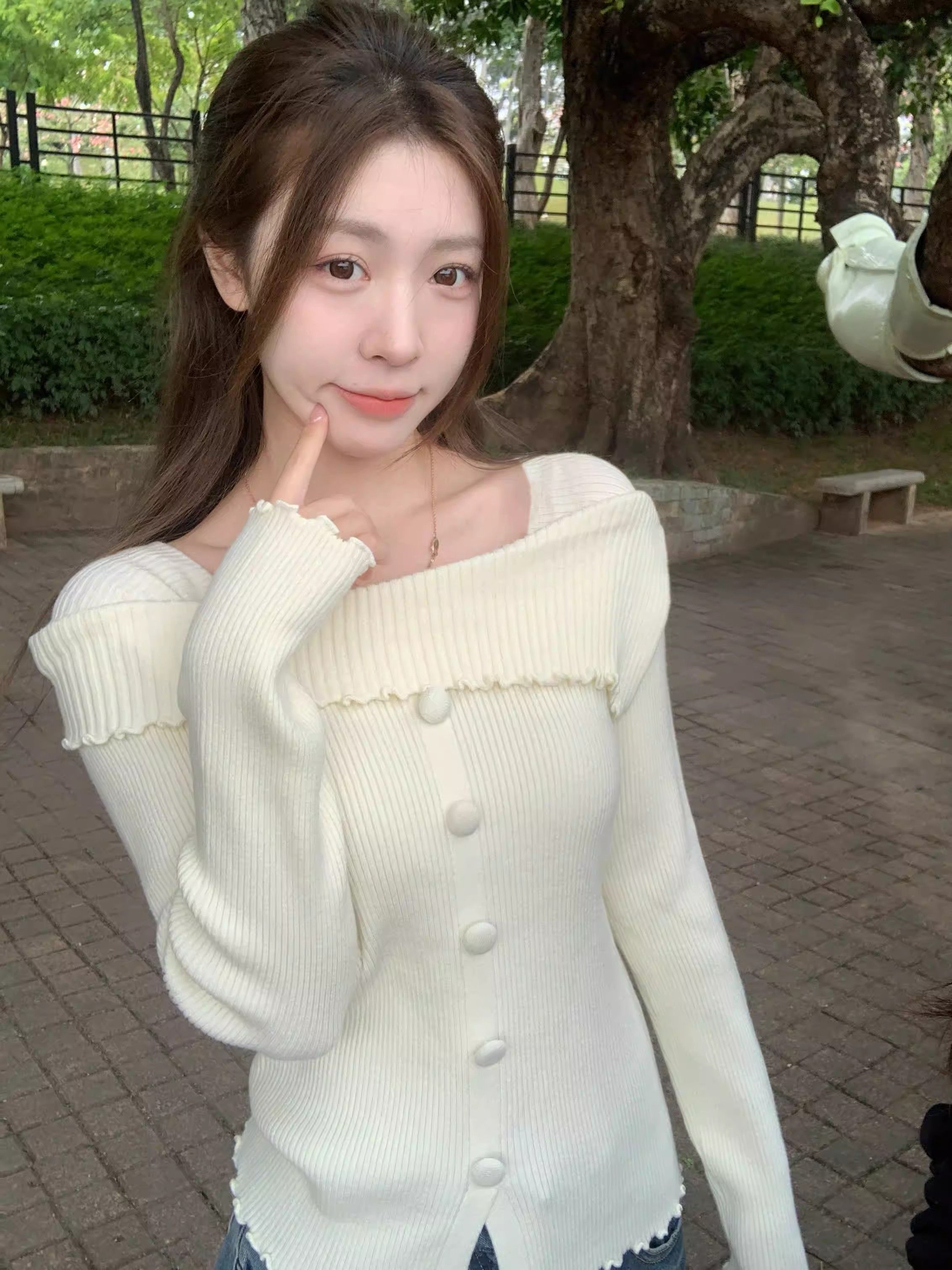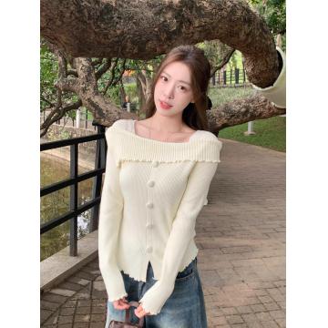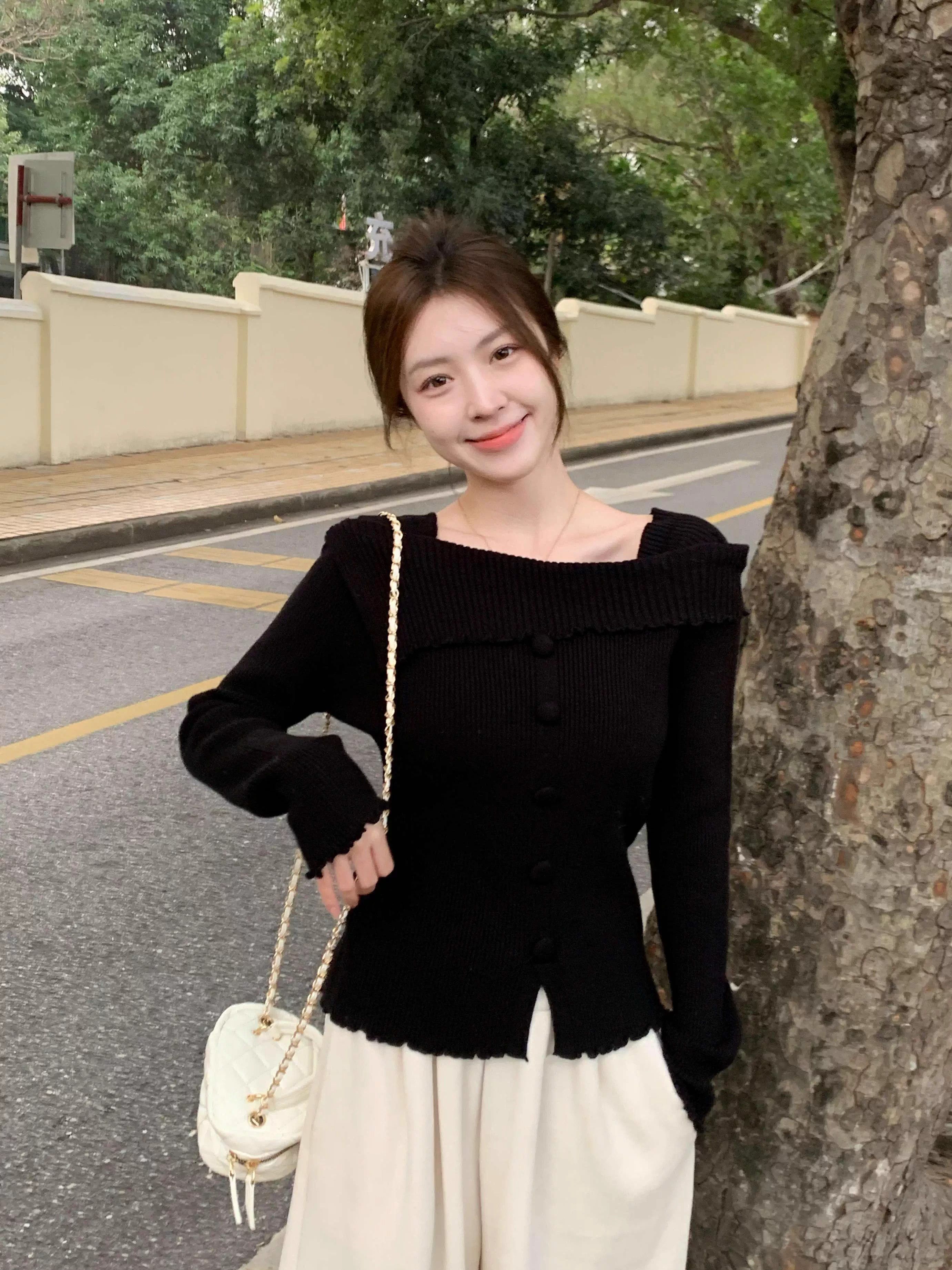 FA45766# 一字肩木耳边打底衫女春秋纯欲内搭毛衣开叉针织上衣 服裝批發女裝批發服飾貨源