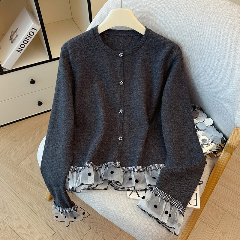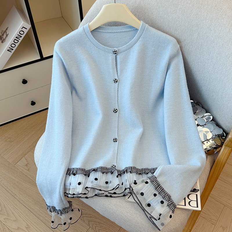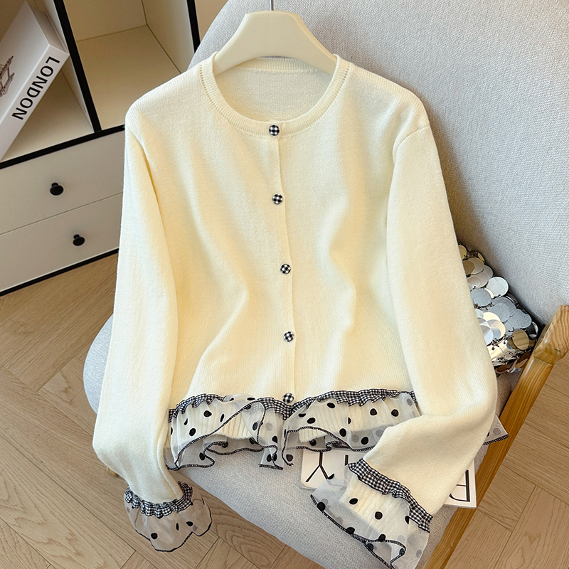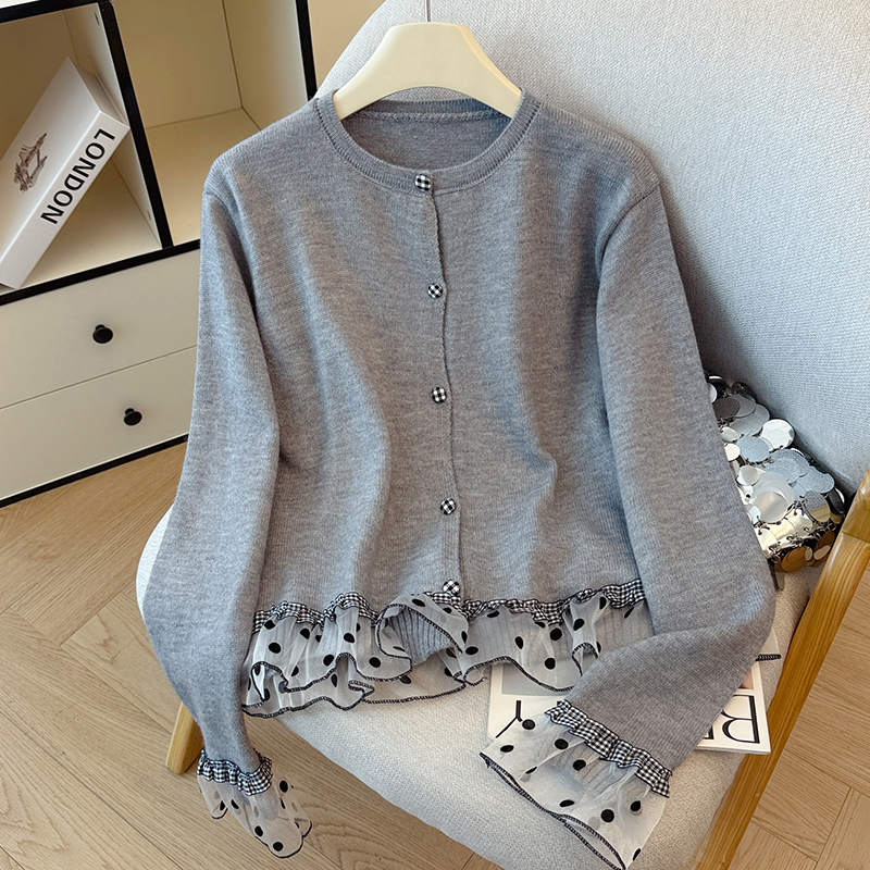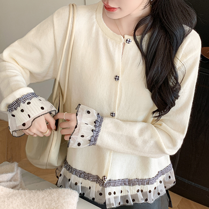 FA45794# 韩系波点格子木耳边拼接甜美针织衫女秋冬温柔感毛衣开衫上衣 服裝批發女裝批發服飾貨源