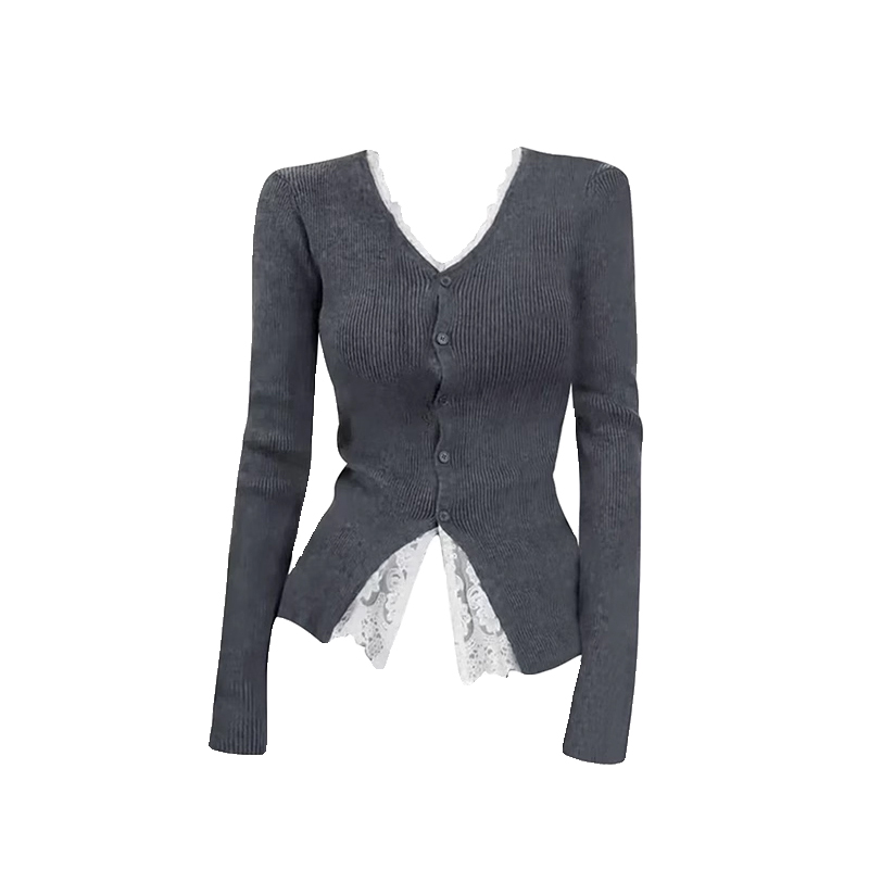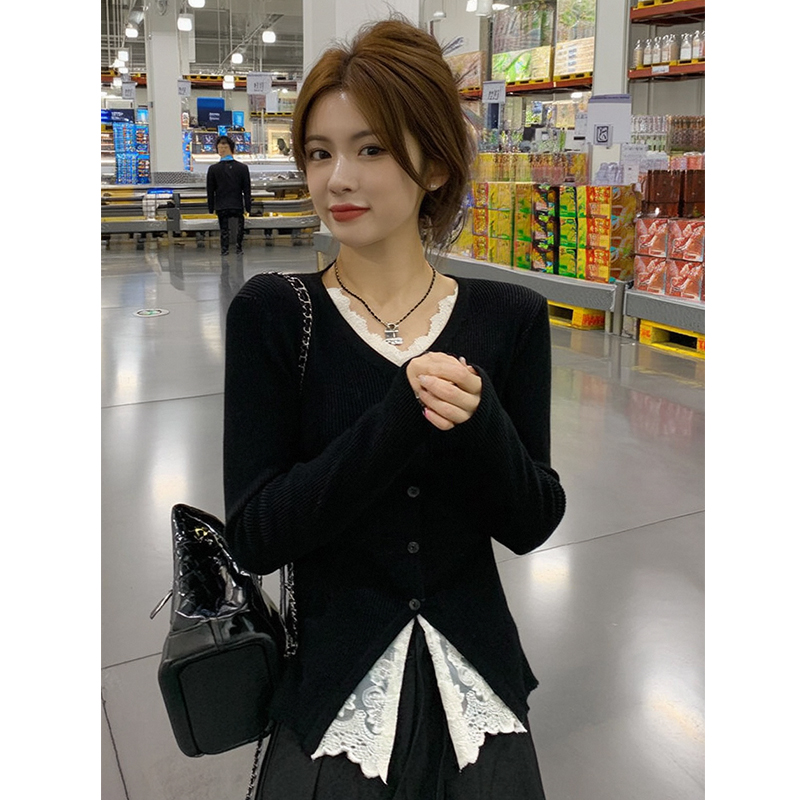 FA45838# 蕾丝拼接v领针织开衫女初秋季穿搭收腰内搭设计感开叉上衣 服裝批發女裝批發服飾貨源