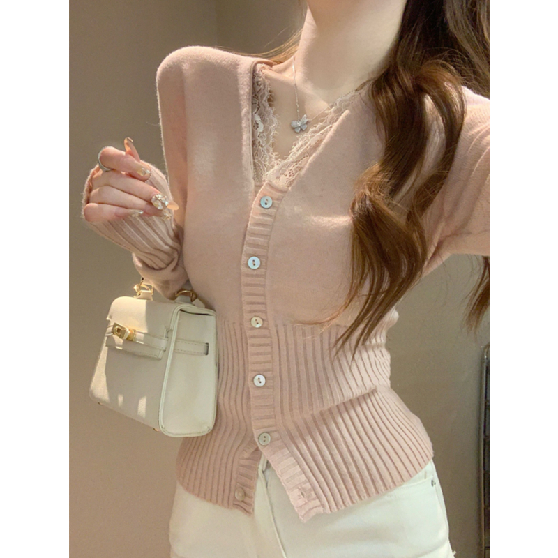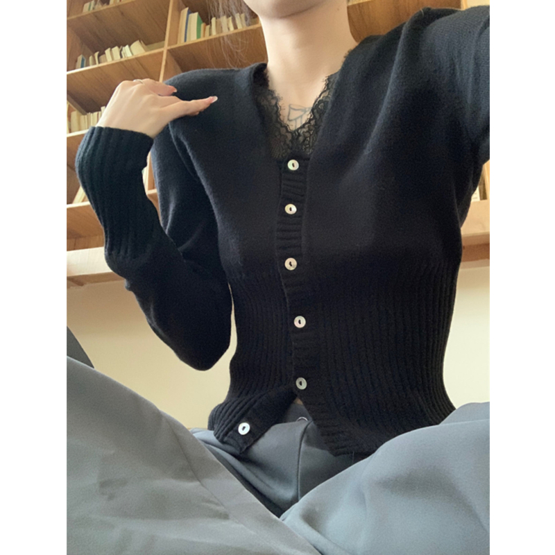 FA45844# v领蕾丝拼接针织衫女春秋季新款修身显瘦内搭上衣 服裝批發女裝批發服飾貨源