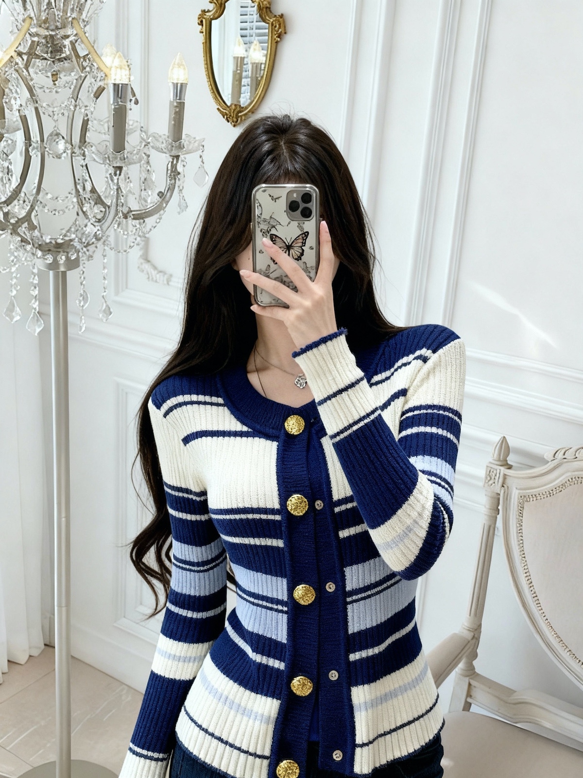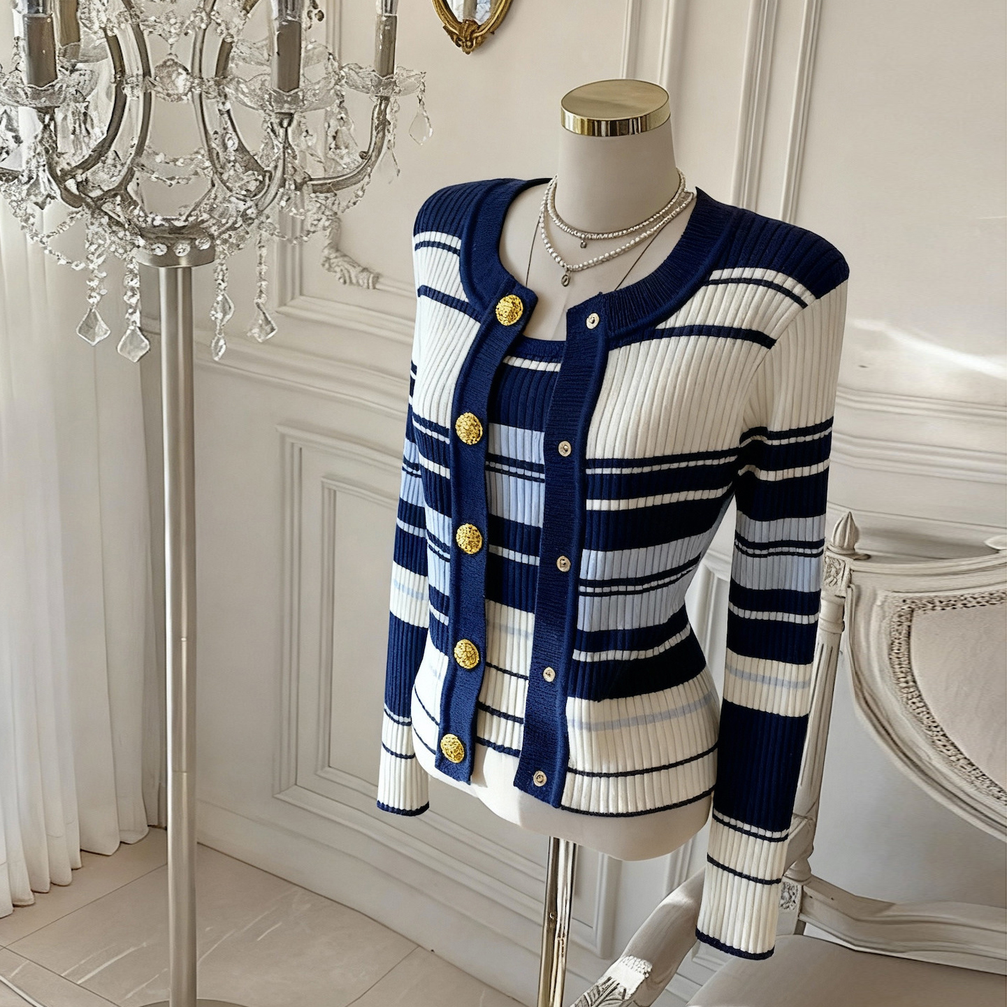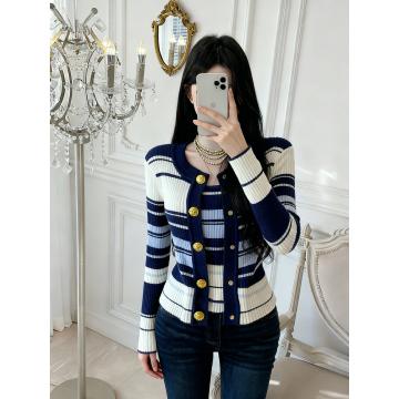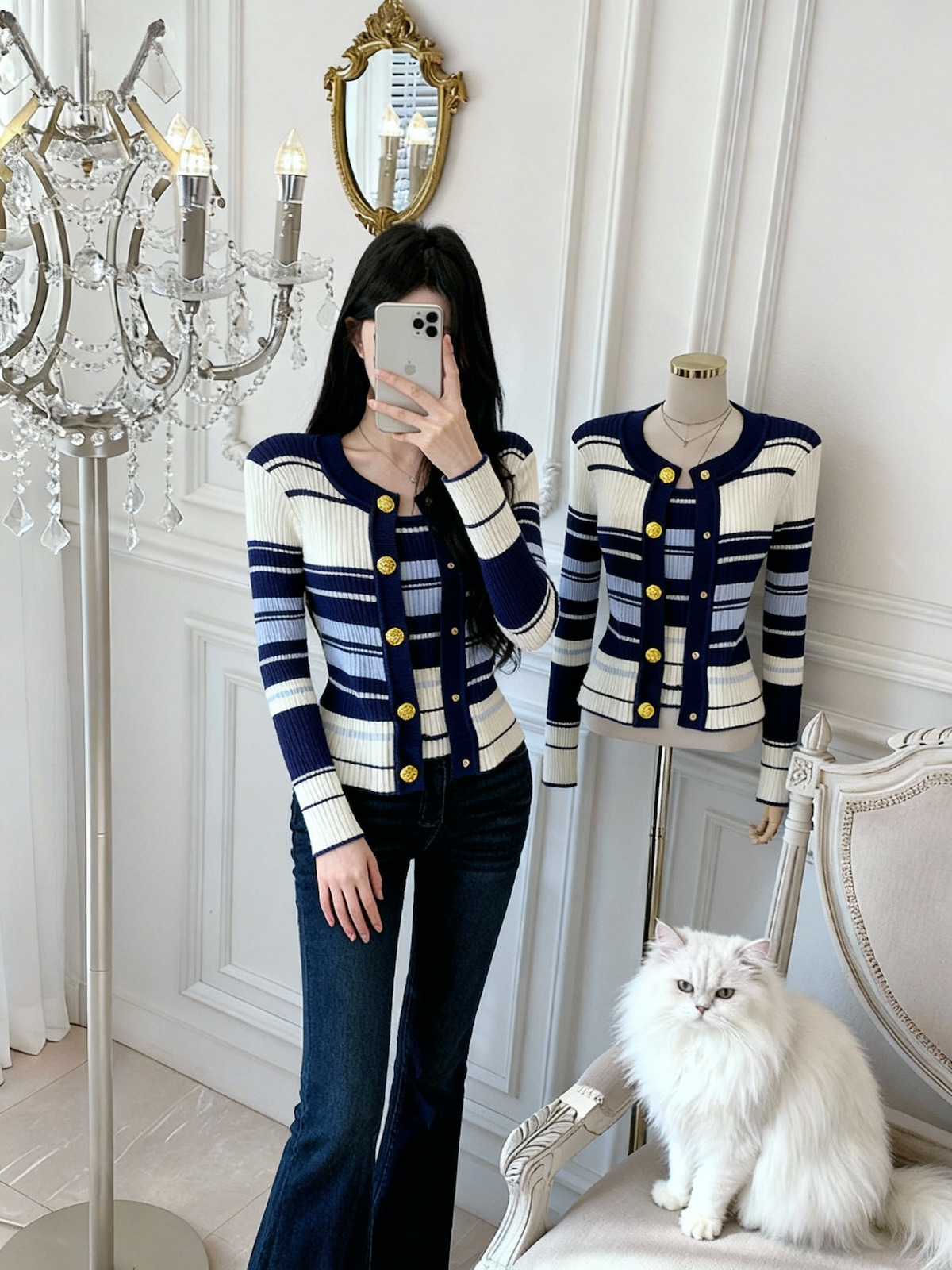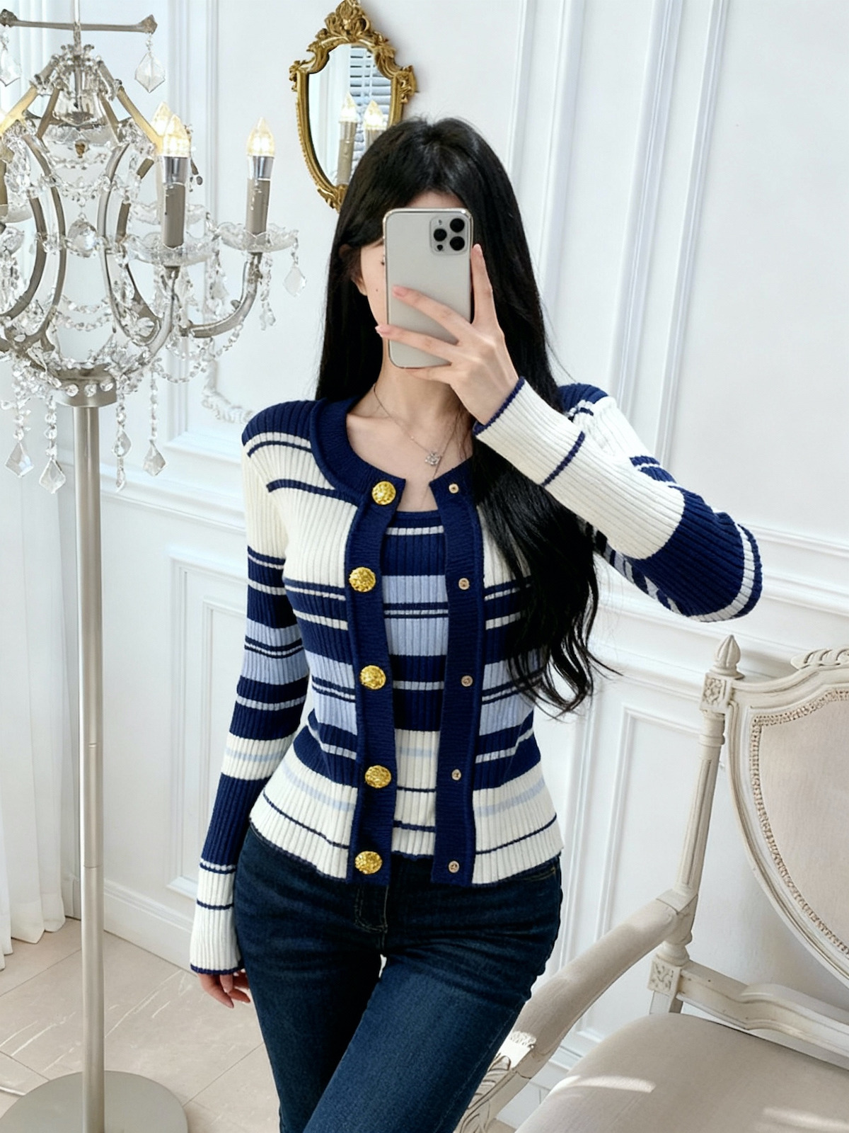 FA45925# 条纹轻盈修身内搭吊带+松弛外搭开衫套装 服裝批發女裝批發服飾貨源