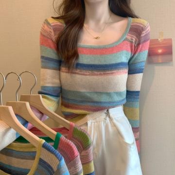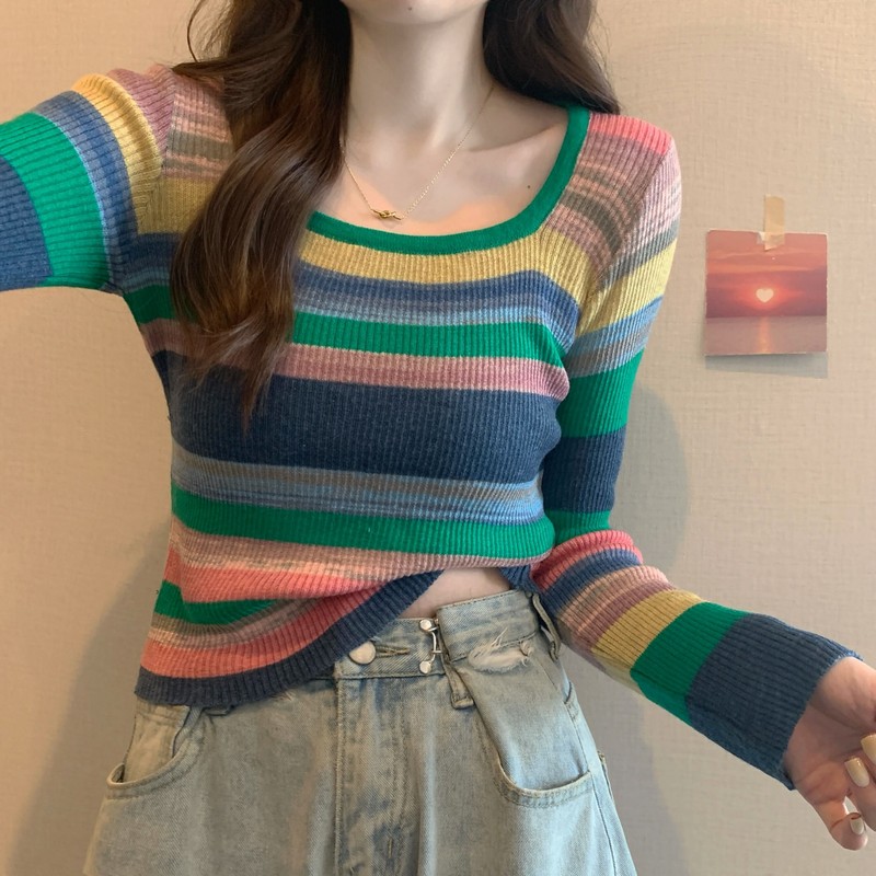 FA46119# 秋冬新款韩版甜辣风方领小众撞色条纹修身显瘦软糯短款T恤衫 服裝批發女裝批發服飾貨源