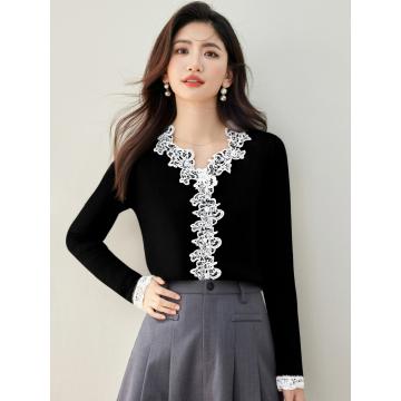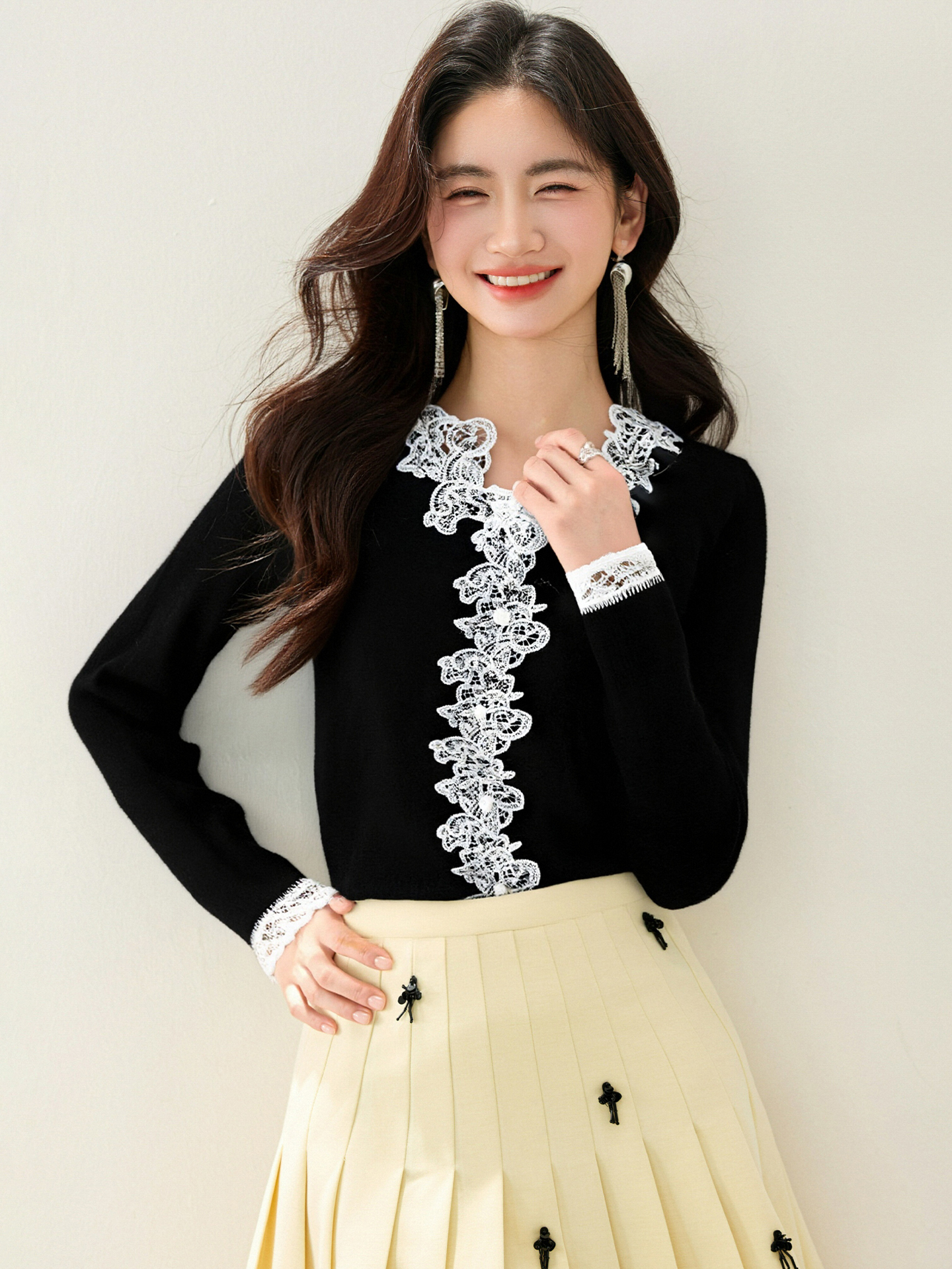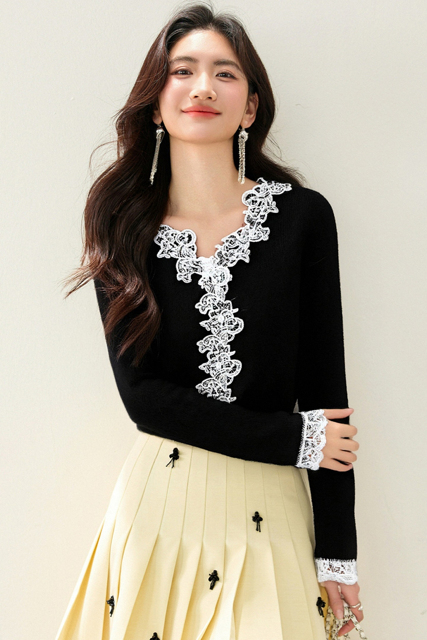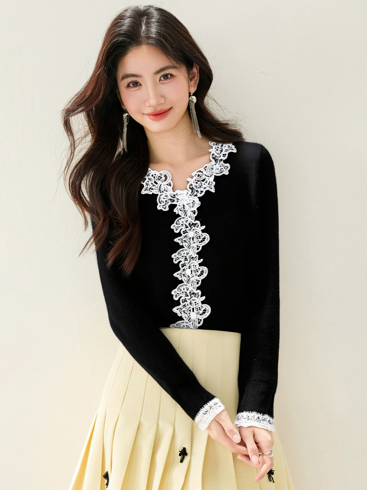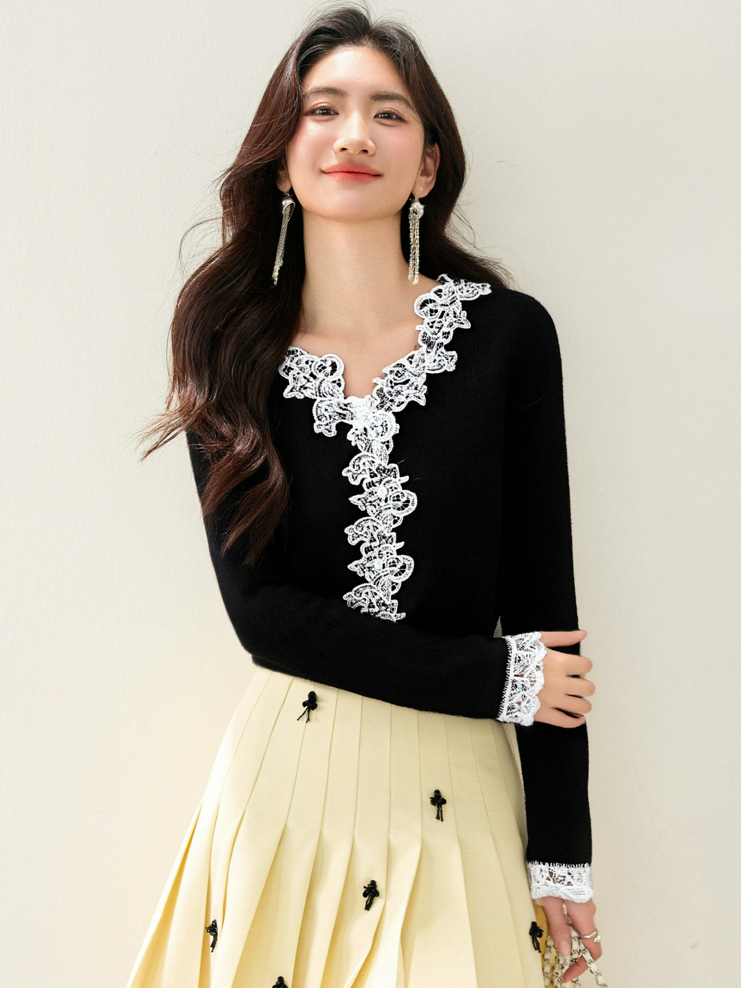 FA46136# ◆韩系甜美蕾丝拼接V领针织衫女秋冬新款气质百搭上衣 服裝批發女裝批發服飾貨源