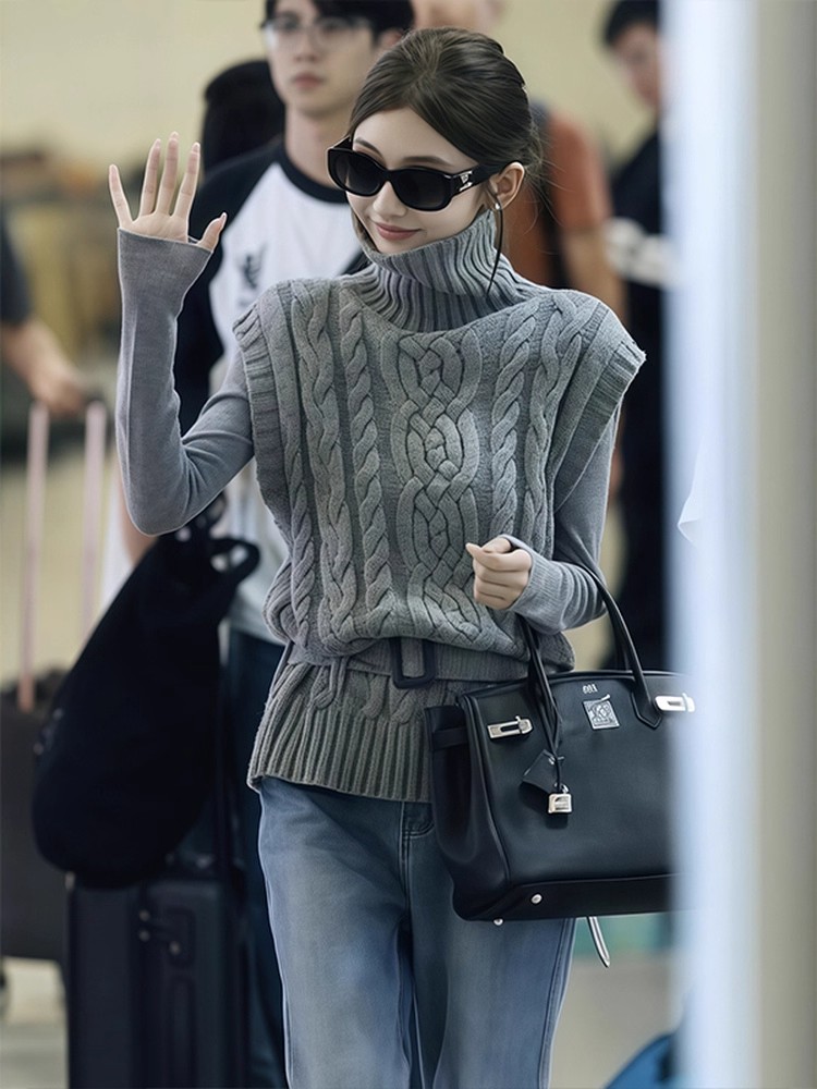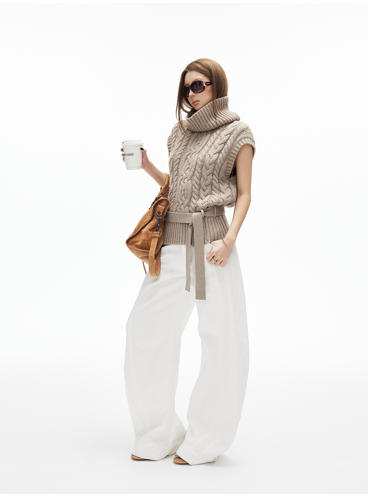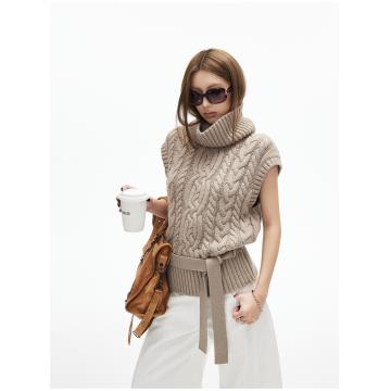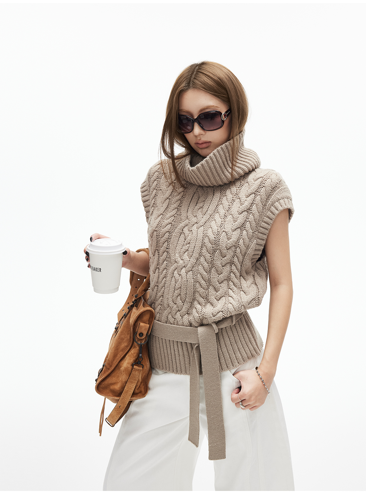 FA46257# 粗针编织立体花高领小飞袖腰带绞花毛衣背心三色可选 服裝批發女裝批發服飾貨源