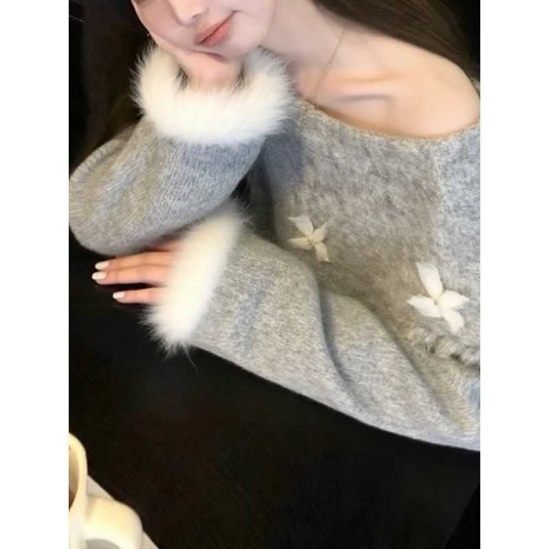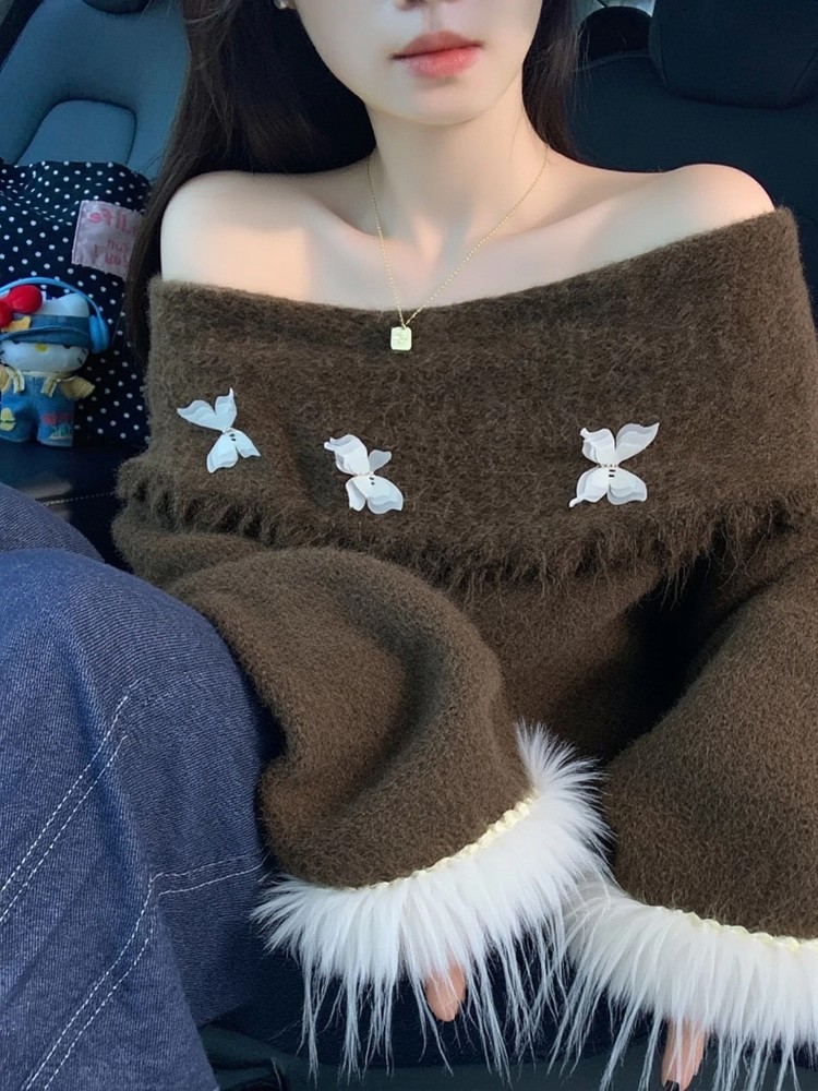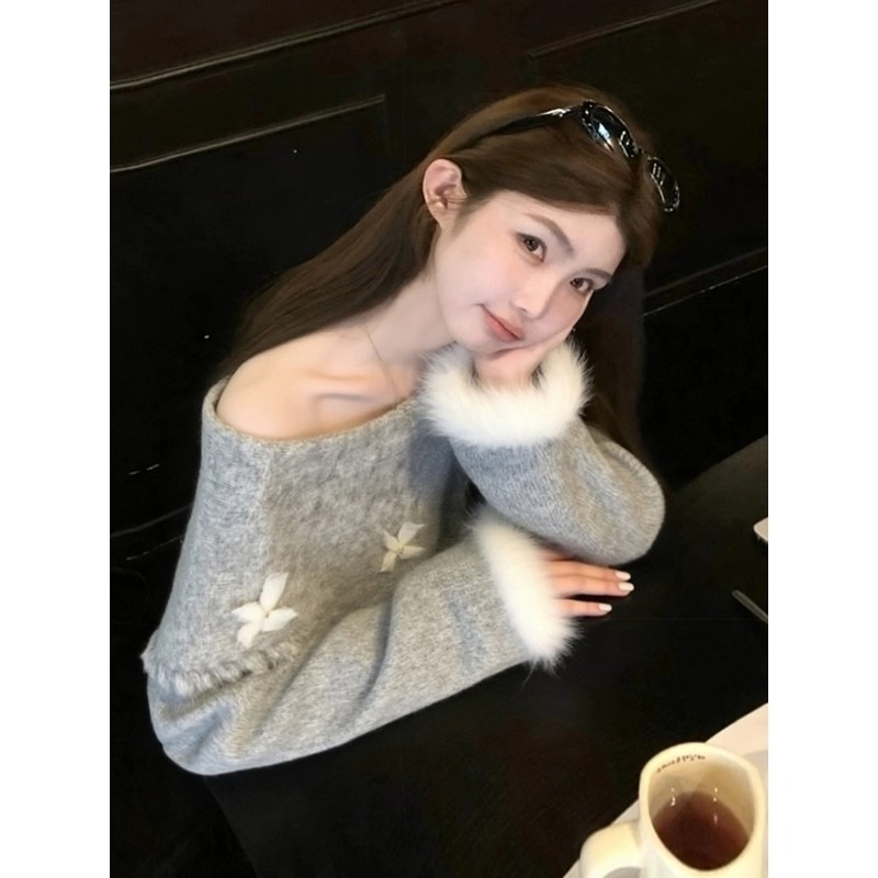 FA46258# 韩系氛围感宽松慵懒风百搭上衣高级感灰色蝴蝶结一字肩毛衣女秋冬 服裝批發女裝批發服飾貨源