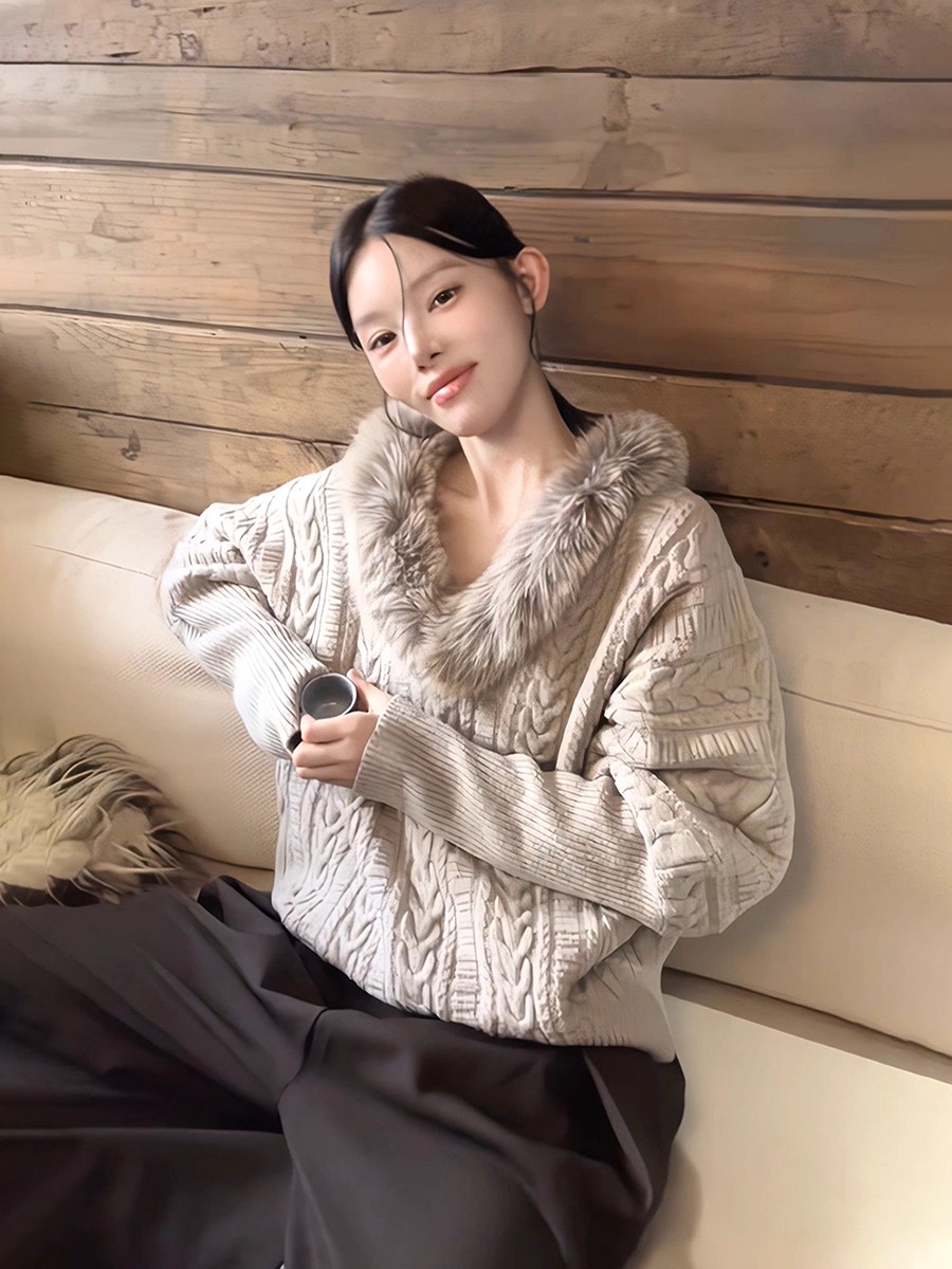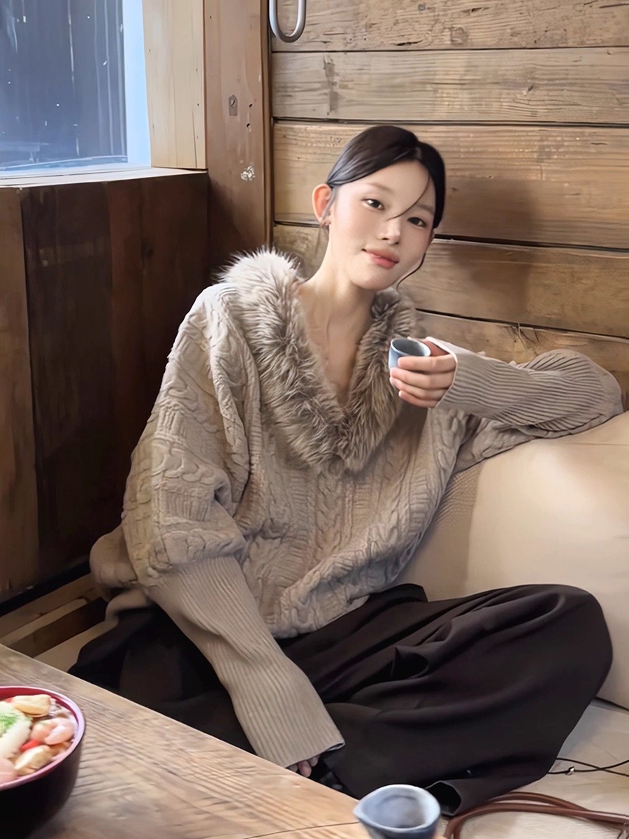 FA46259# 咖色毛毛V领套头蝙蝠袖毛衣女秋冬季内搭慵懒气质宽松针织衫上衣 服裝批發女裝批發服飾貨源