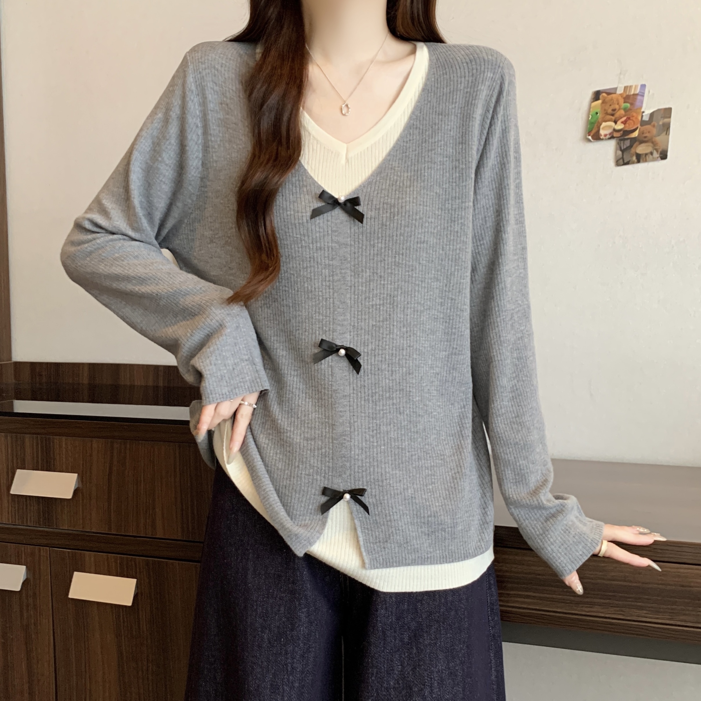 FA46265# 大码秋冬新款法式蝴蝶结假两件针织衫胖mm显瘦V领上衣 服裝批發女裝批發服飾貨源