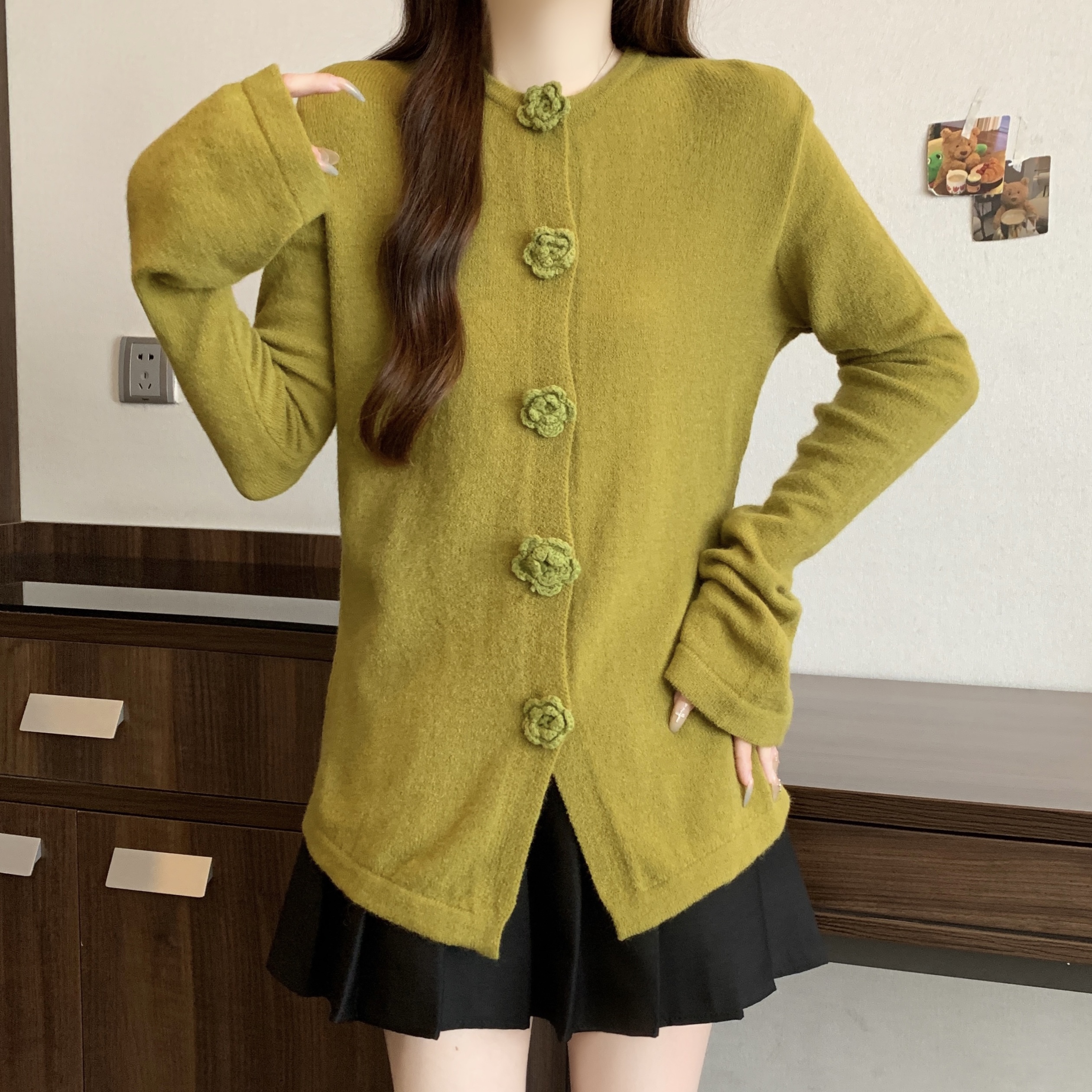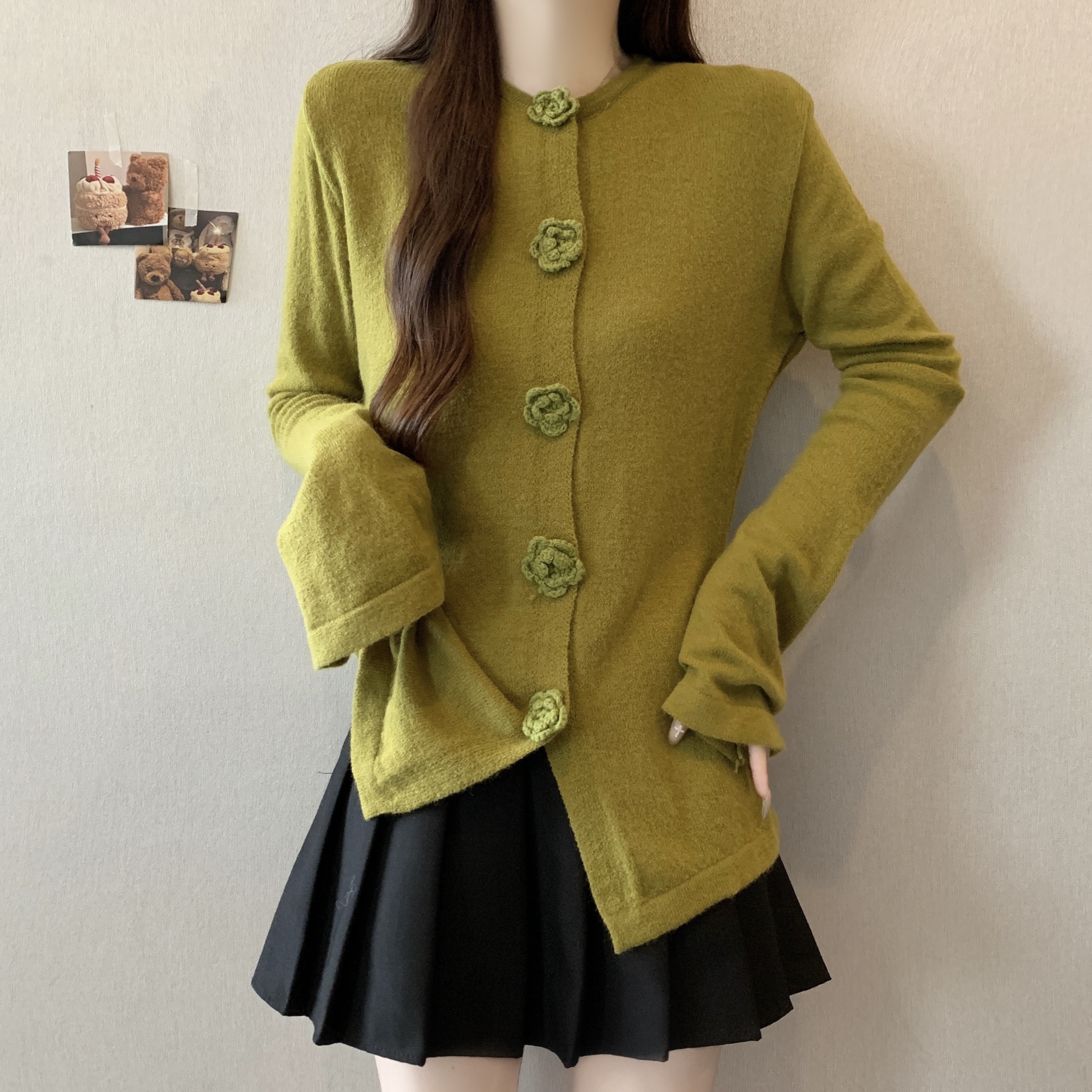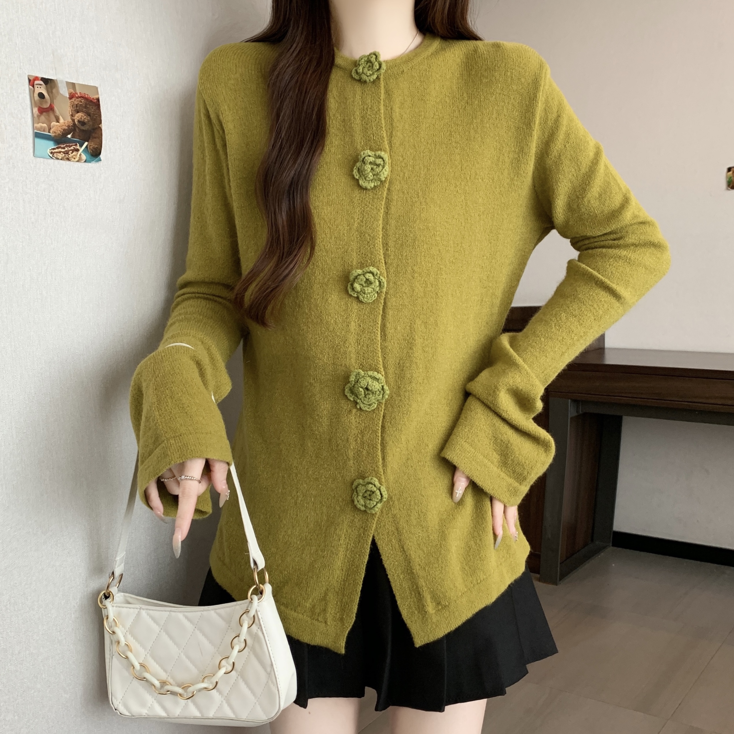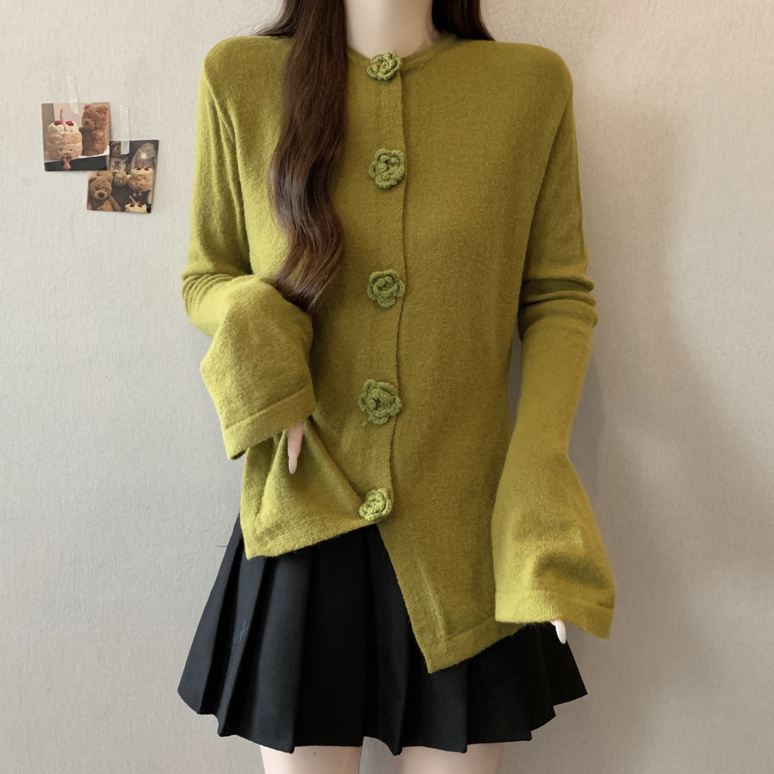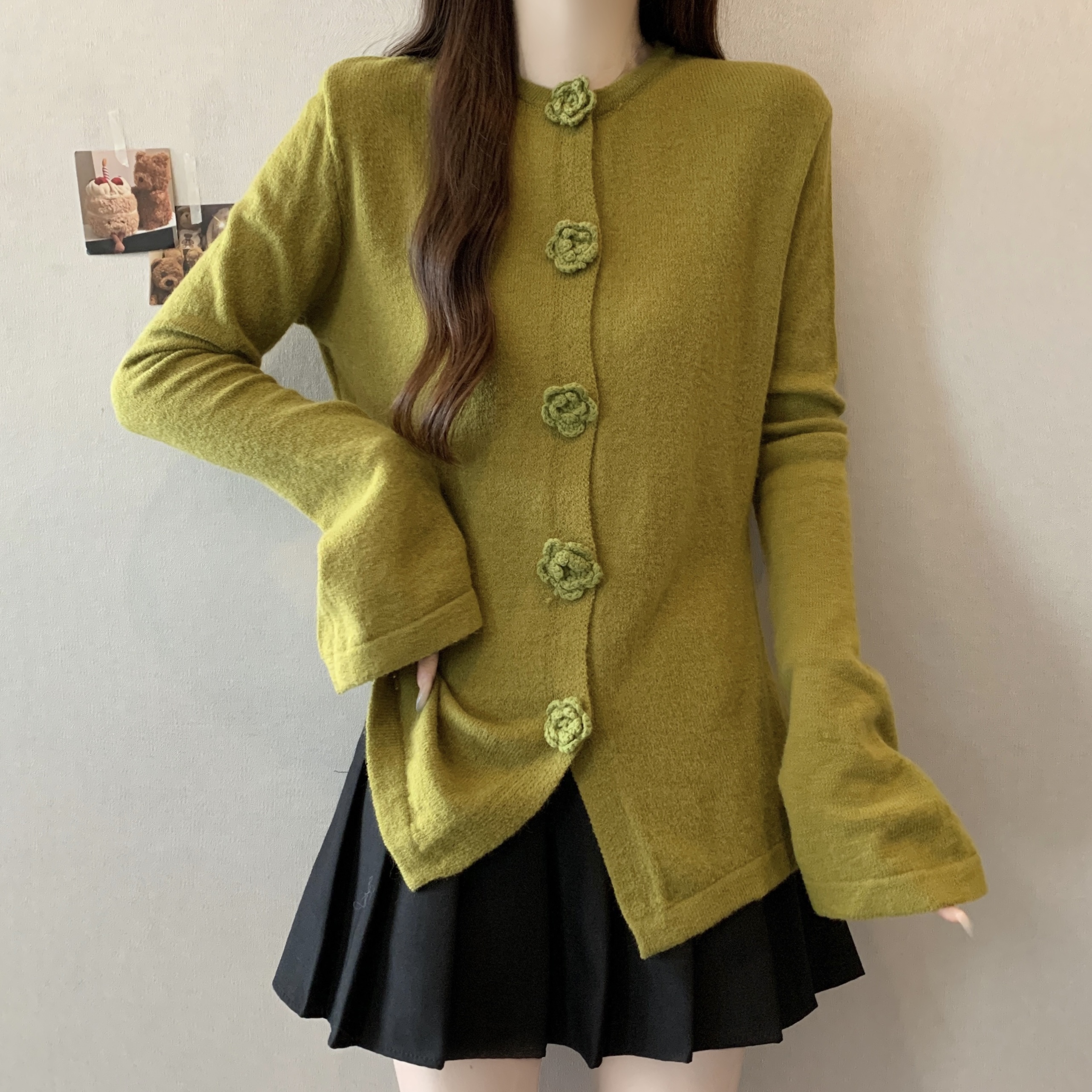 FA46268# 大码立体玫瑰花针织衫秋冬新款法式复古喇叭袖修身显瘦毛衣 服裝批發女裝批發服飾貨源