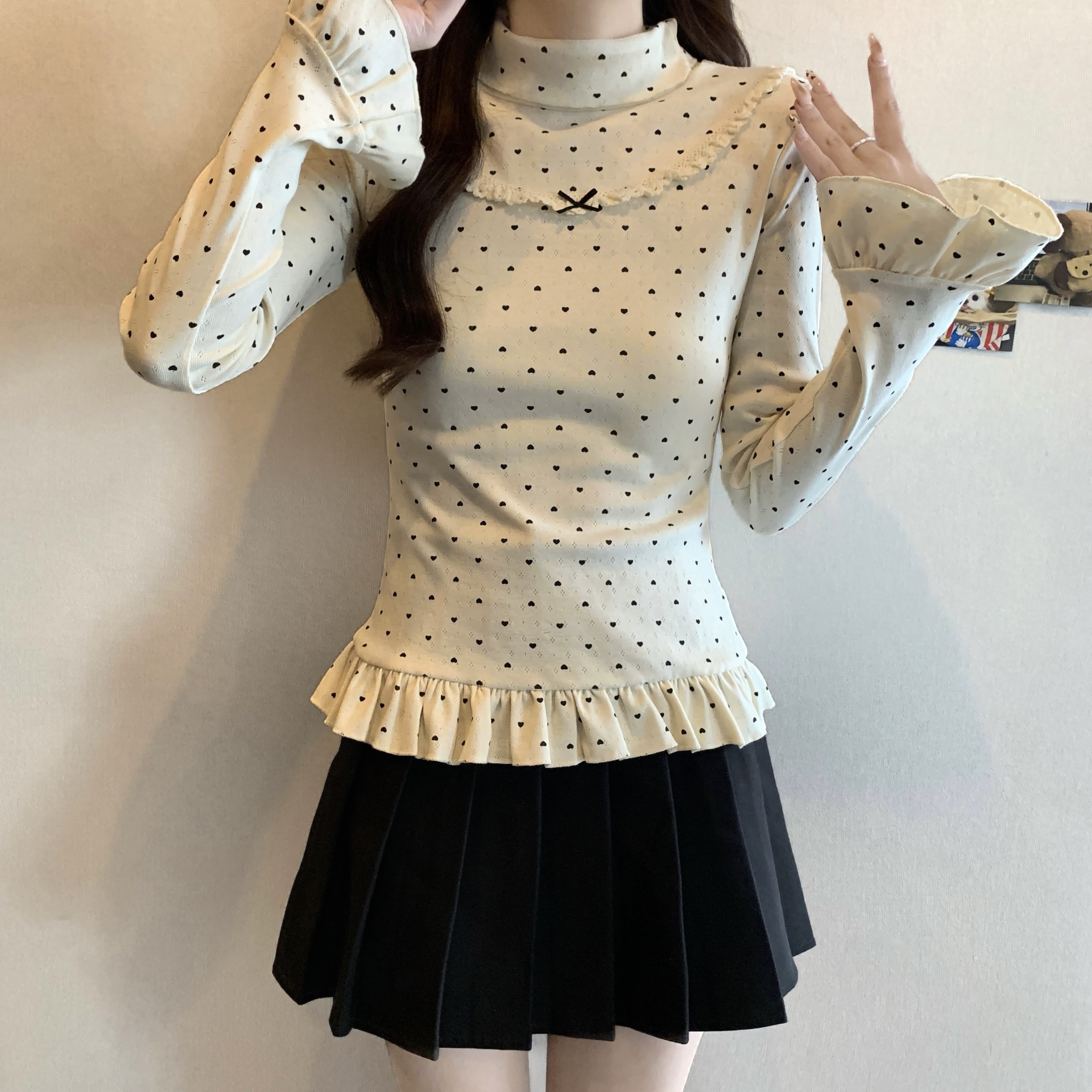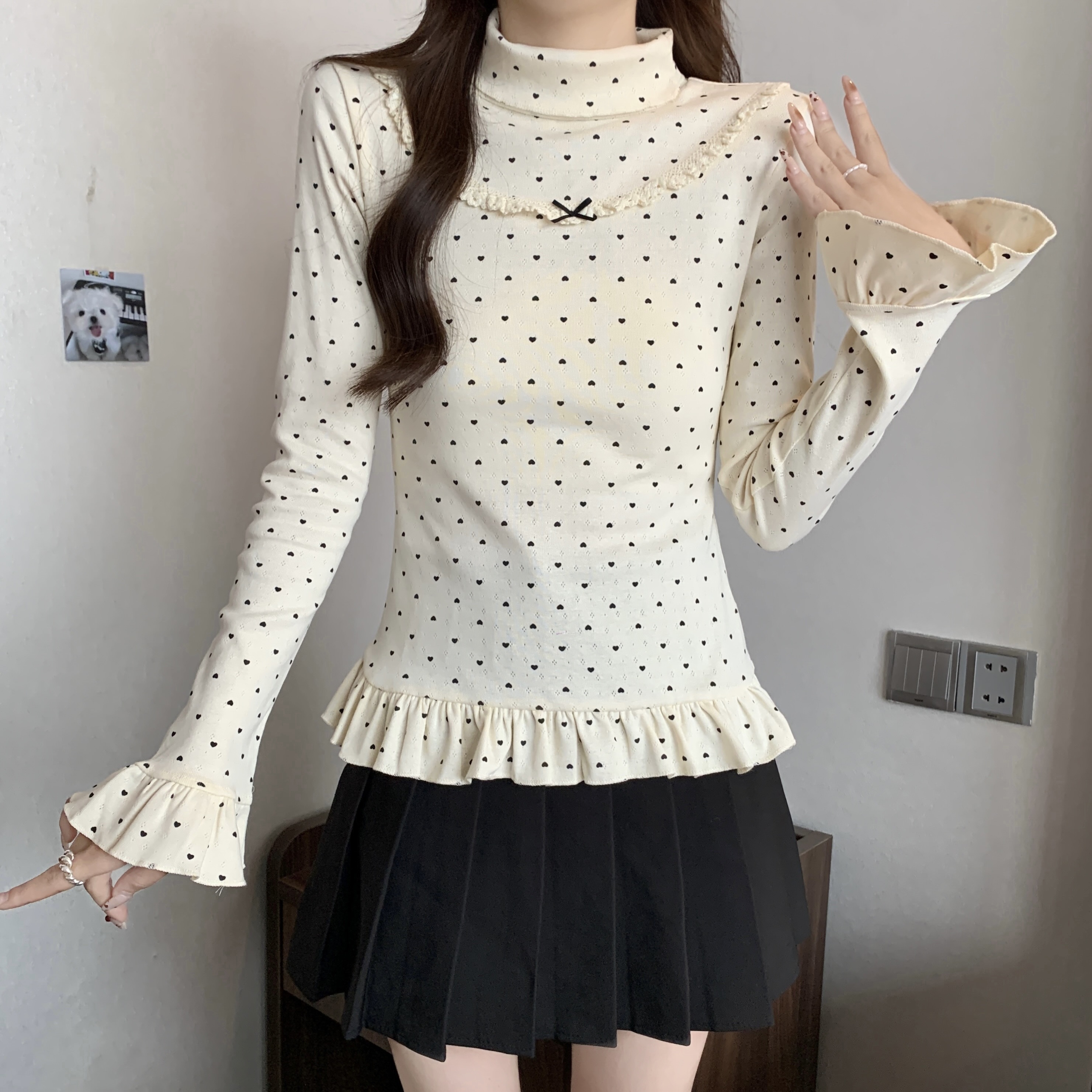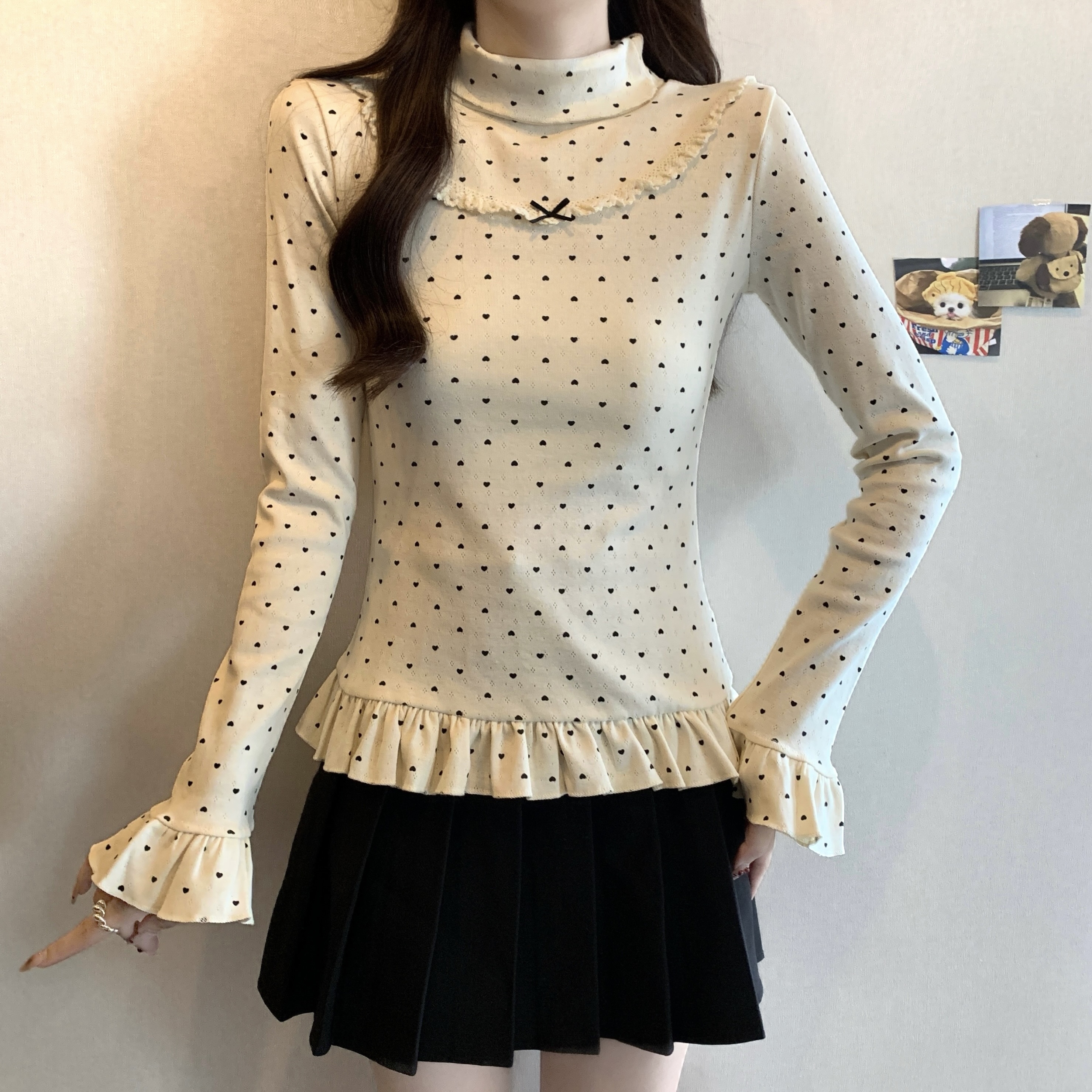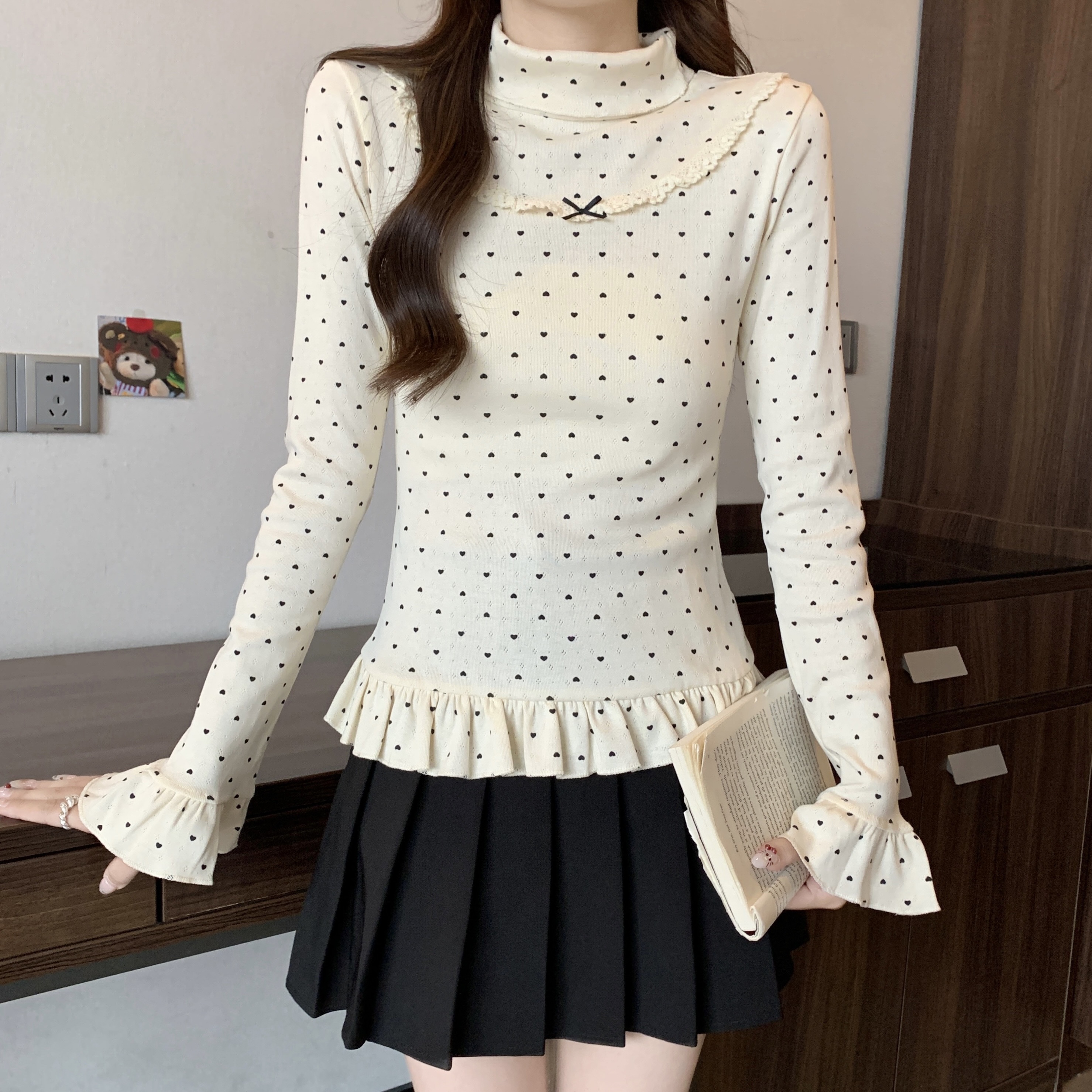 FA46384# 大码秋冬新款高领针织爱心波点蕾丝蝴蝶结荷叶边打底衫上衣 服裝批發女裝批發服飾貨源