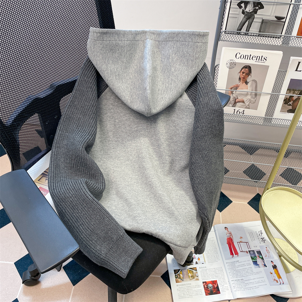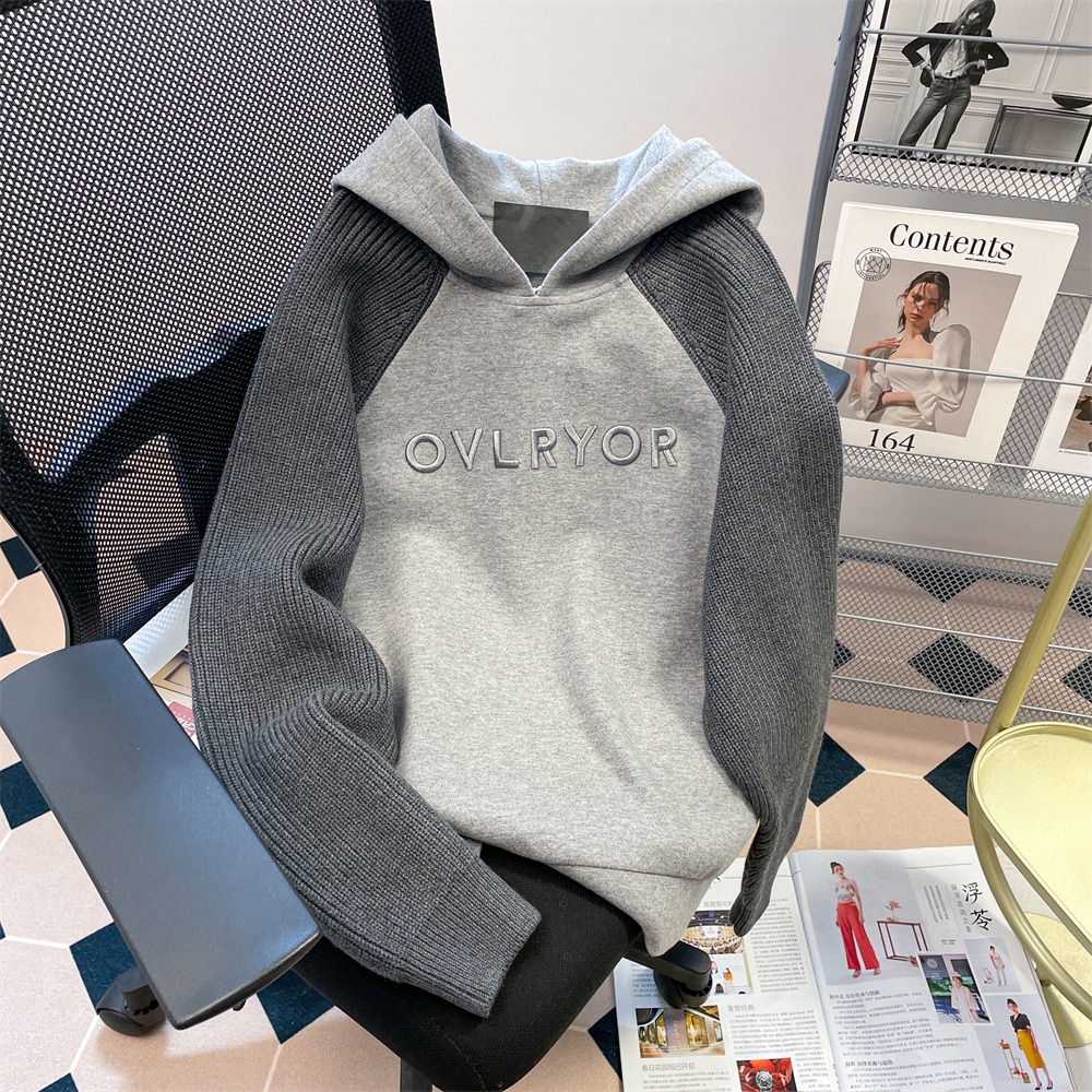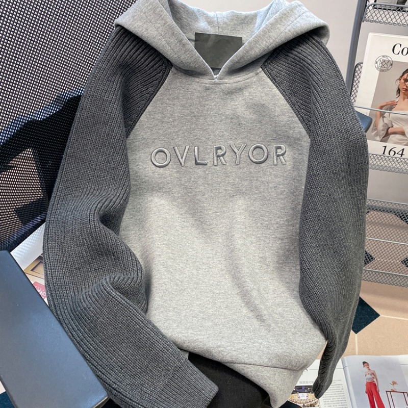 FA46830# 设计感小众字母刺绣撞色插肩卫衣女秋冬oversize加绒加厚连帽外套 服裝批發女裝批發服飾貨源