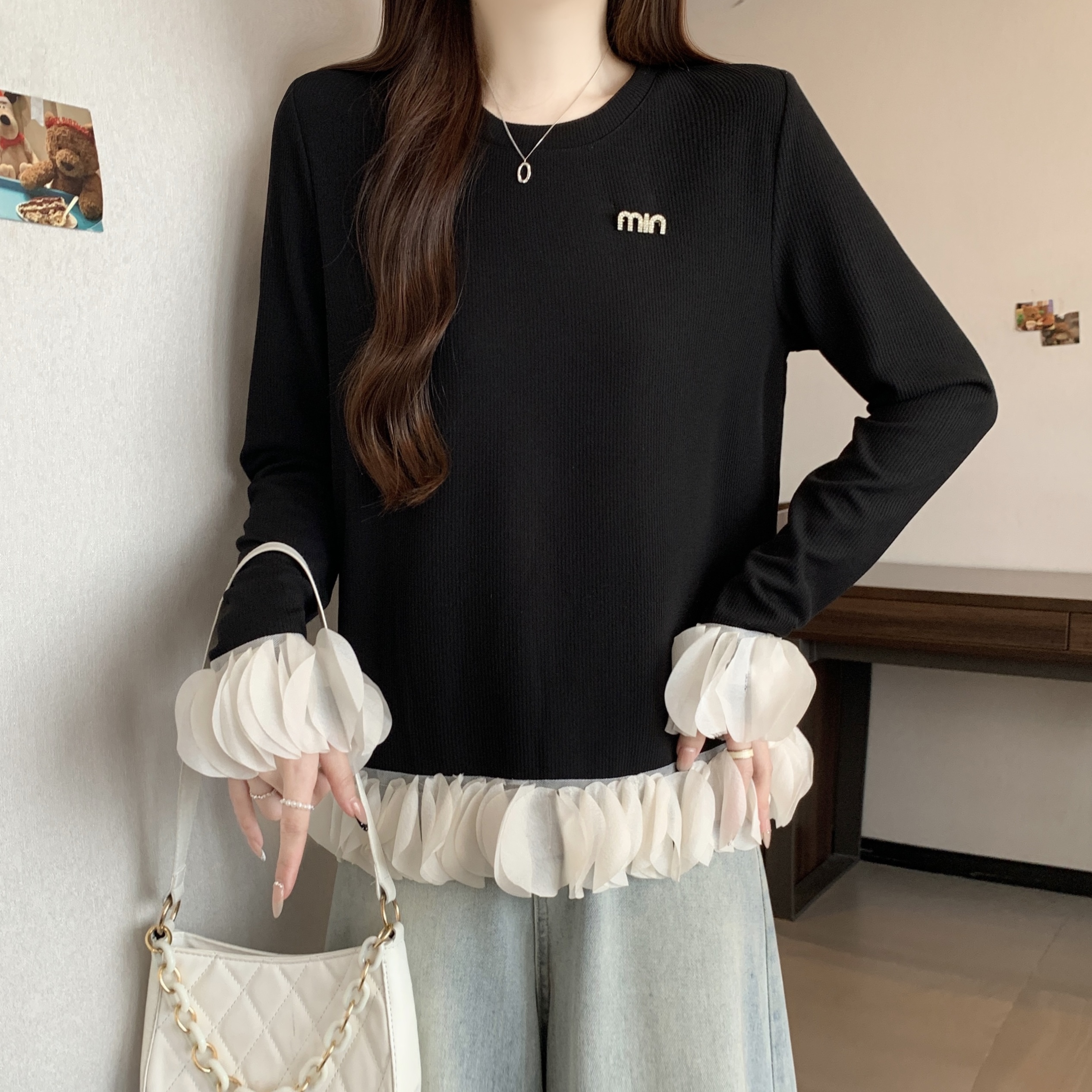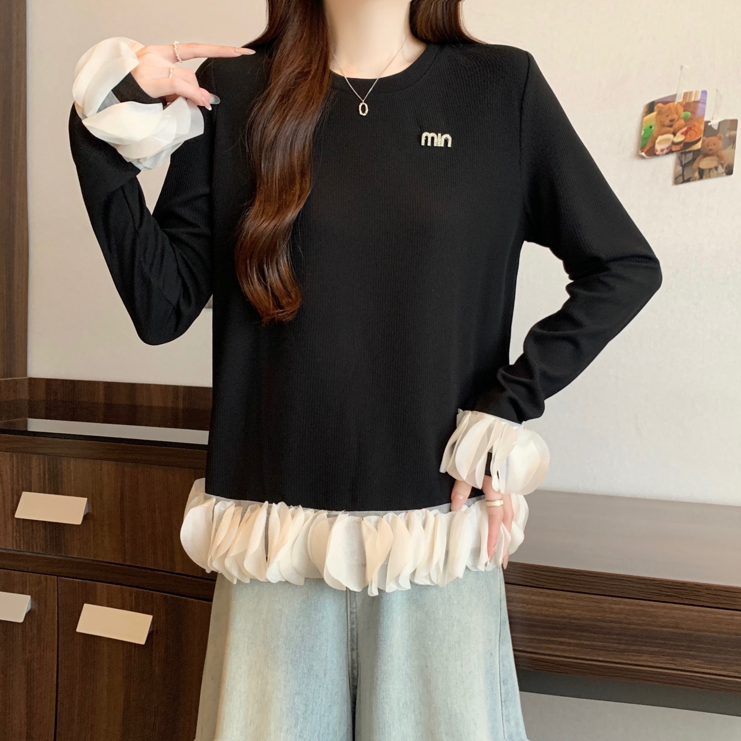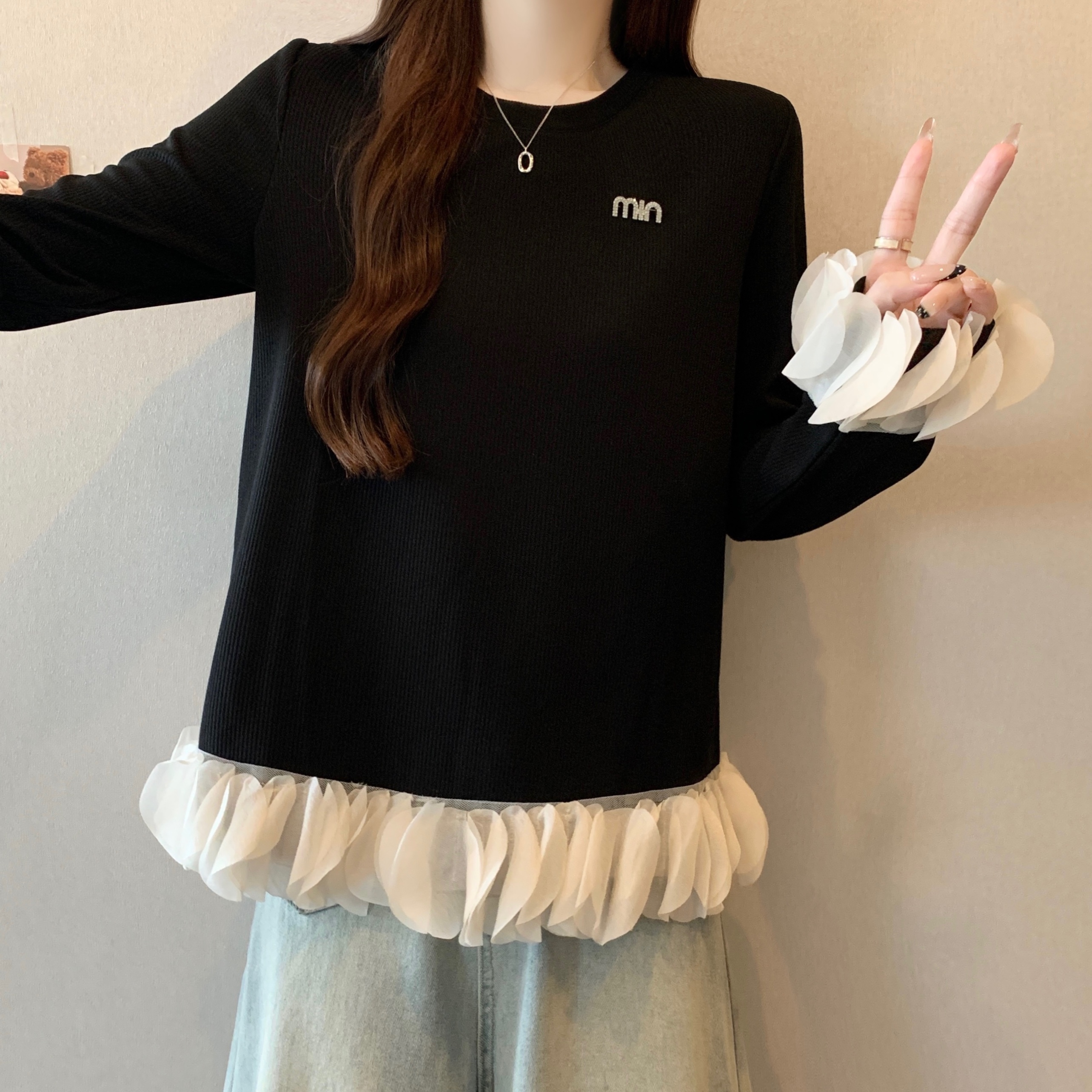 FA46833# 大码胖MM秋季新款拼接荷叶边针织衫女显瘦减龄百搭黑色上衣 服裝批發女裝批發服飾貨源