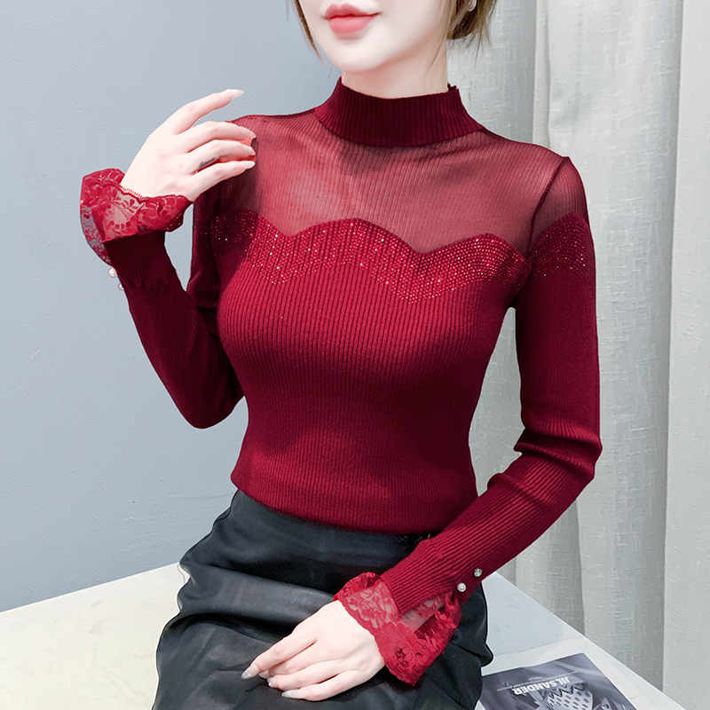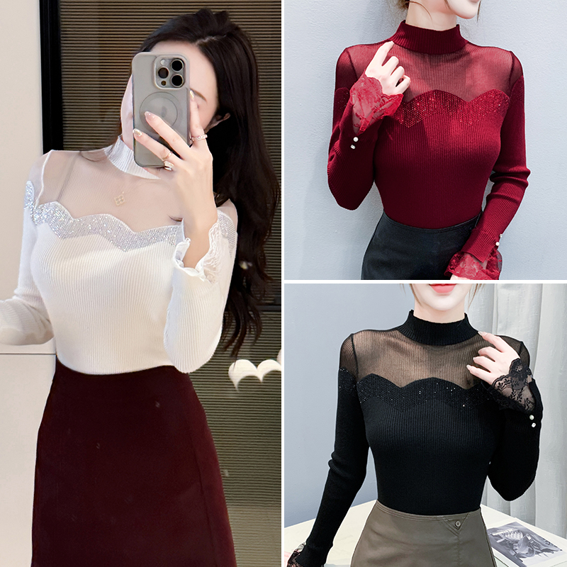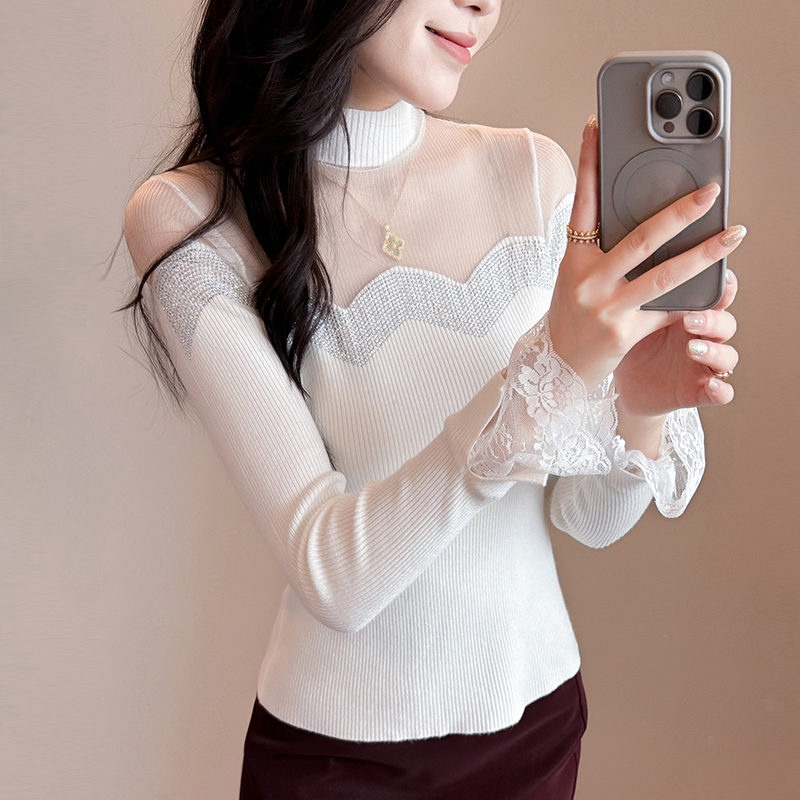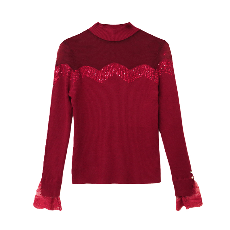 FA46837# 秋冬新款蕾丝长袖针织打底衫修身显瘦毛衣女百搭时髦洋气 服裝批發女裝批發服飾貨源