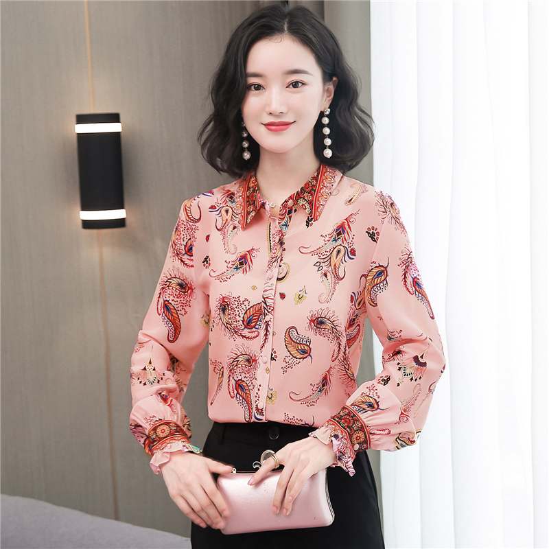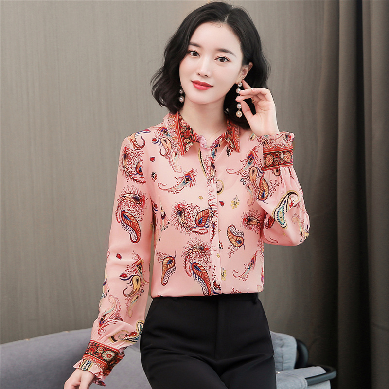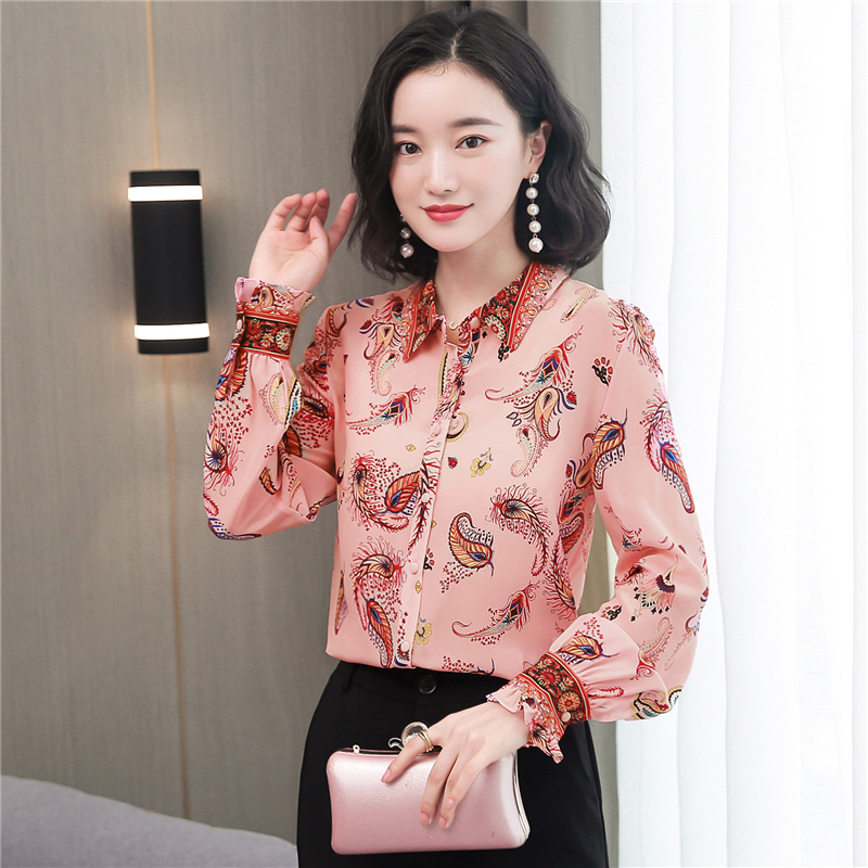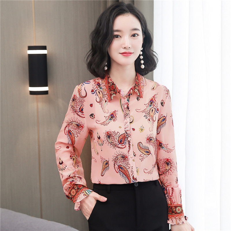 FA46862# 真丝衬衫女秋新款喇叭袖立领碎花设计感小众港风桑蚕丝上衣 服裝批發女裝批發服飾貨源