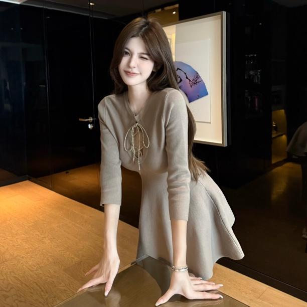 FA47016# 布月秋冬七分袖针织收腰纯欲设计感绑带性感A摆连衣裙 服裝批發女裝批發服飾貨源