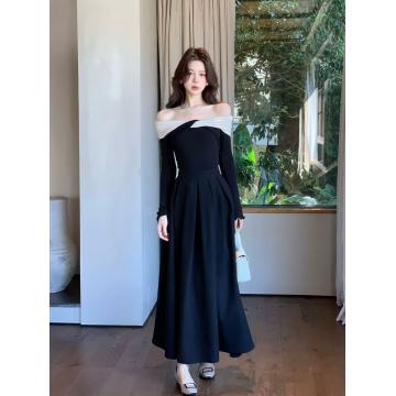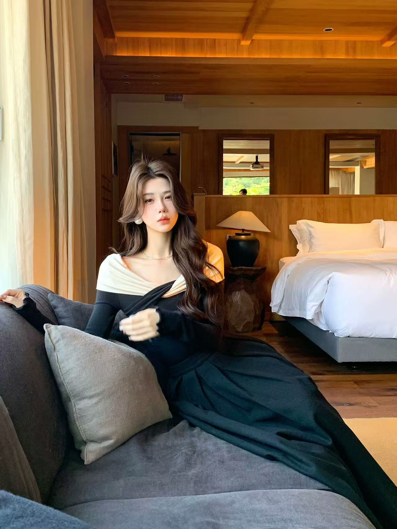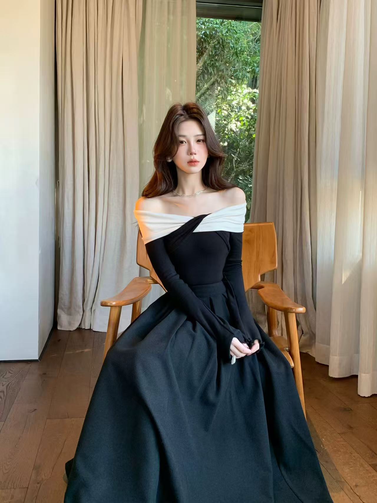 FA47019# 木子李的李设计感交叉领露肩长袖针织衫撞色修身上衣高腰半身裙秋 服裝批發女裝批發服飾貨源