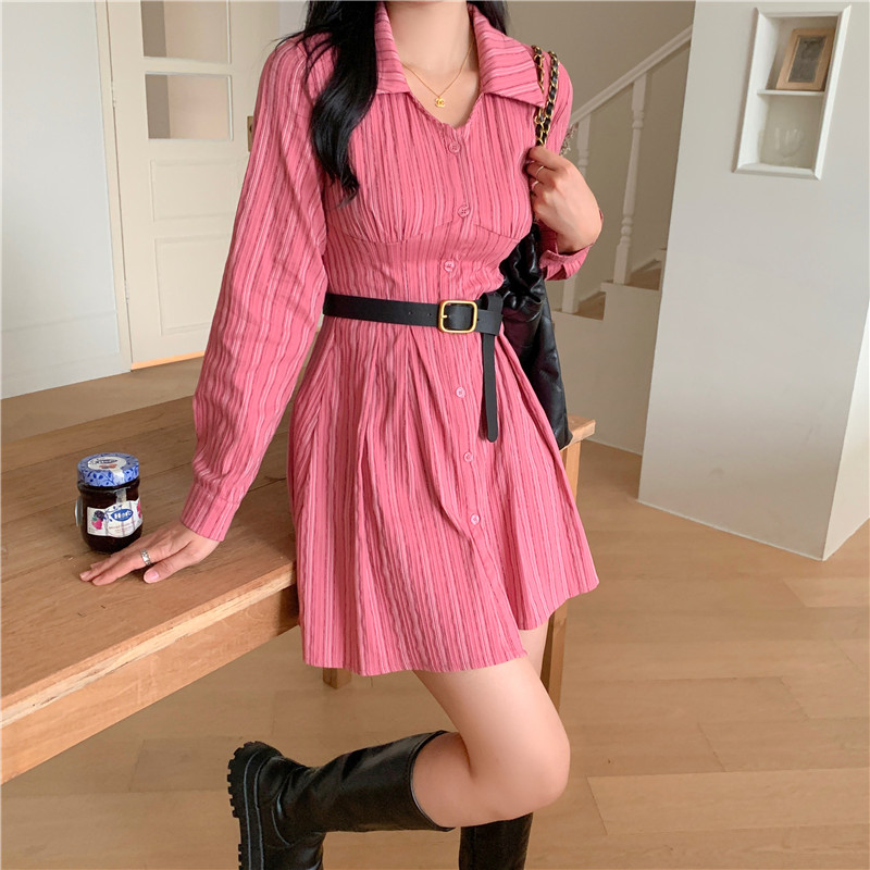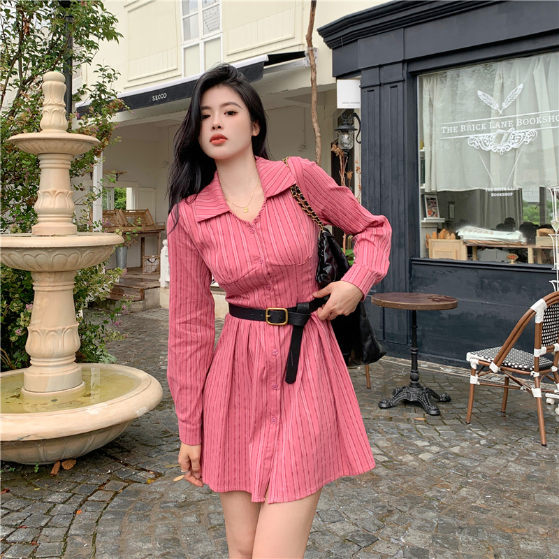 FA47121# 复古轻奢条纹长袖红色衬衫裙新款高级设计感胖妹妹收腰显瘦连衣裙 服裝批發女裝批發服飾貨源