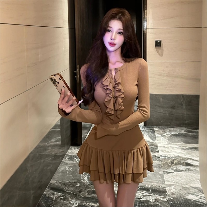 FA47126# 美拉德风焦糖色木耳边长袖蛋糕连衣裙女秋季新款收腰显瘦气质短裙 服裝批發女裝批發服飾貨源