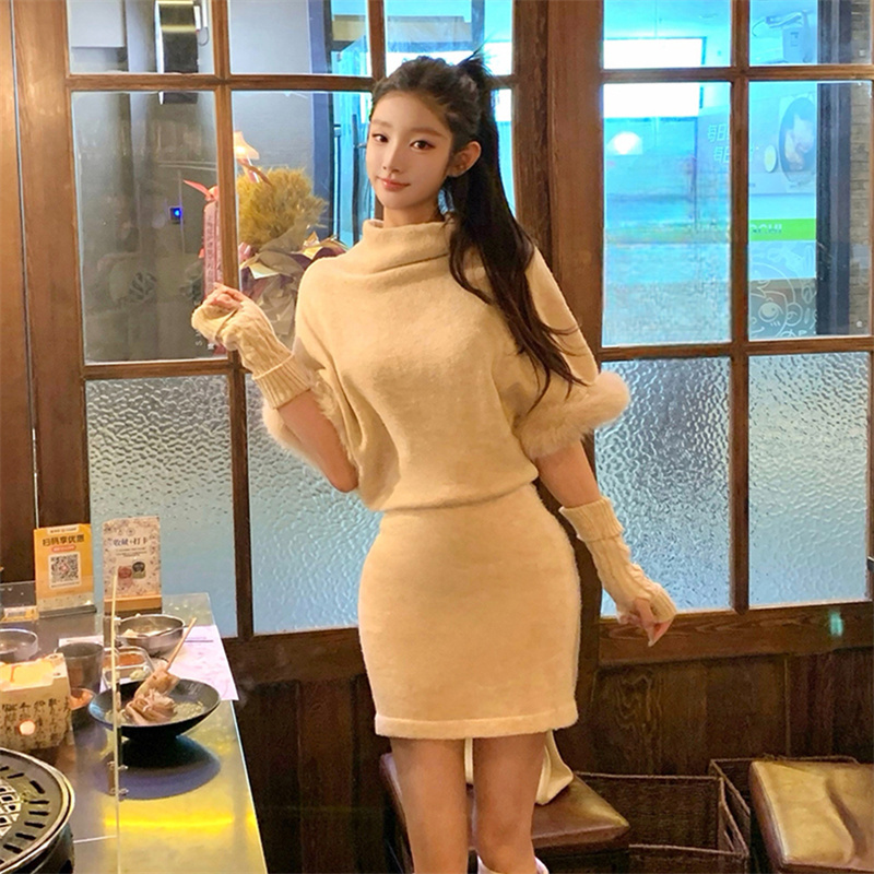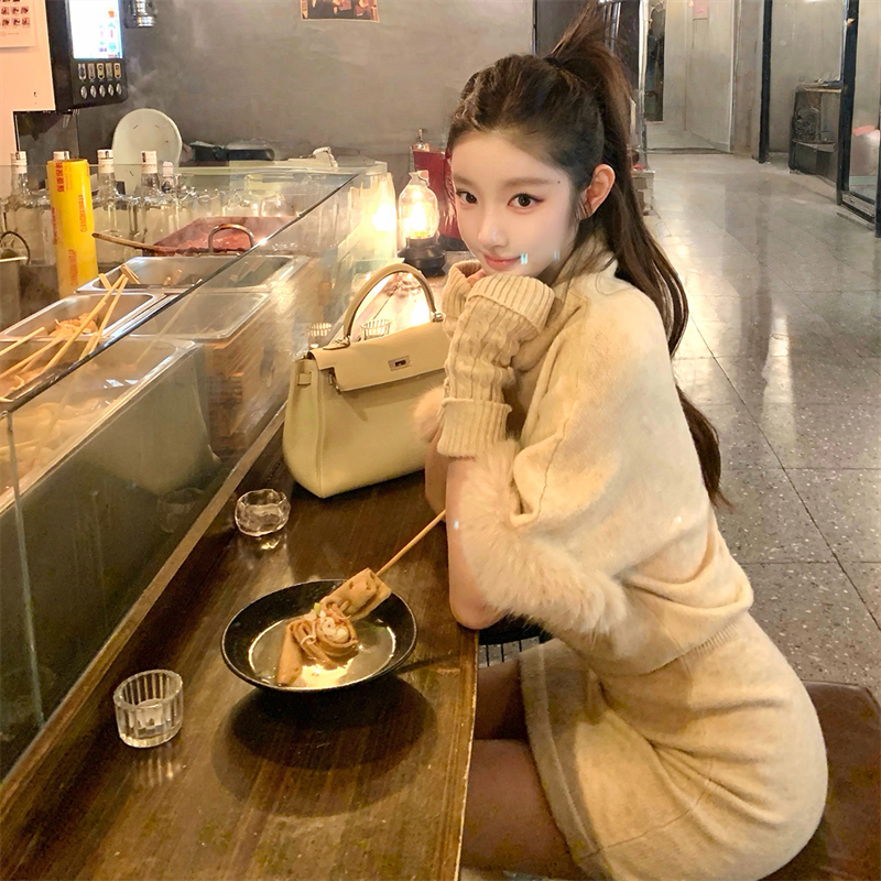 FA47138# 热狗很辣巴斯奶兔仿真狐狸毛荡领连衣裙女送针织手套 服裝批發女裝批發服飾貨源