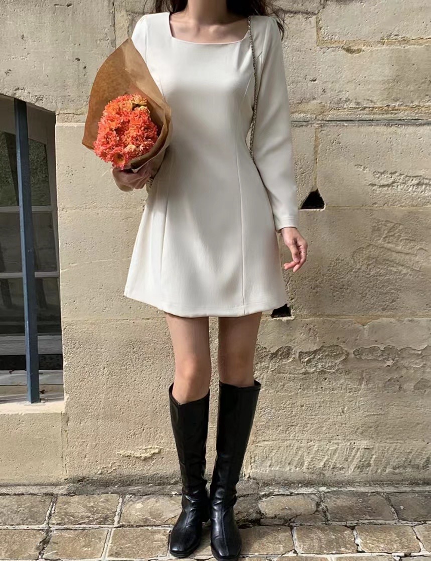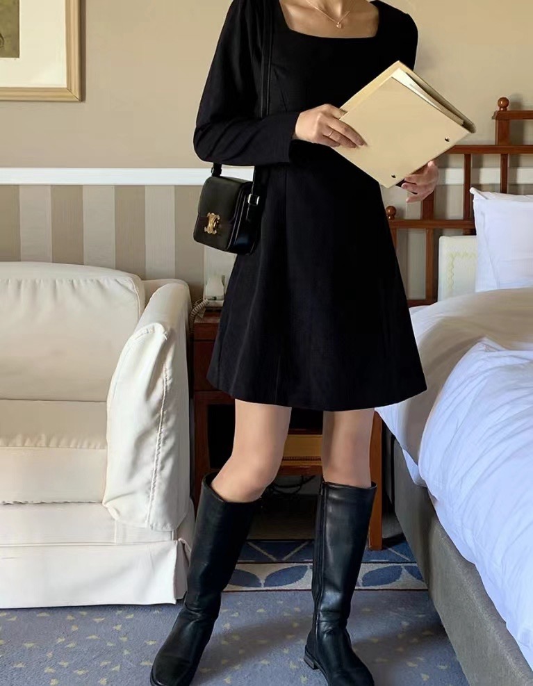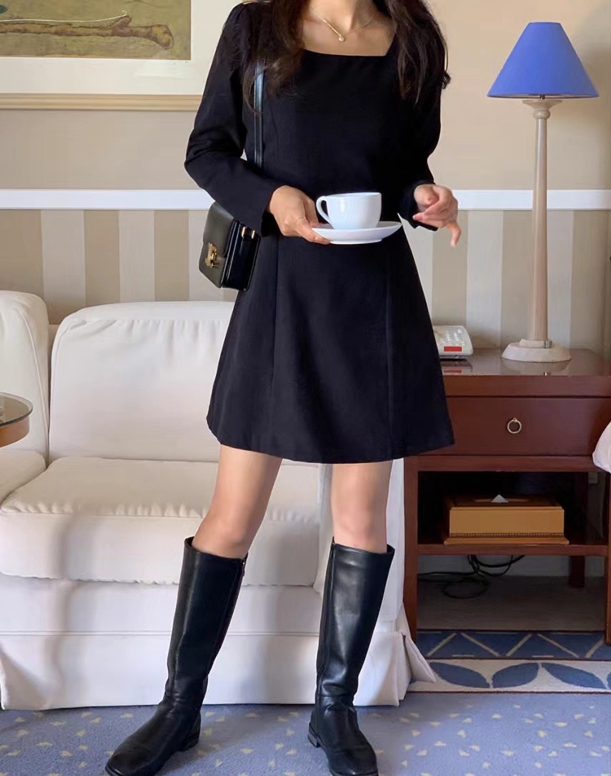 FA47139# 韩国东大门秋新款方领收腰纯色中长款连衣裙短裙 服裝批發女裝批發服飾貨源