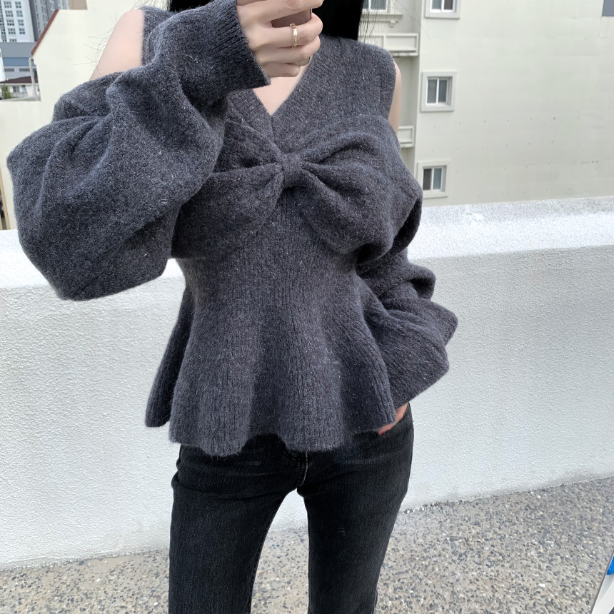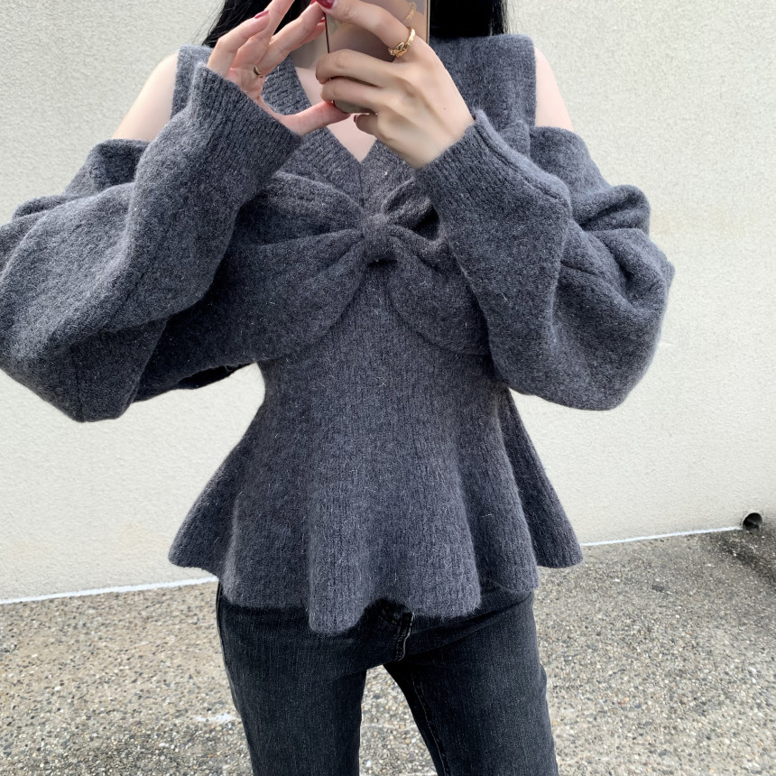 FA47172# 韩版时尚个性设计感慵懒氛围感穿搭灰色蝴蝶结毛衣上衣 服裝批發女裝批發服飾貨源