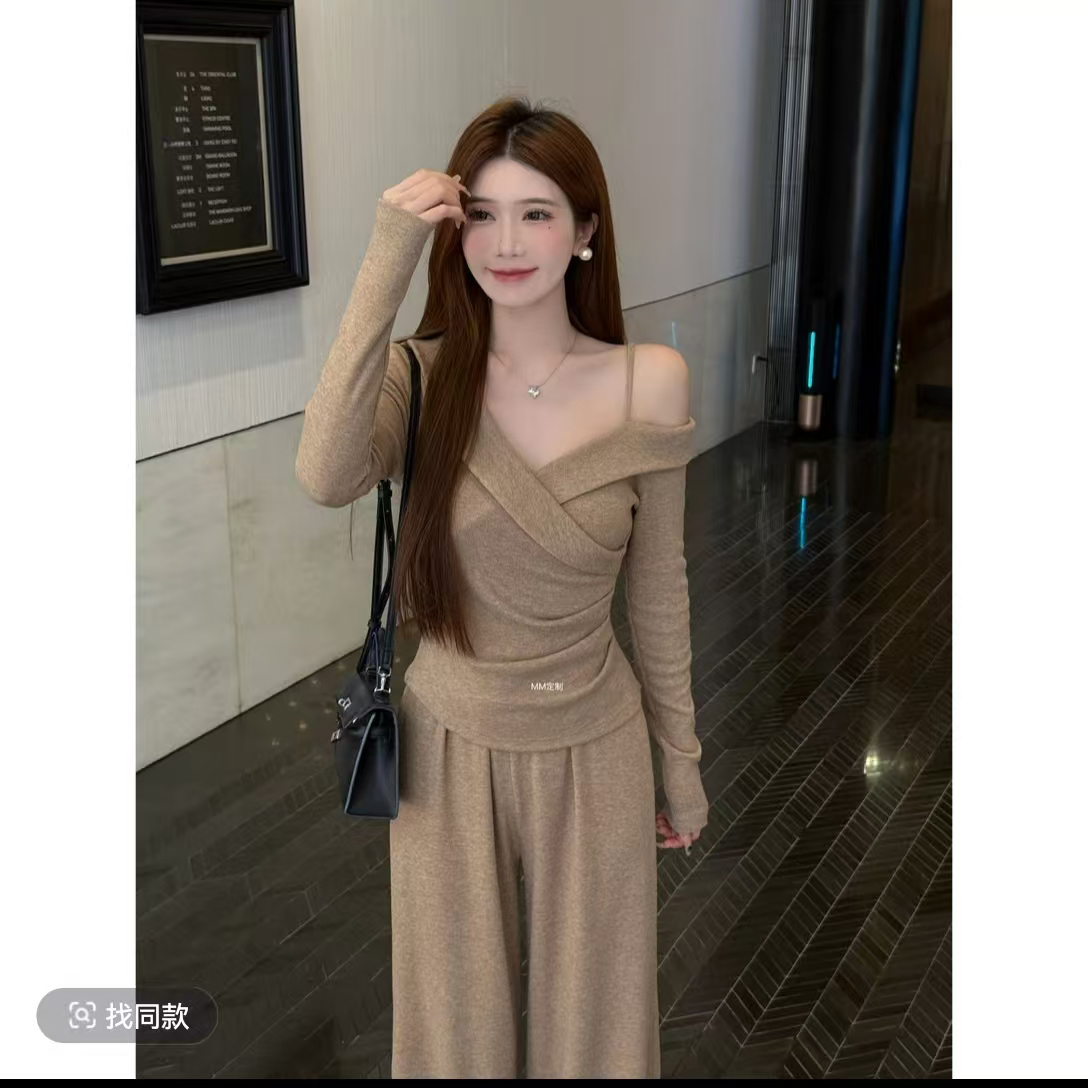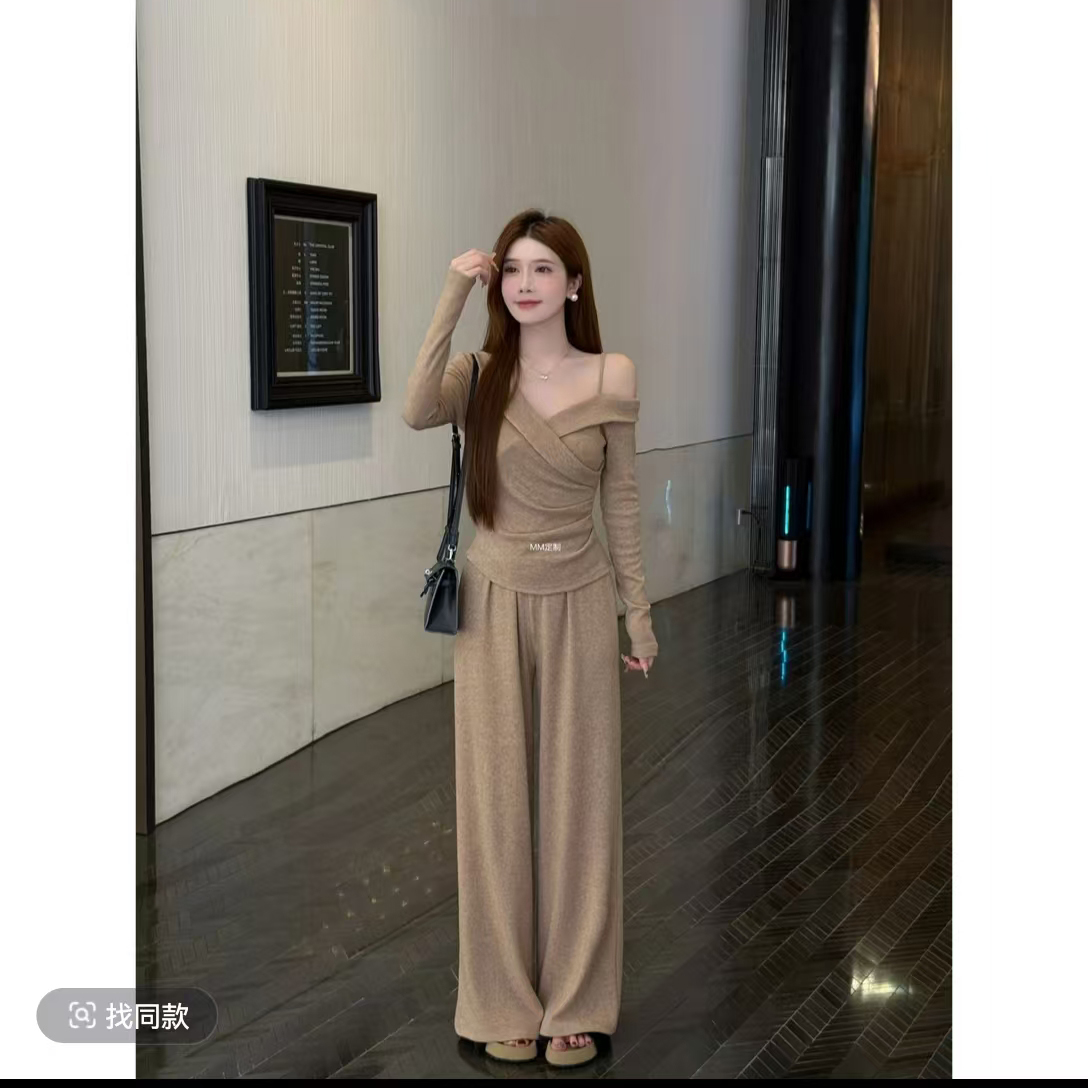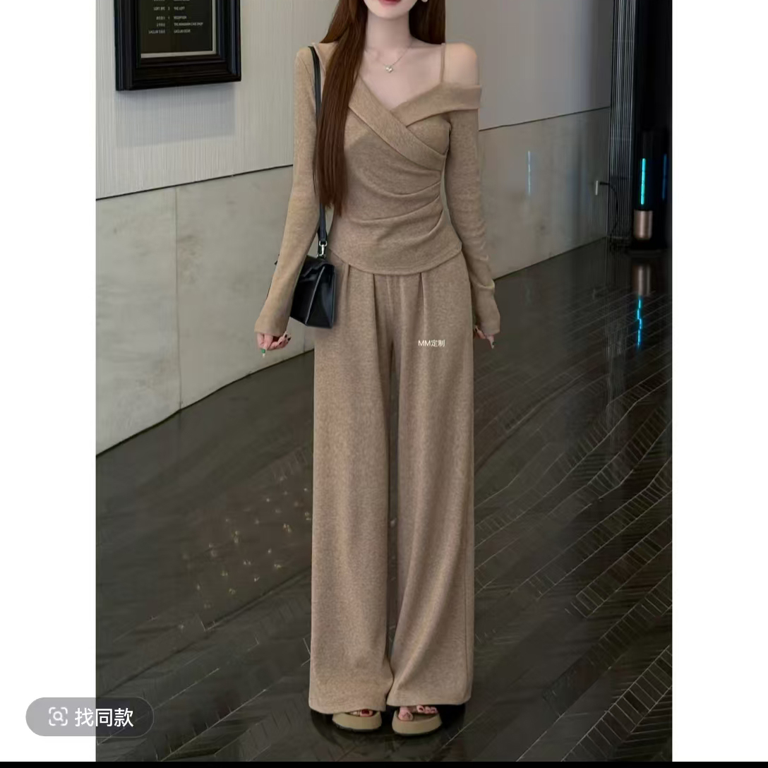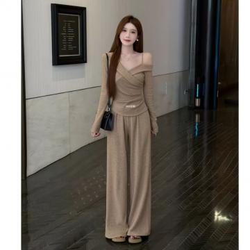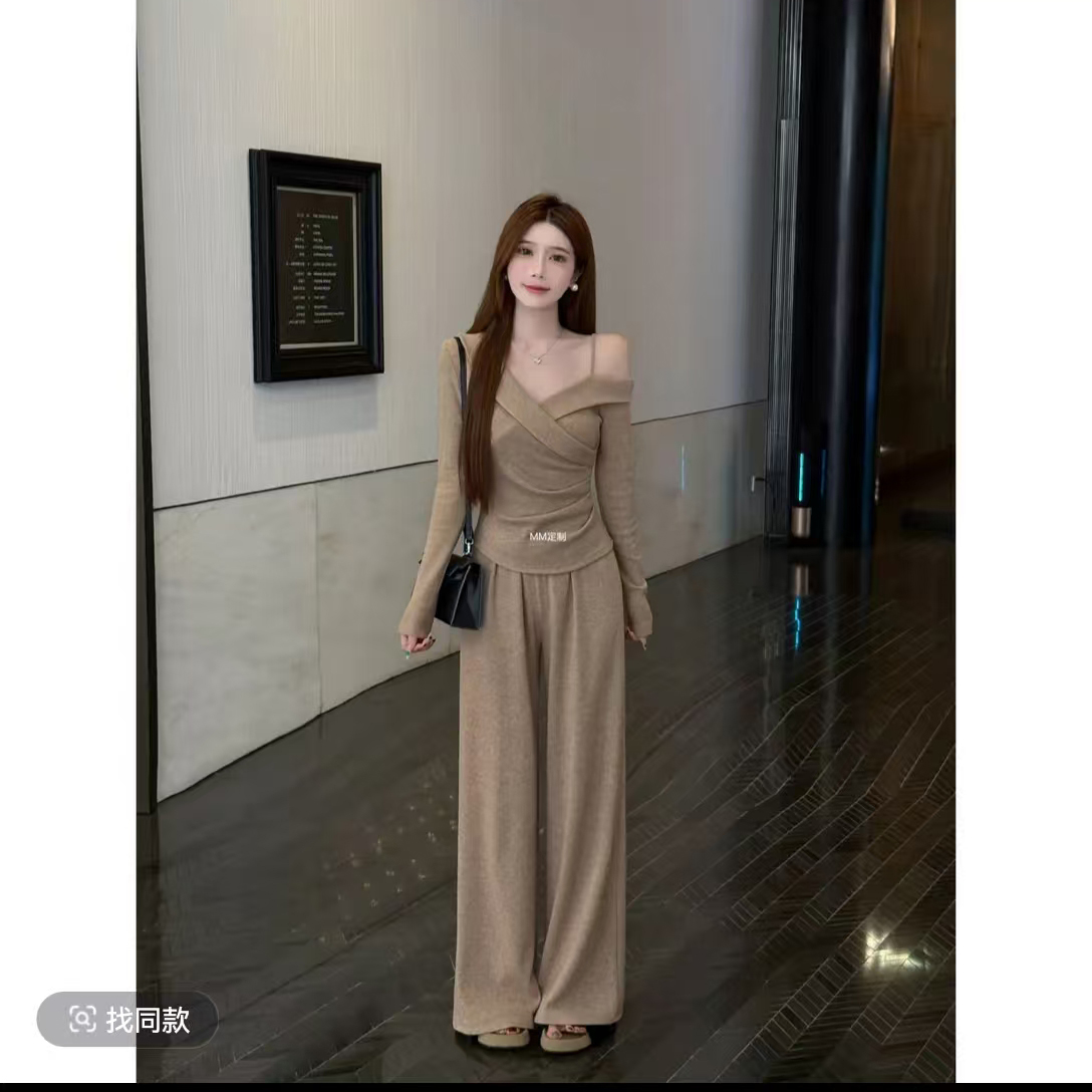 FA47178# 香肩捕手温柔包裹不对称交叉斜领打褶上衣直筒显瘦裤子套装 服裝批發女裝批發服飾貨源