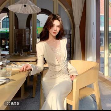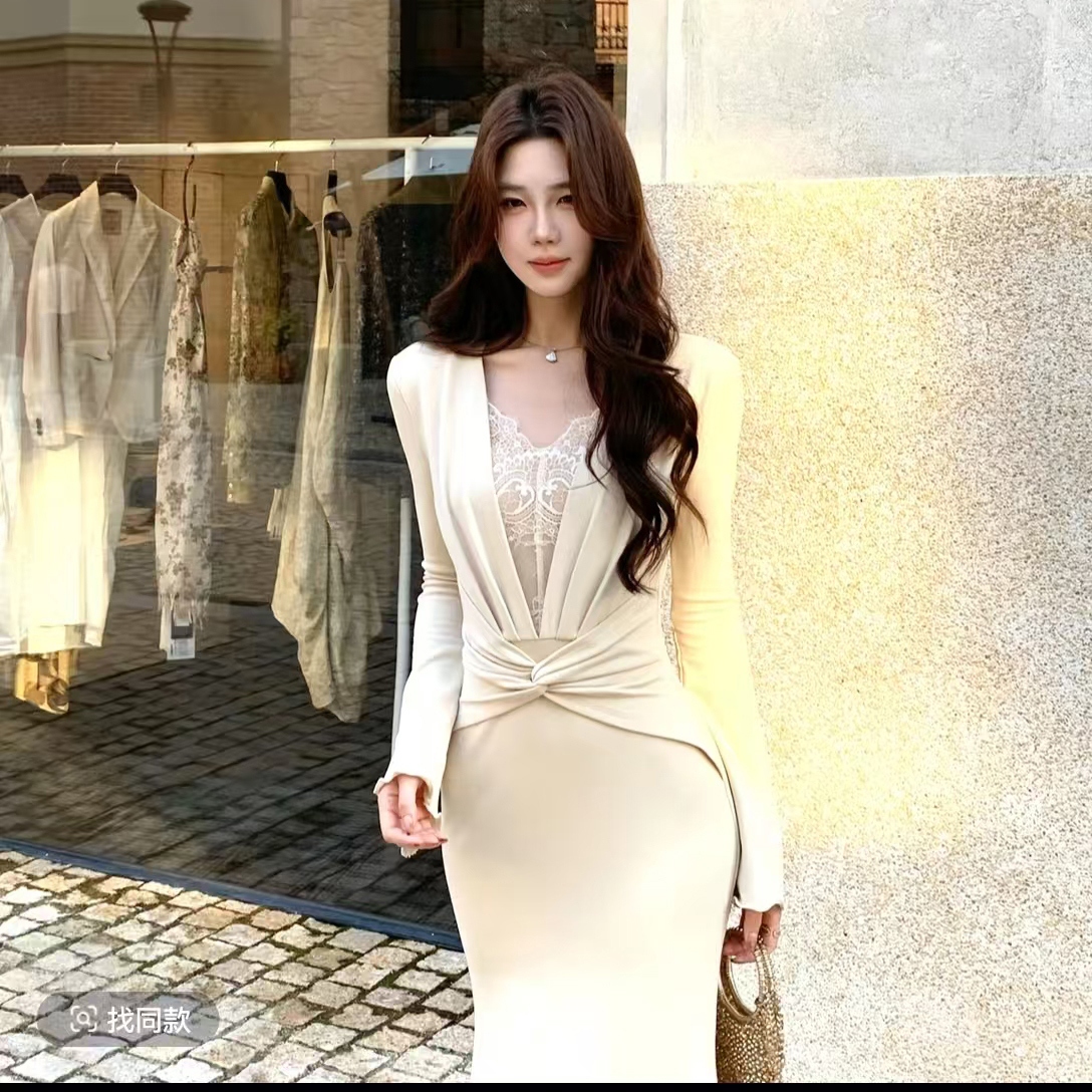 FA47181# 木子李的李柔蕾奢裁设计感针织蕾丝花边深V领扭结收腰连衣裙 服裝批發女裝批發服飾貨源