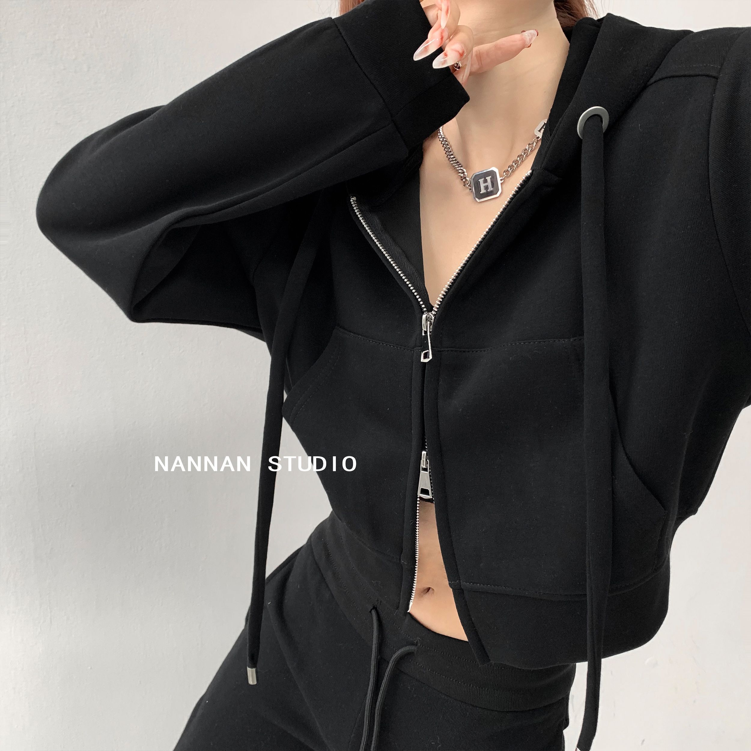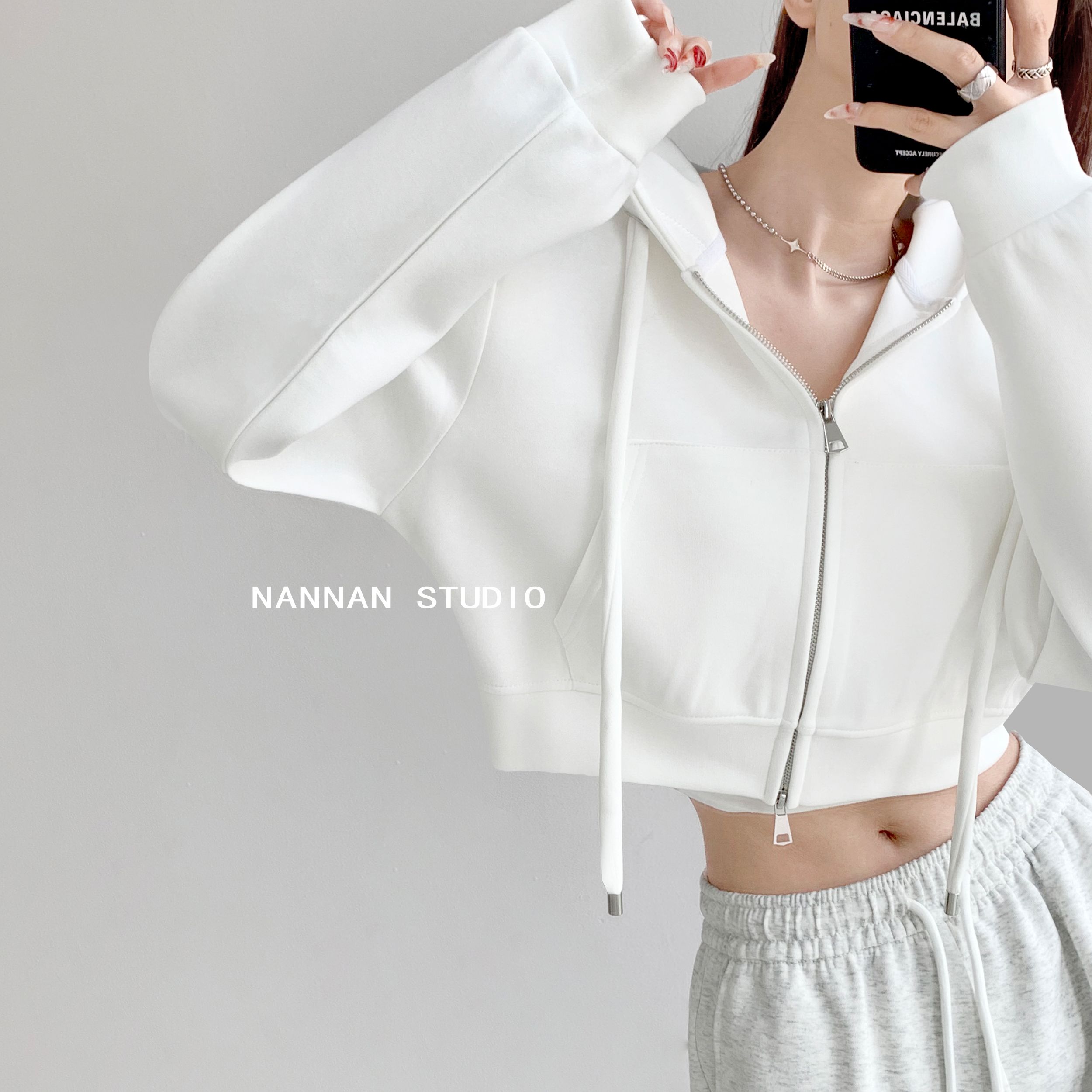 FA47183# 韩国东大门拉链短款露脐插兜帽衫女春秋宽松拉链连帽卫衣 服裝批發女裝批發服飾貨源