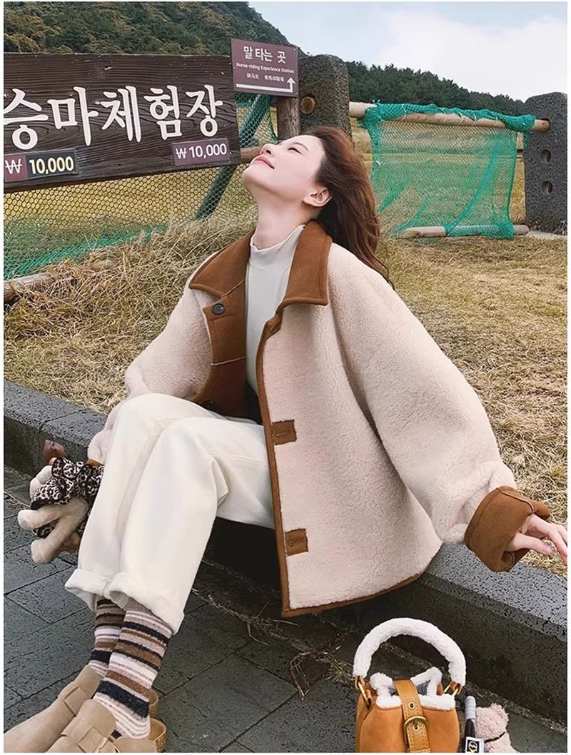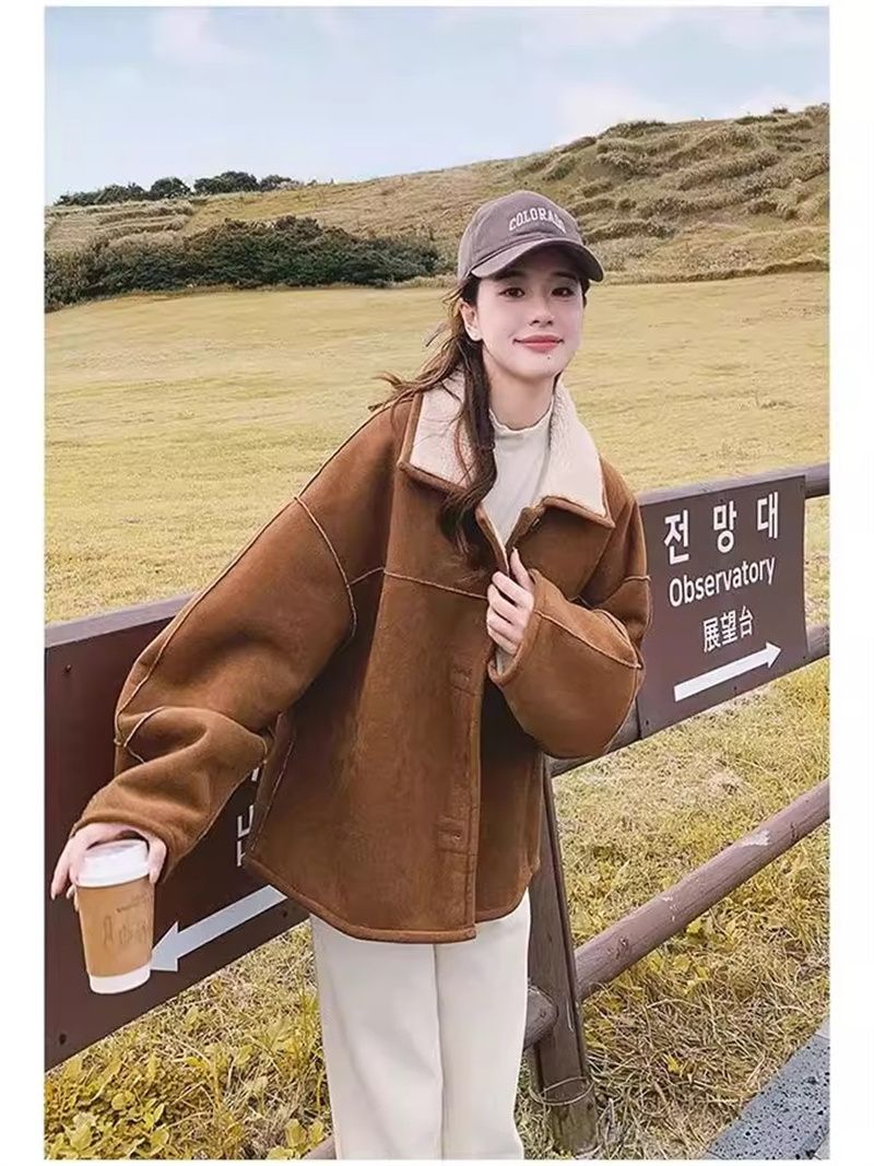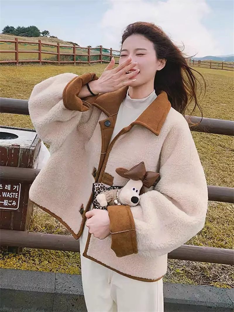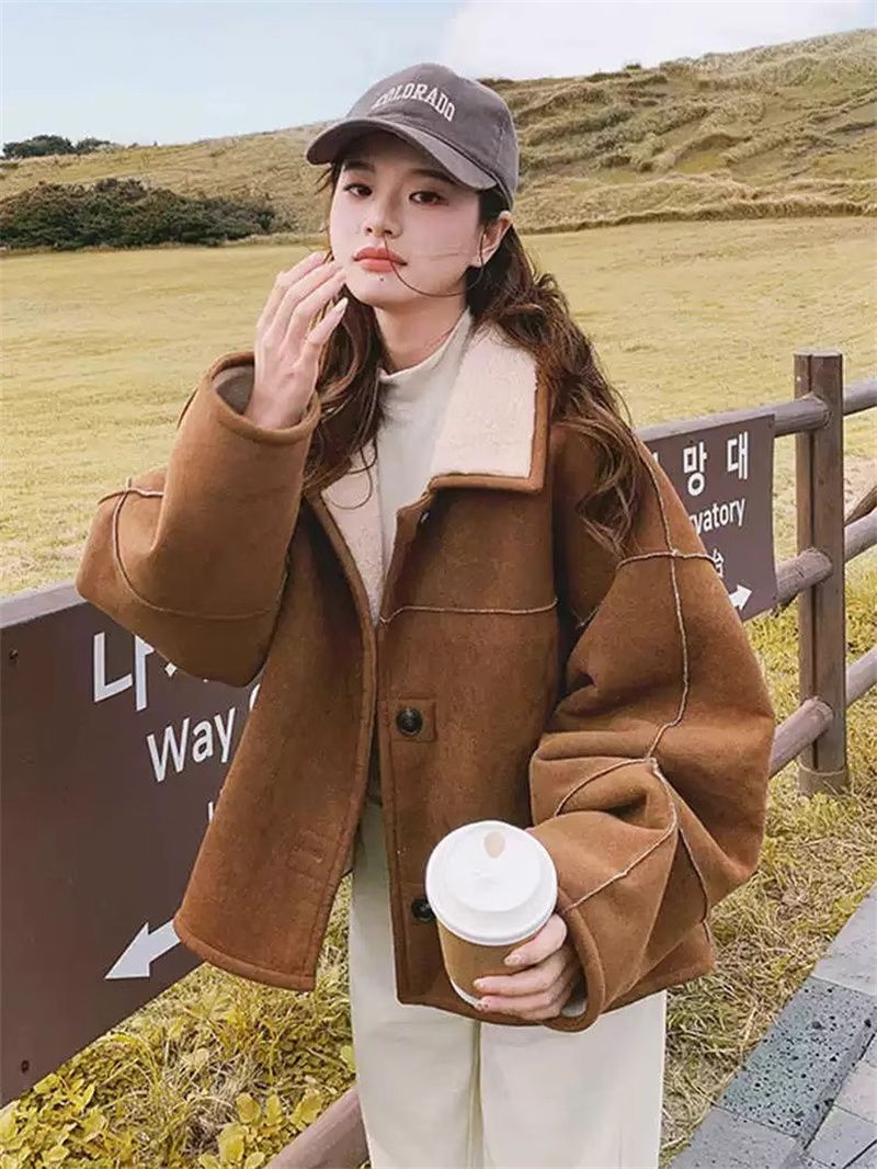 FA47191# 牛角扣麂皮绒羊羔毛外套女冬新款小个子皮毛一体短款加厚棉衣 服裝批發女裝批發服飾貨源