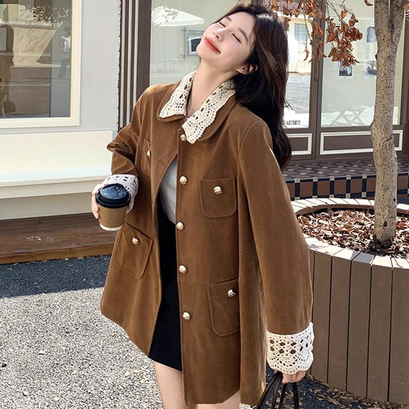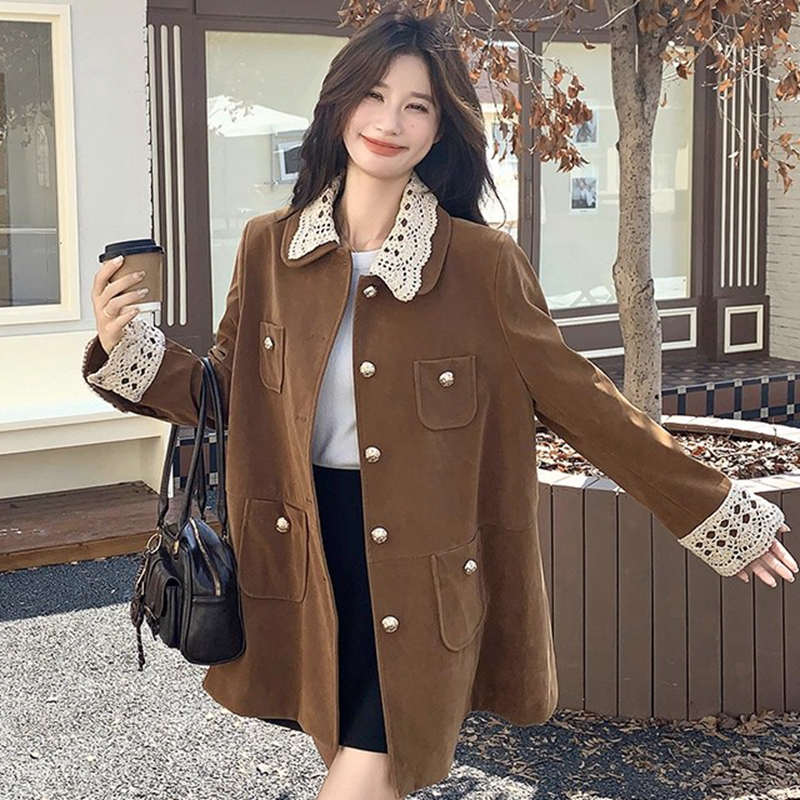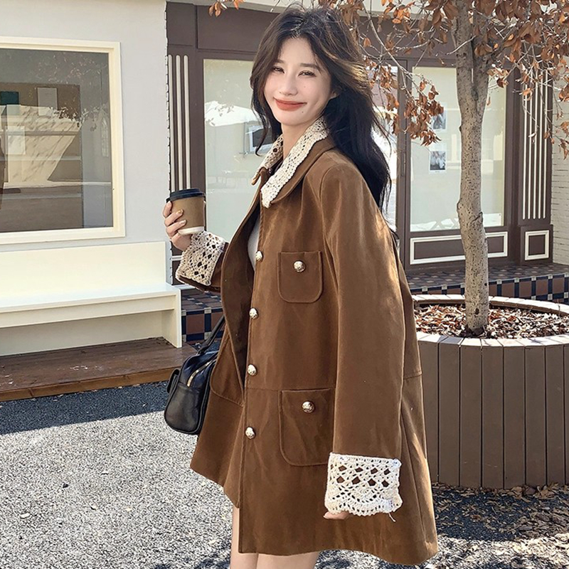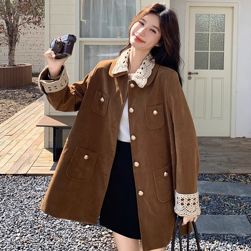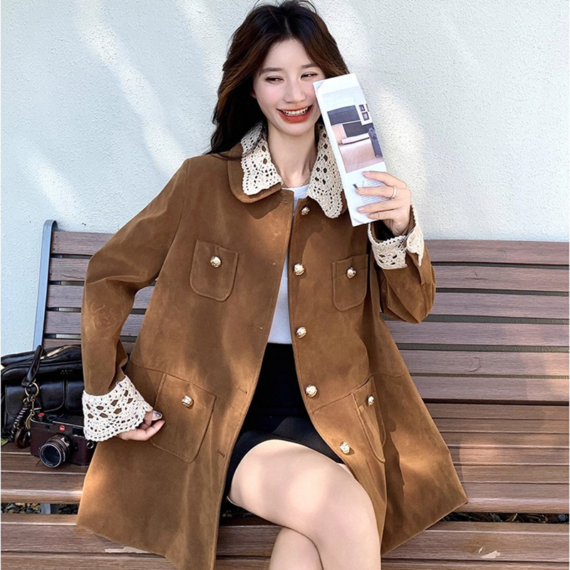 FA47193# 原版有内里复古翻领中长款麂皮/丝绒外套工装风衣美拉德穿搭风衣 服裝批發女裝批發服飾貨源