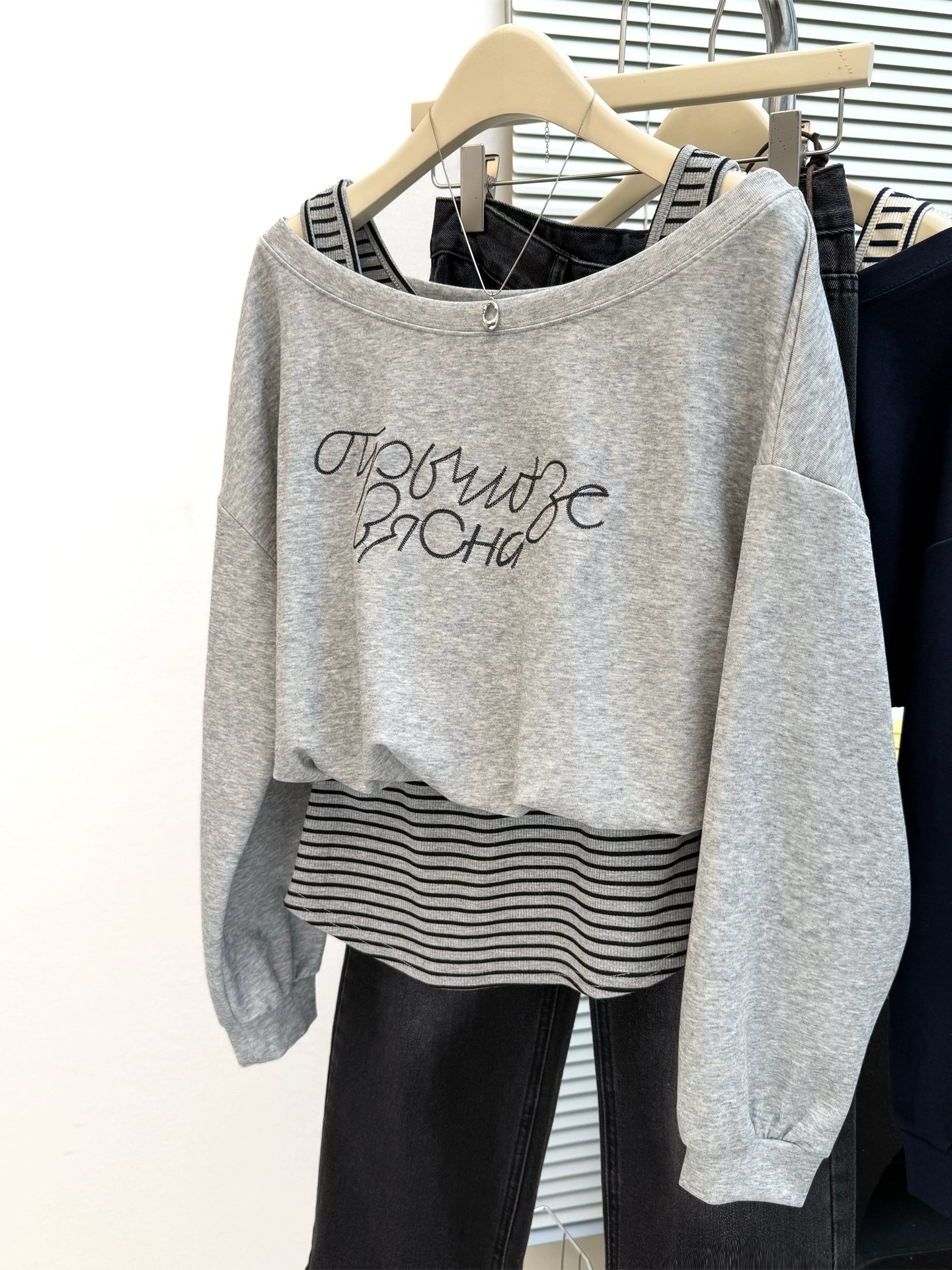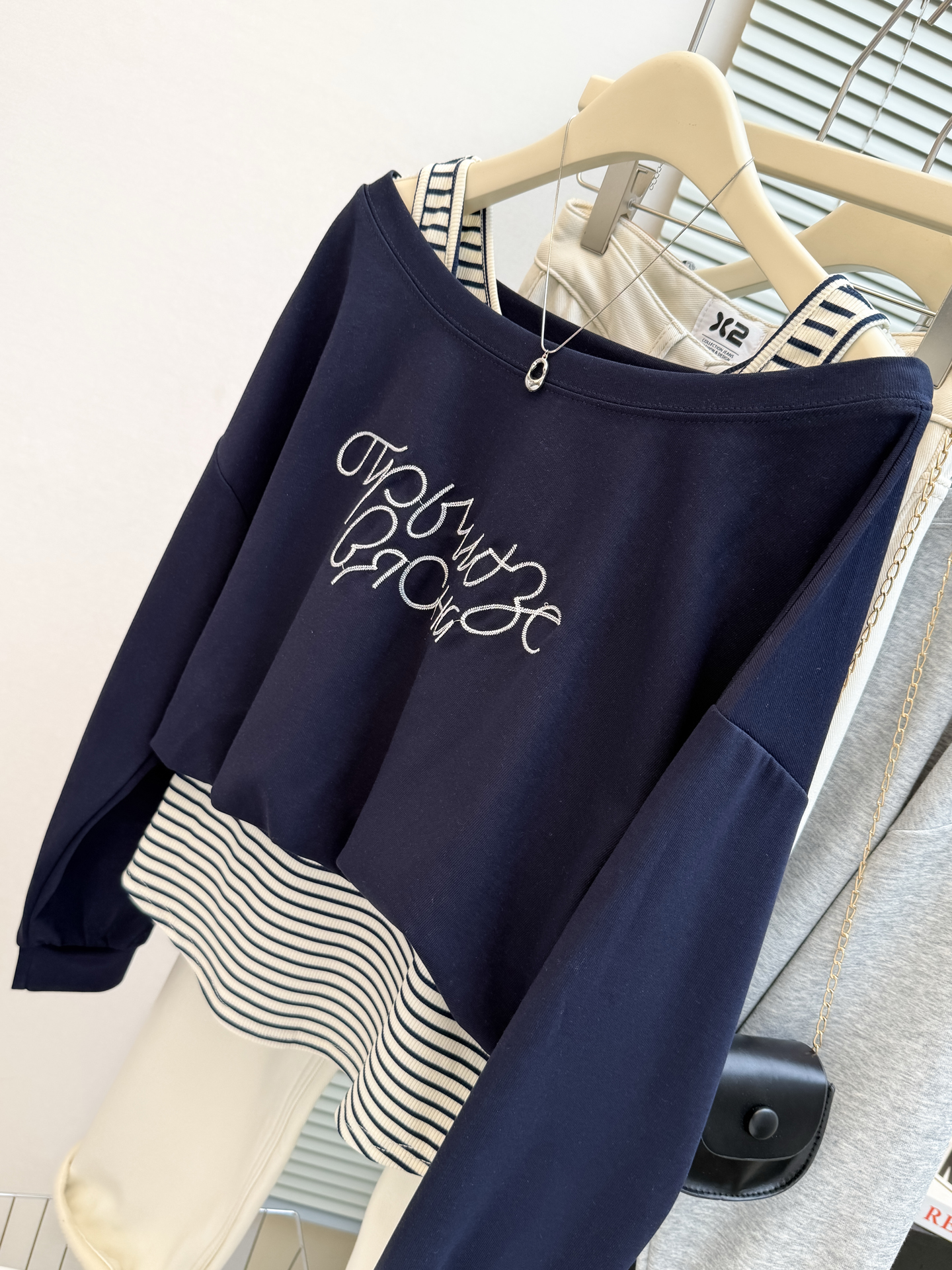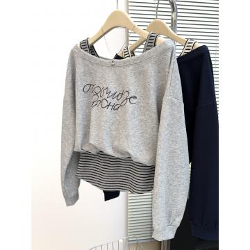 FA47194# 新款早秋季超火减龄露肩长袖卫衣大码女装胖mm假两件别致上衣 服裝批發女裝批發服飾貨源