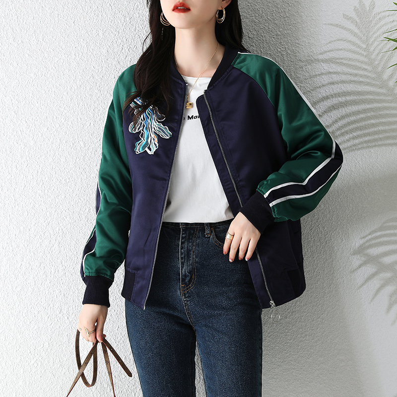 FA47208# 重工撞色刺绣醋酸料棒球夹克外套 服裝批發女裝批發服飾貨源