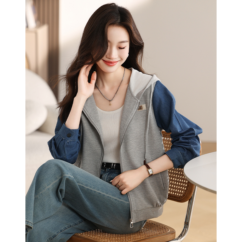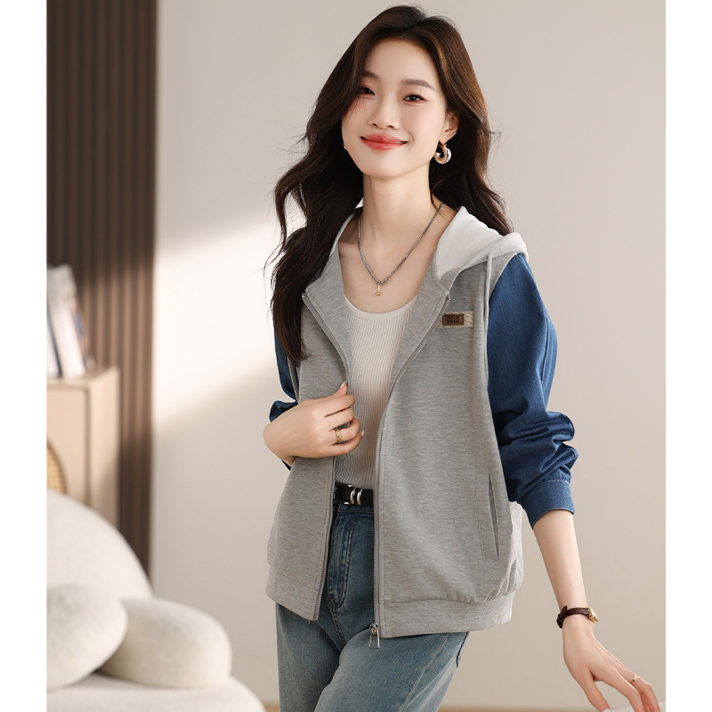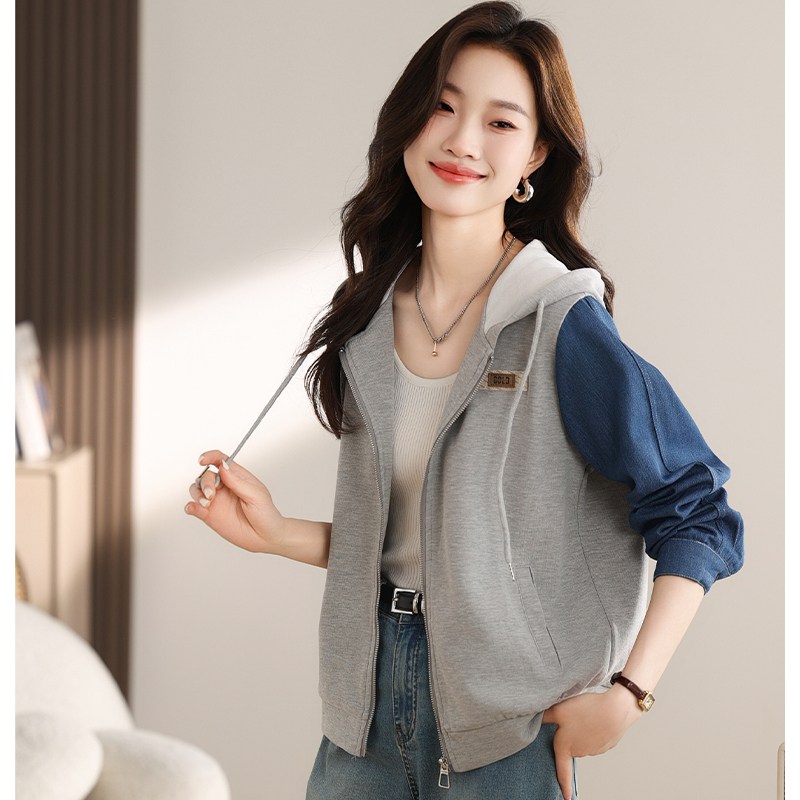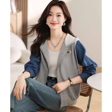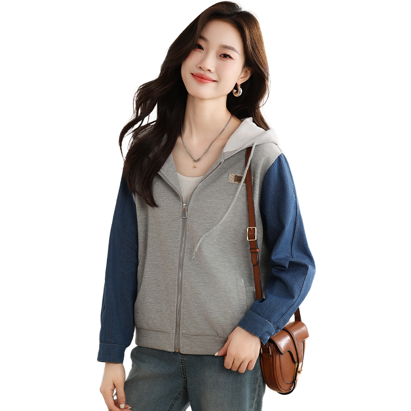 FA47209# 休闲牛仔拼接上衣秋新款抽绳连帽质感百搭外套女 服裝批發女裝批發服飾貨源
