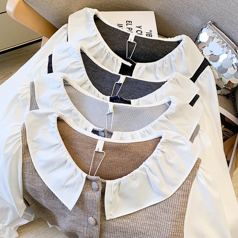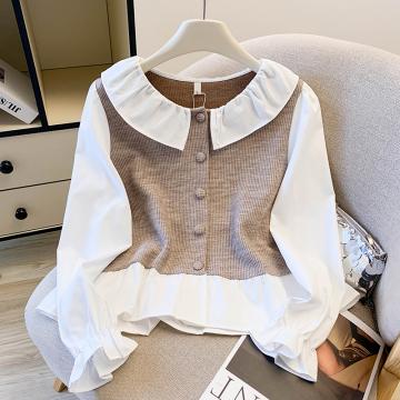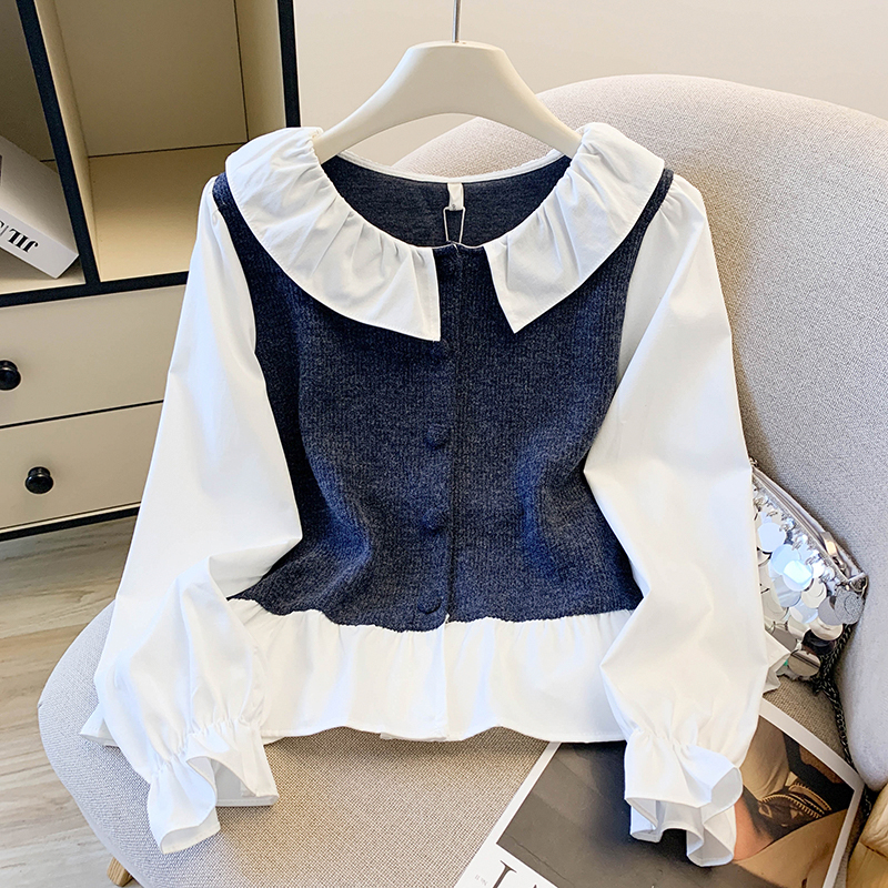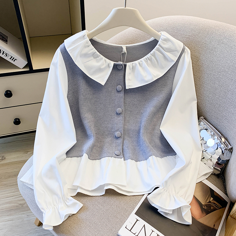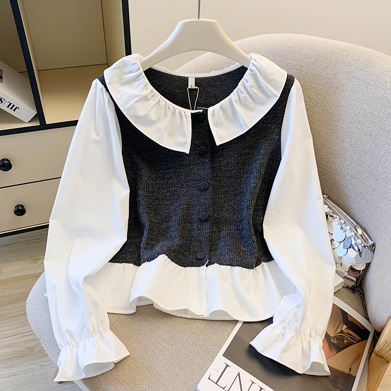 FA47217# 甜美撞色拼接娃娃领长袖衬衫女秋季荷叶边单排扣减龄针织上衣 服裝批發女裝批發服飾貨源