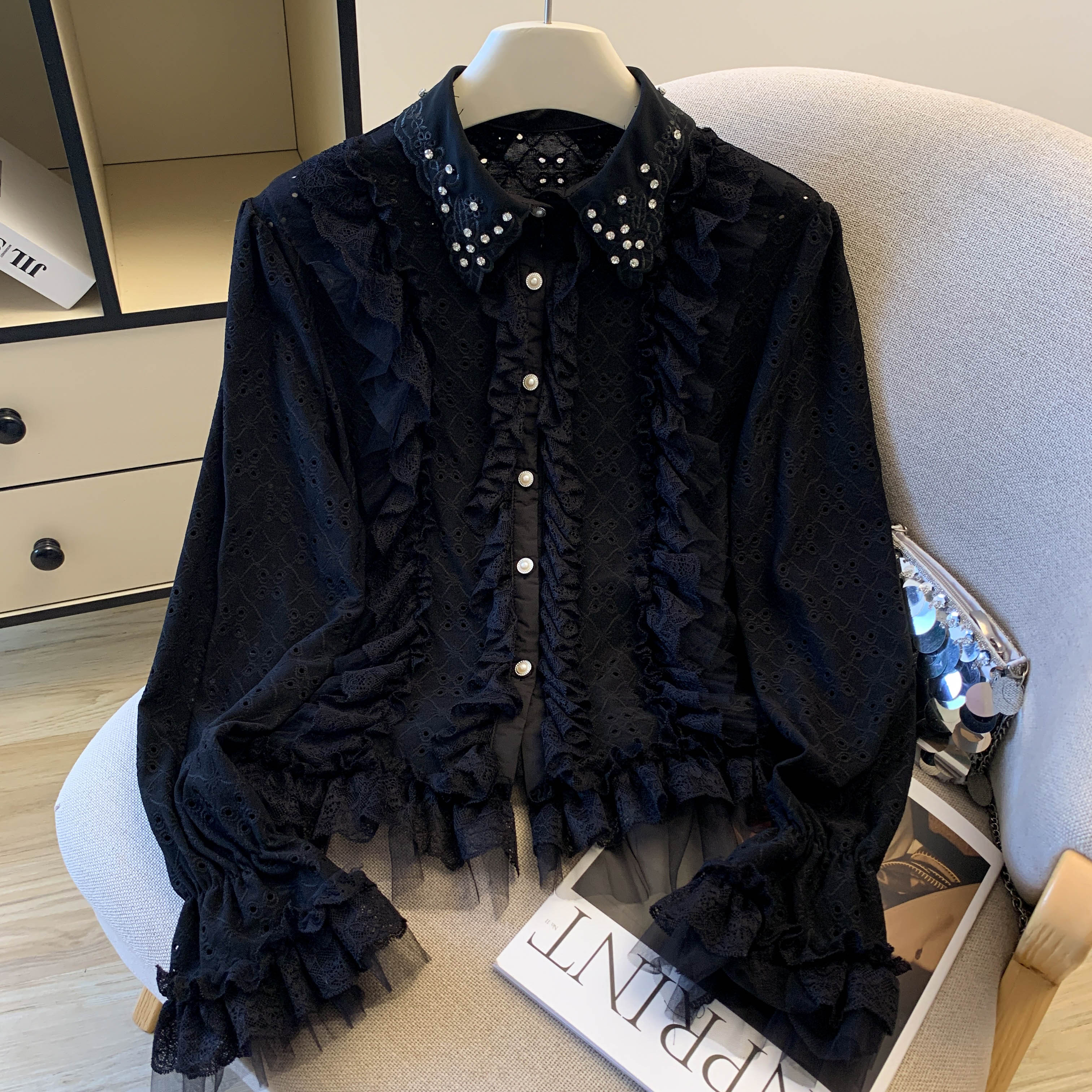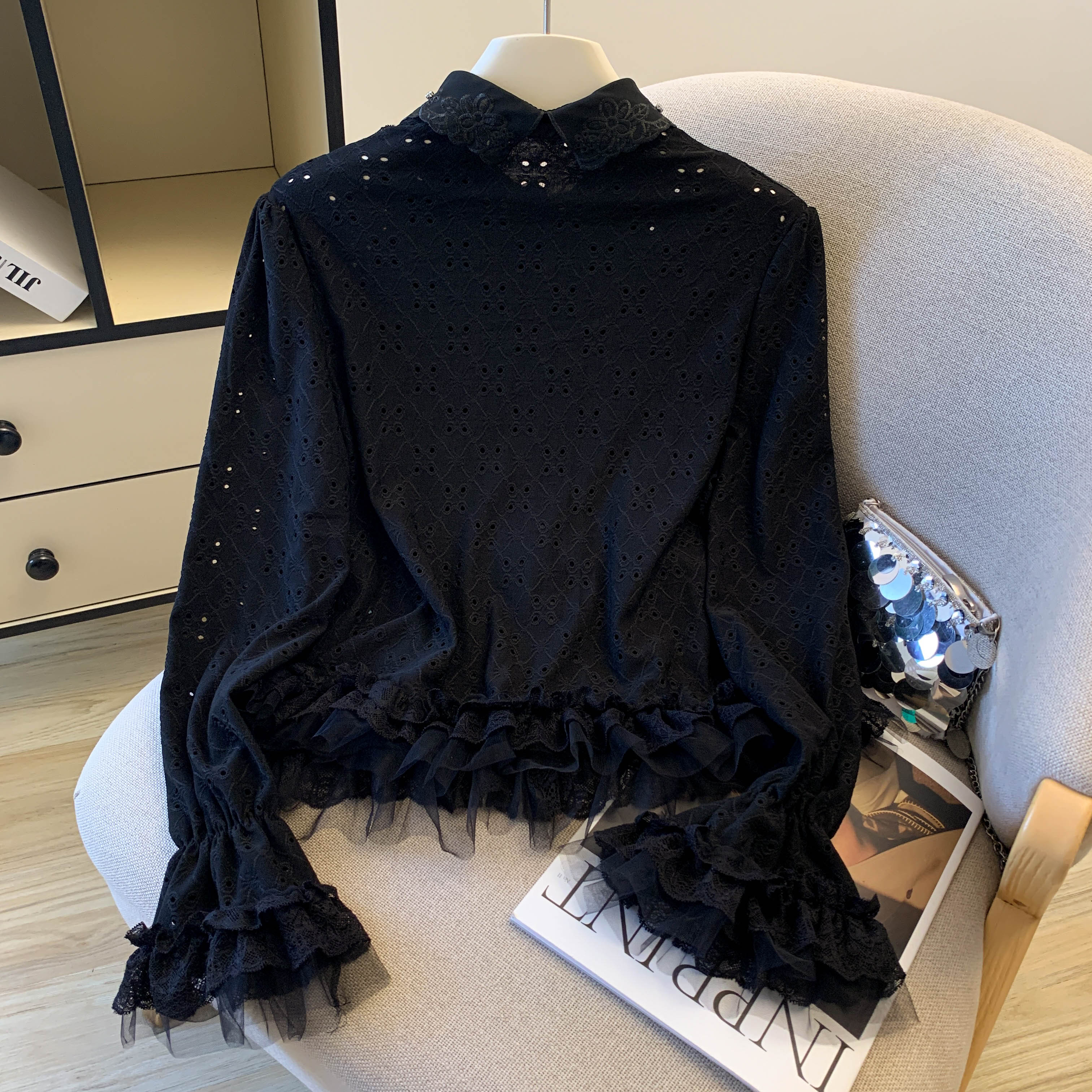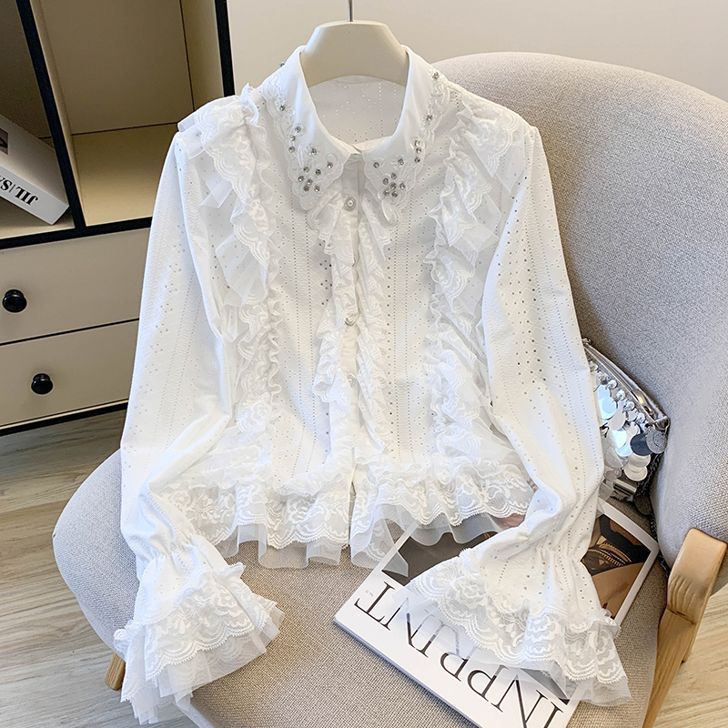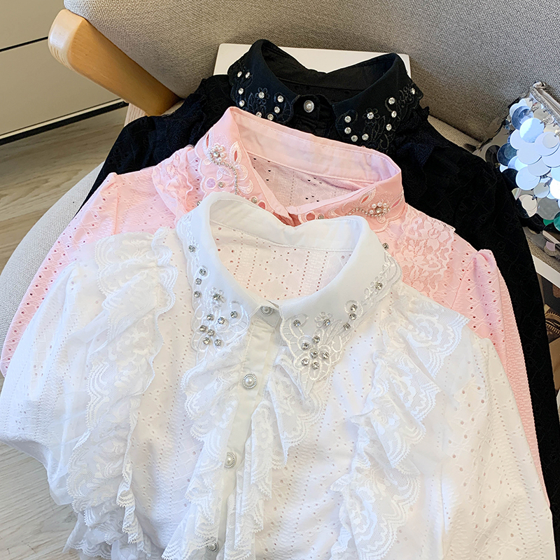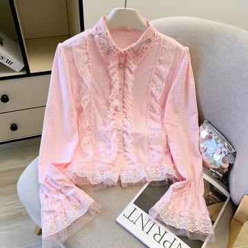 FA47219# 法式宫廷风蕾丝花边粉色衬衫女秋冬小众设计感洋气喇叭袖小衫上衣 服裝批發女裝批發服飾貨源