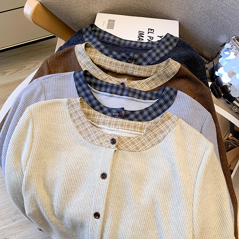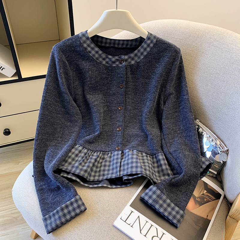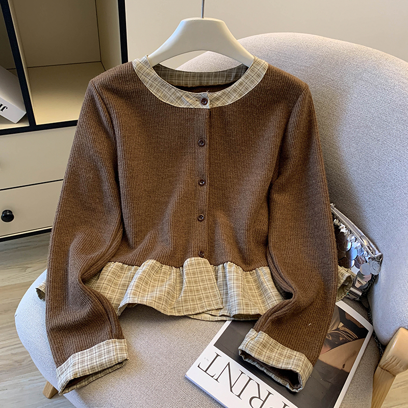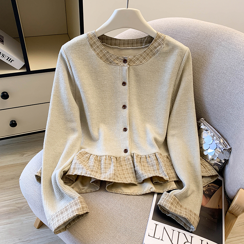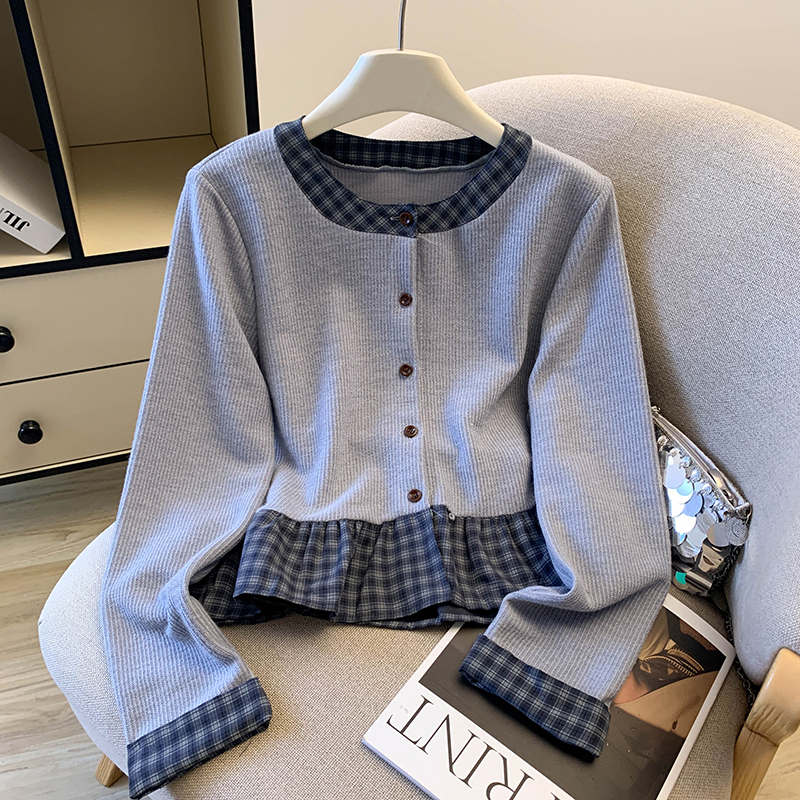 Home > 长袖雪纺衫、衬衫、上衣 > FA47220# 早秋新款爆款法式假两件格子衬衫女荷叶边巨好看短款长袖上衣 服裝批發女裝批發服飾貨源