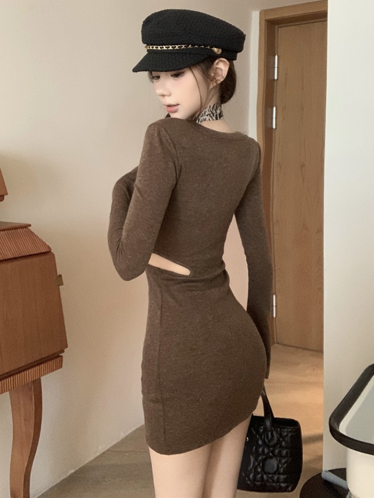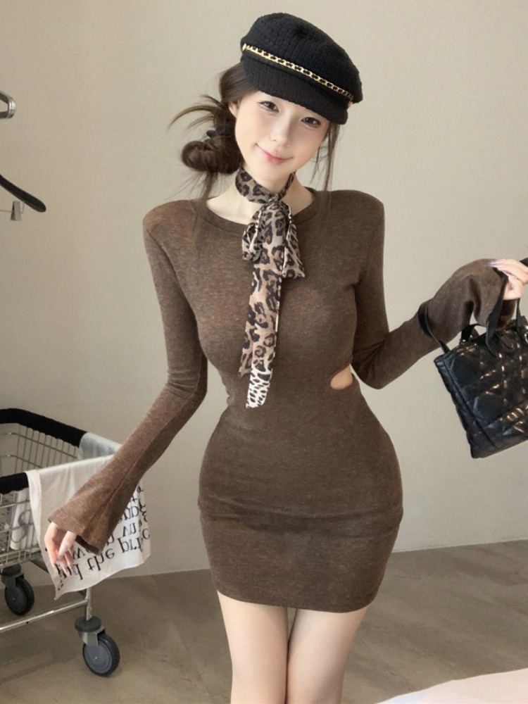 FA47332# 复古辣妹圆领镂空收腰喇叭袖连衣裙女秋冬显身材性感紧身包臀短裙 服裝批發女裝批發服飾貨源