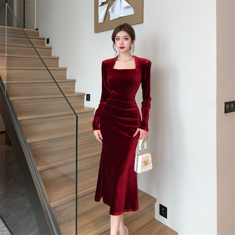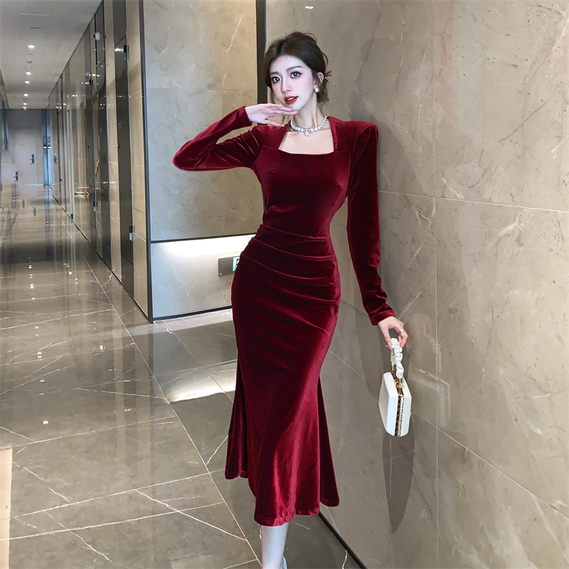 FA47395# 名媛风长裙方领丝绒纯色长袖简约打底鱼尾连衣裙 服裝批發女裝批發服飾貨源