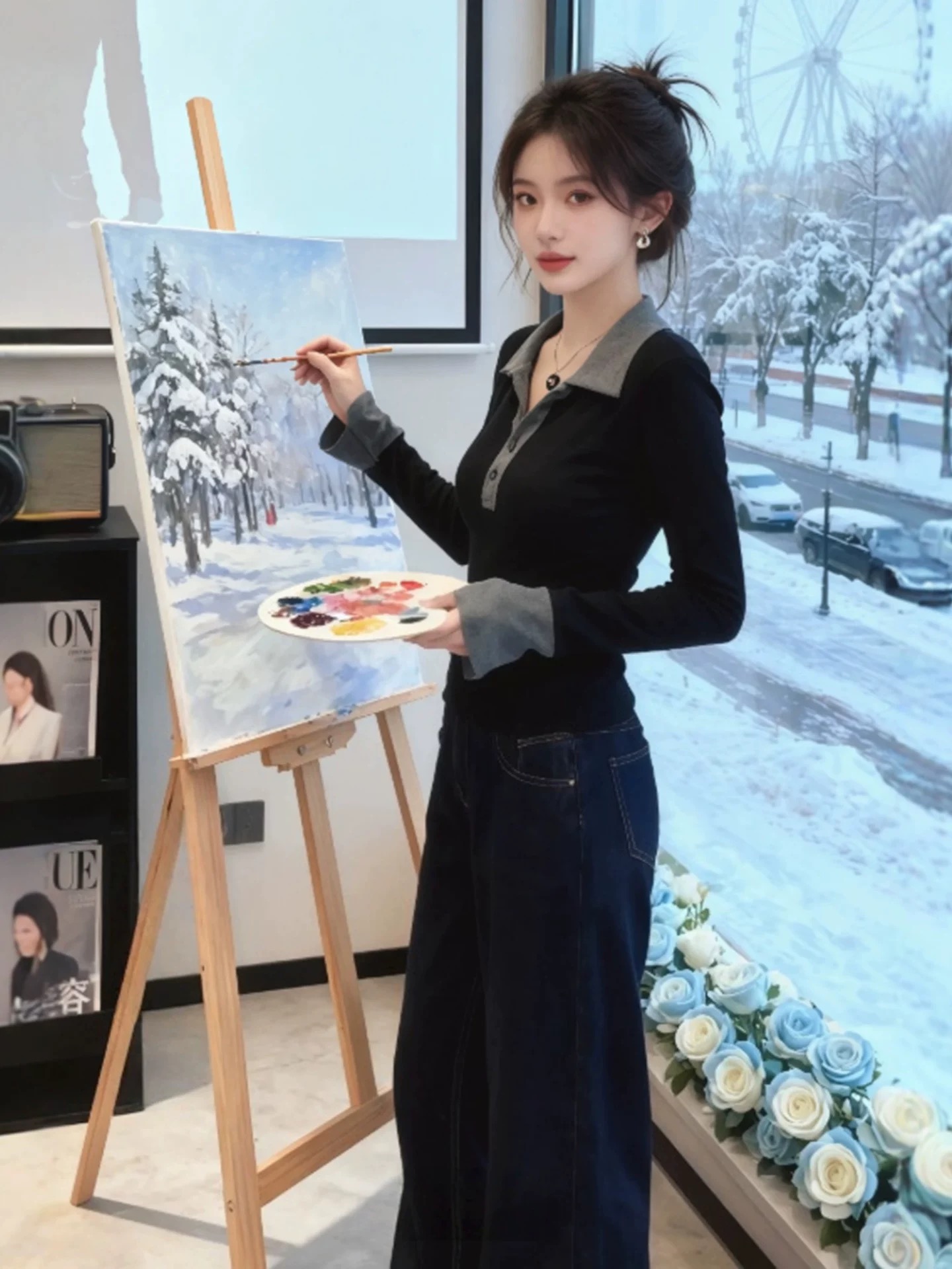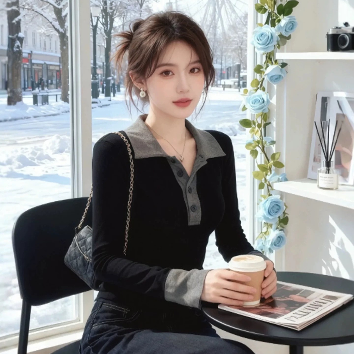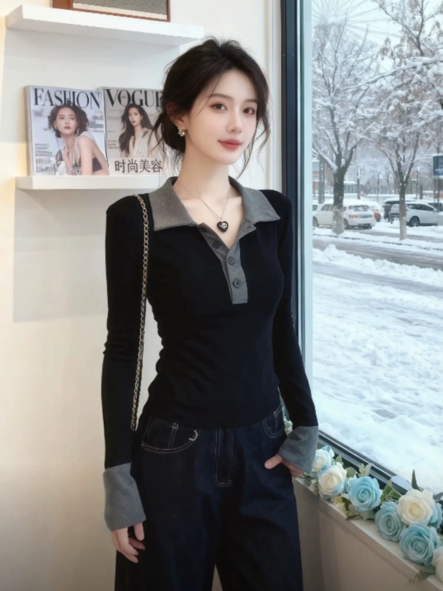 FA47711# 黑灰色polo领修身内搭长袖T恤女新款早秋季可外穿高级感上衣 服裝批發女裝批發服飾貨源