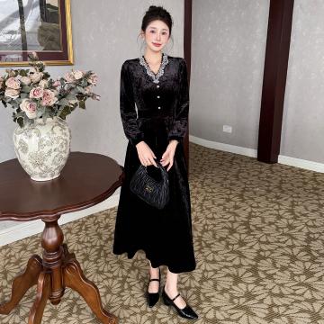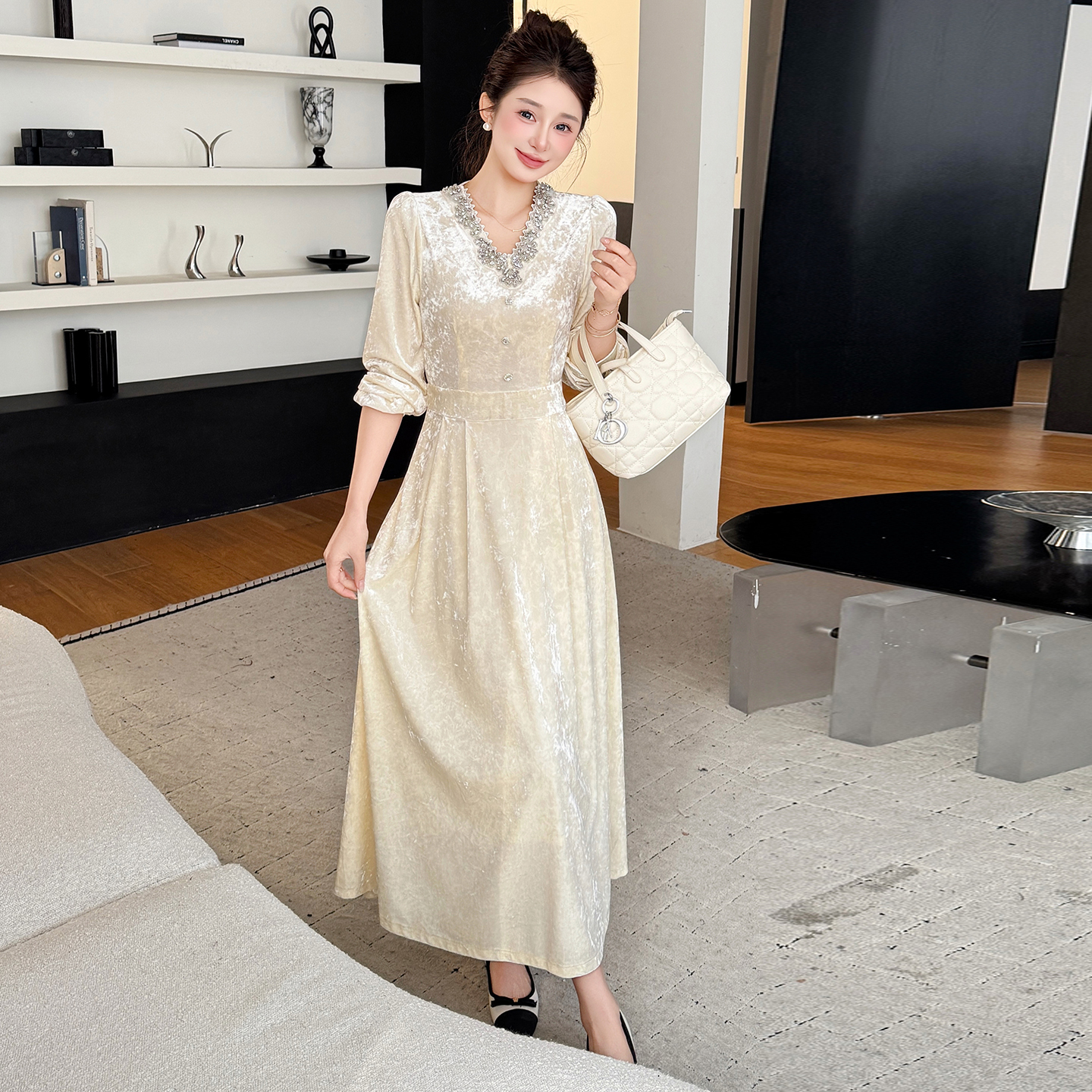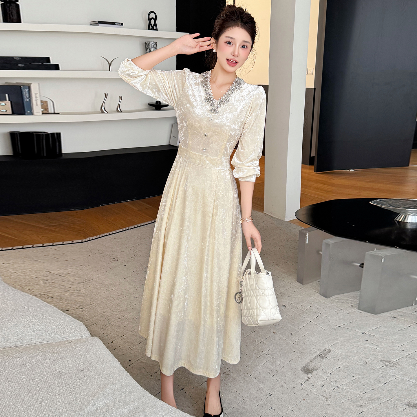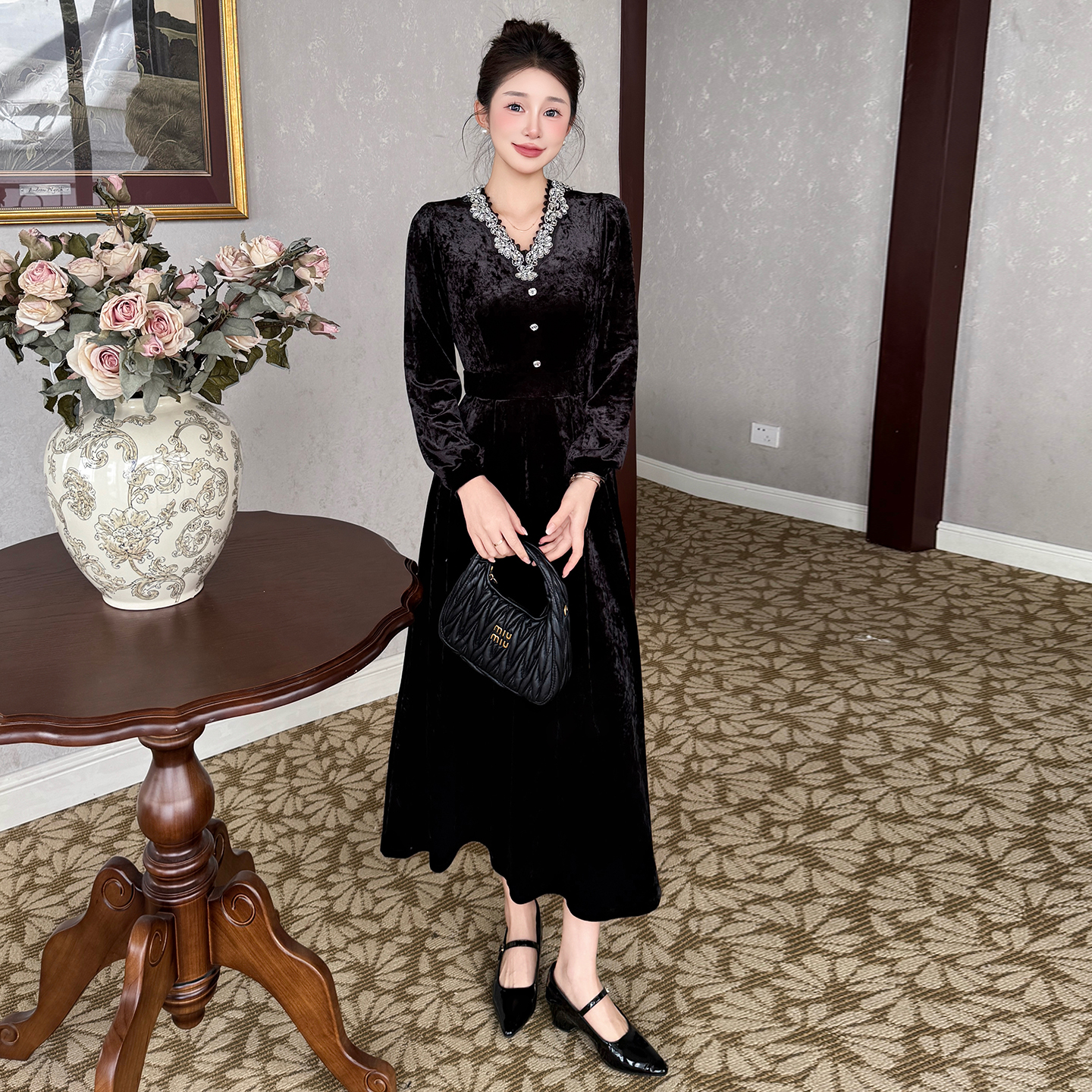 FA47723# 秋冬时尚轻奢显瘦丝绒重工钉珠温柔风气质大摆大码连衣裙 服裝批發女裝批發服飾貨源