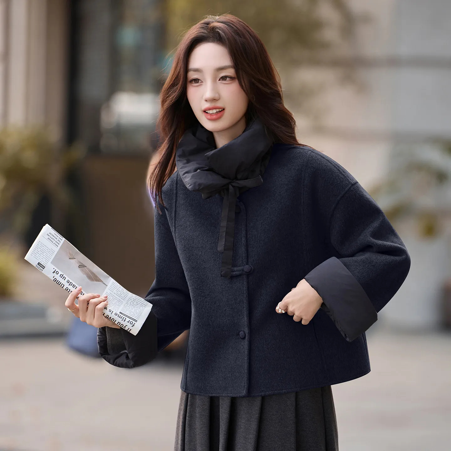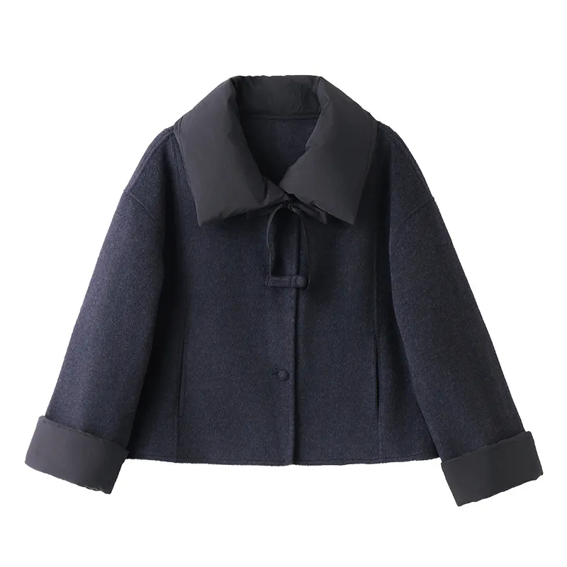 FA48180# 女式短款加厚毛呢外套秋冬新款高端翻领拼接毛呢宽松时尚外套 服裝批發女裝批發服飾貨源