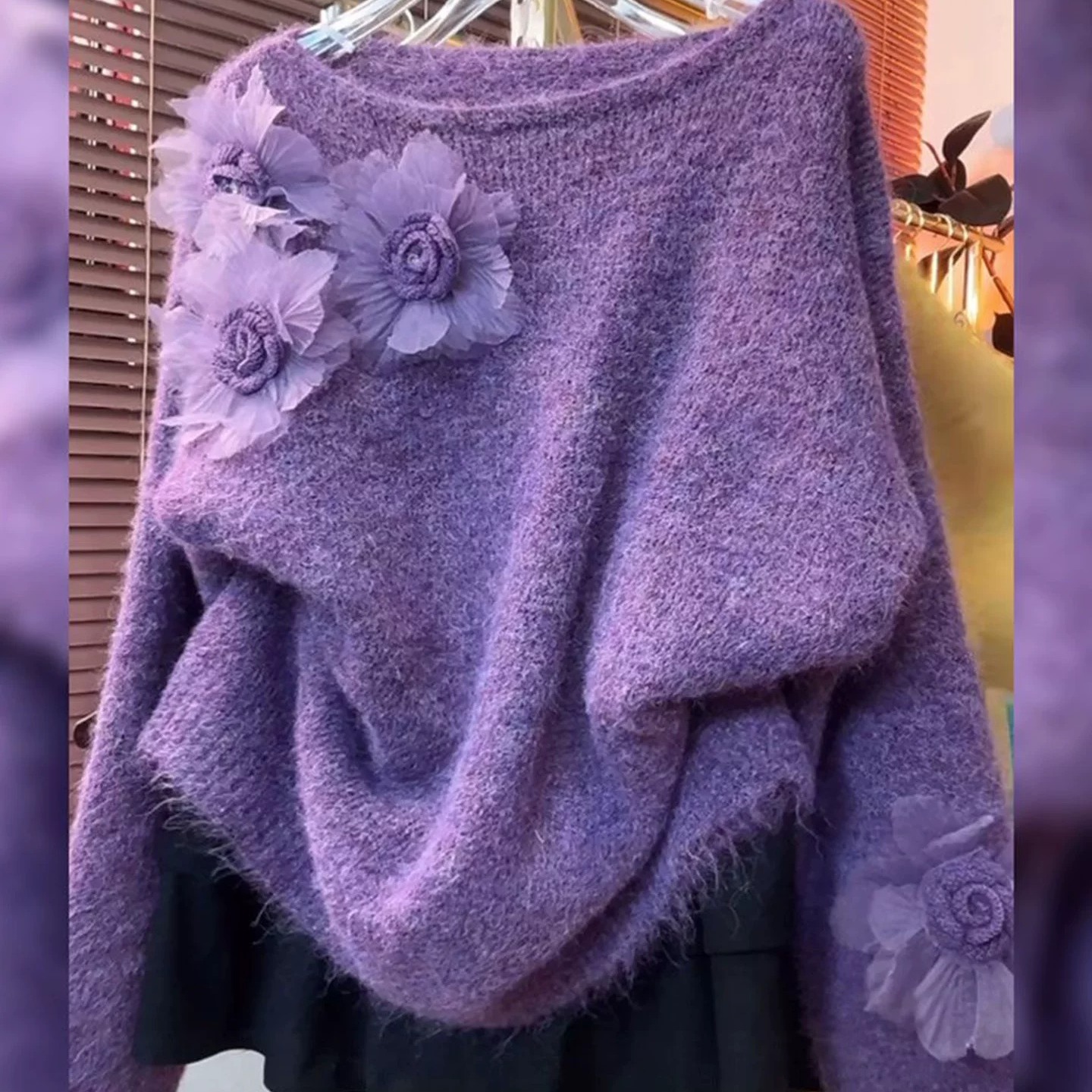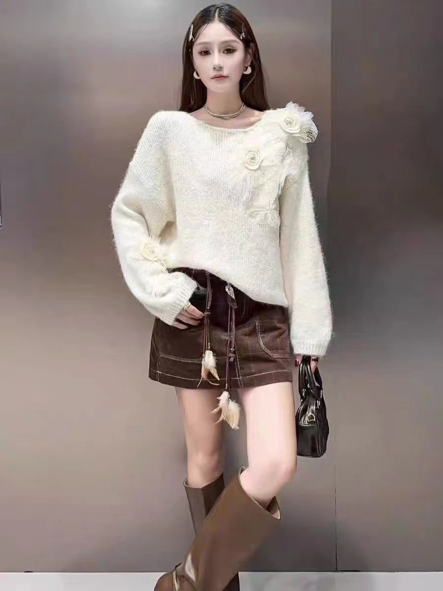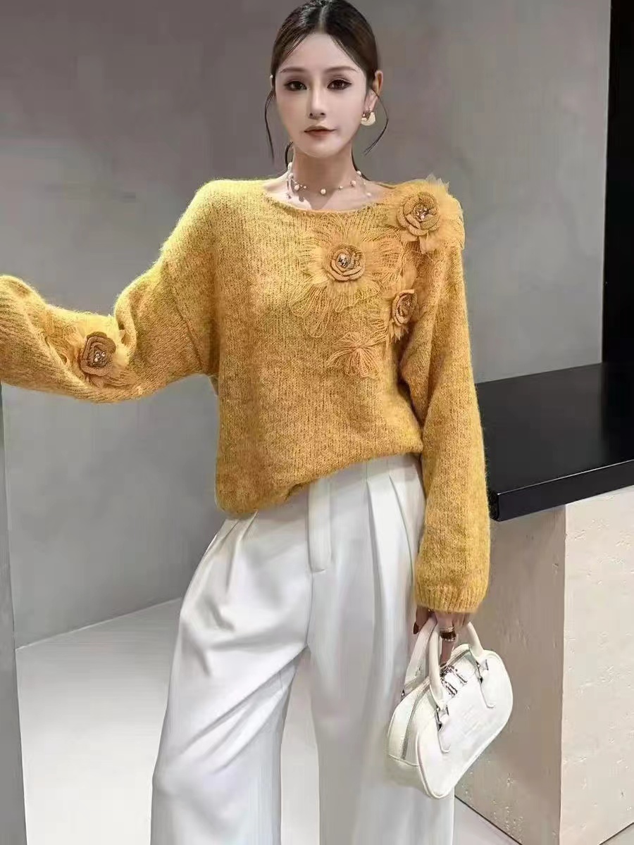 FA48186# 秋款时尚圆领立体花朵针织套头女宽松显瘦百搭长袖上衣 服裝批發女裝批發服飾貨源