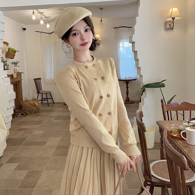 FA49525# 月下桂语精致琉璃扣针织套装女显白双排扣开衫百褶半身短裙