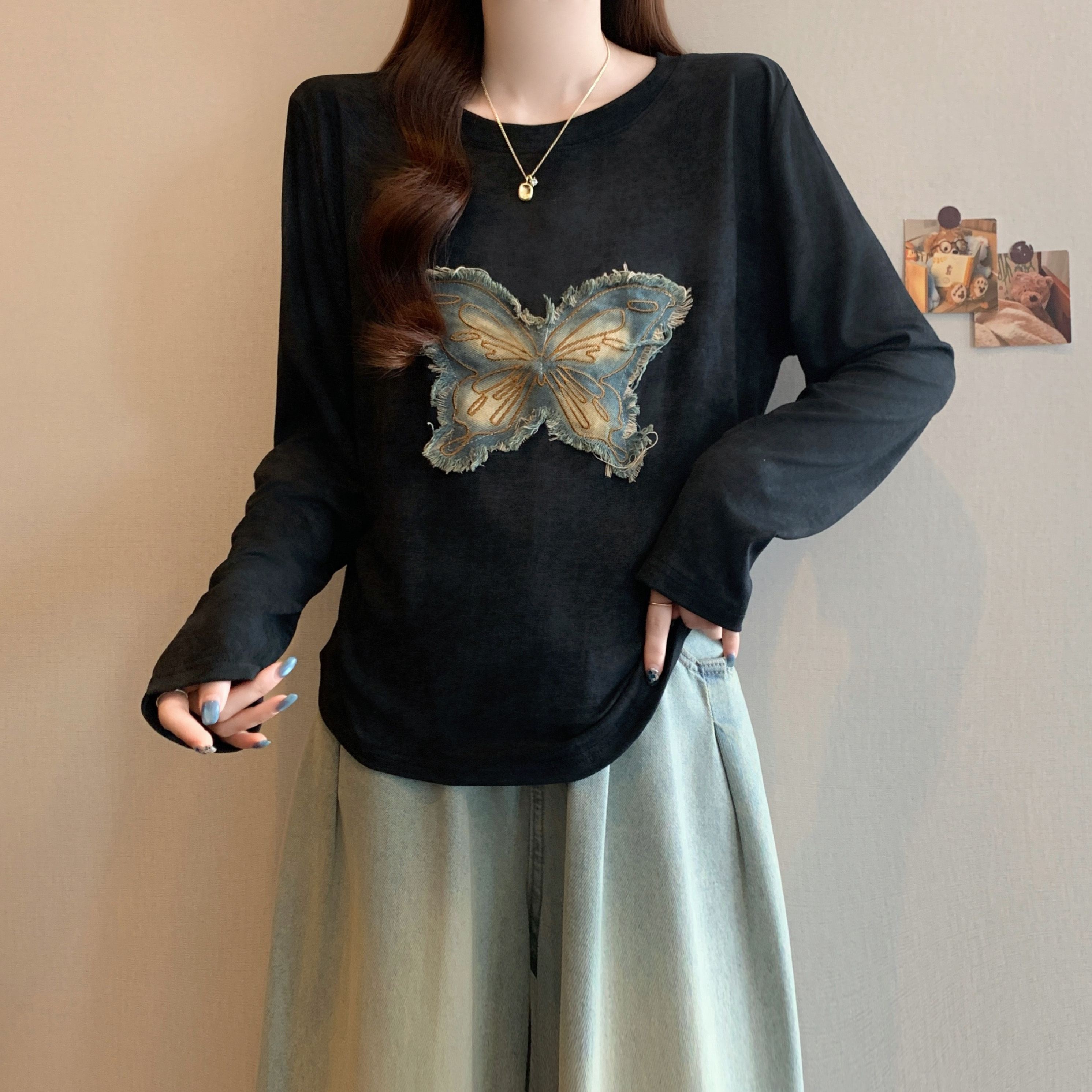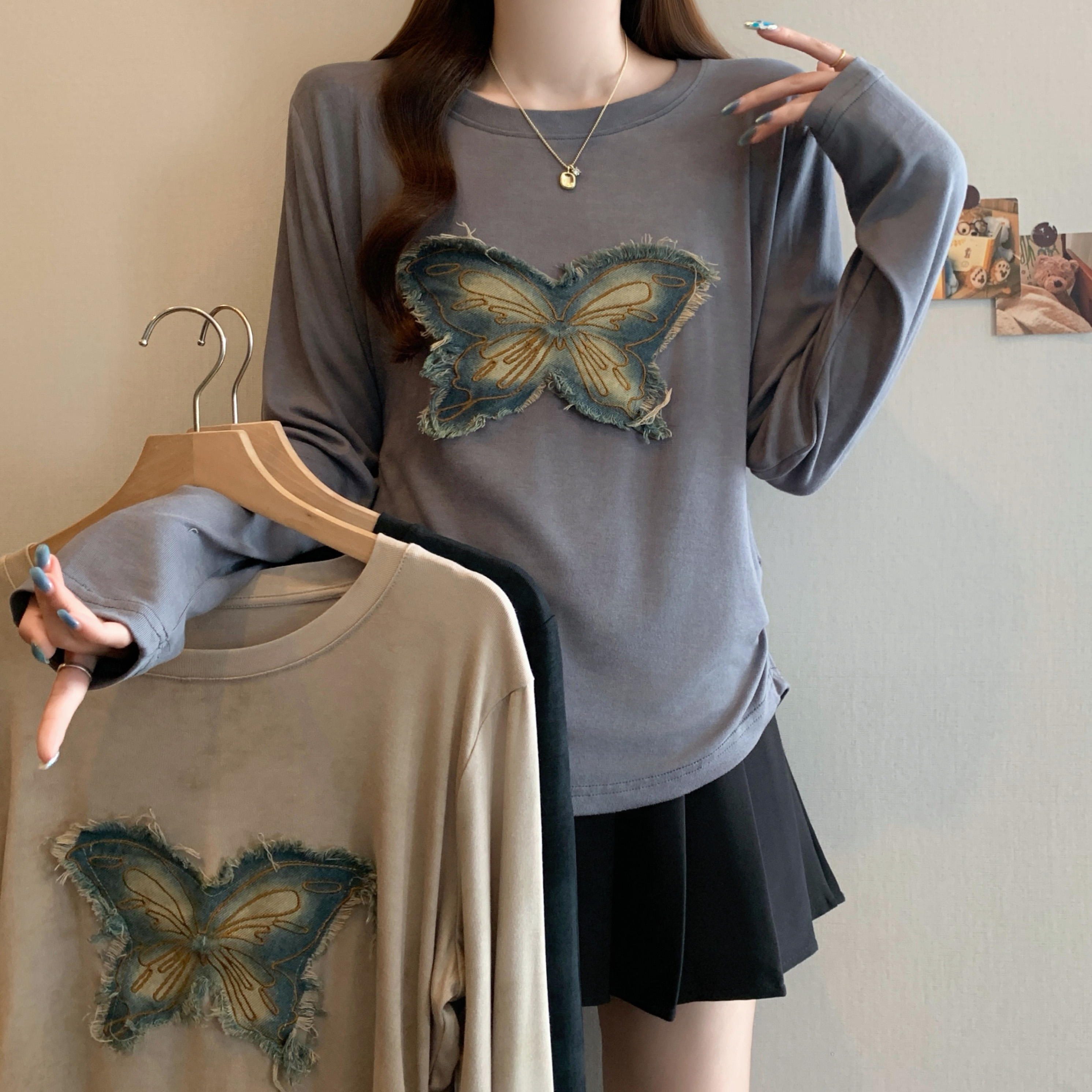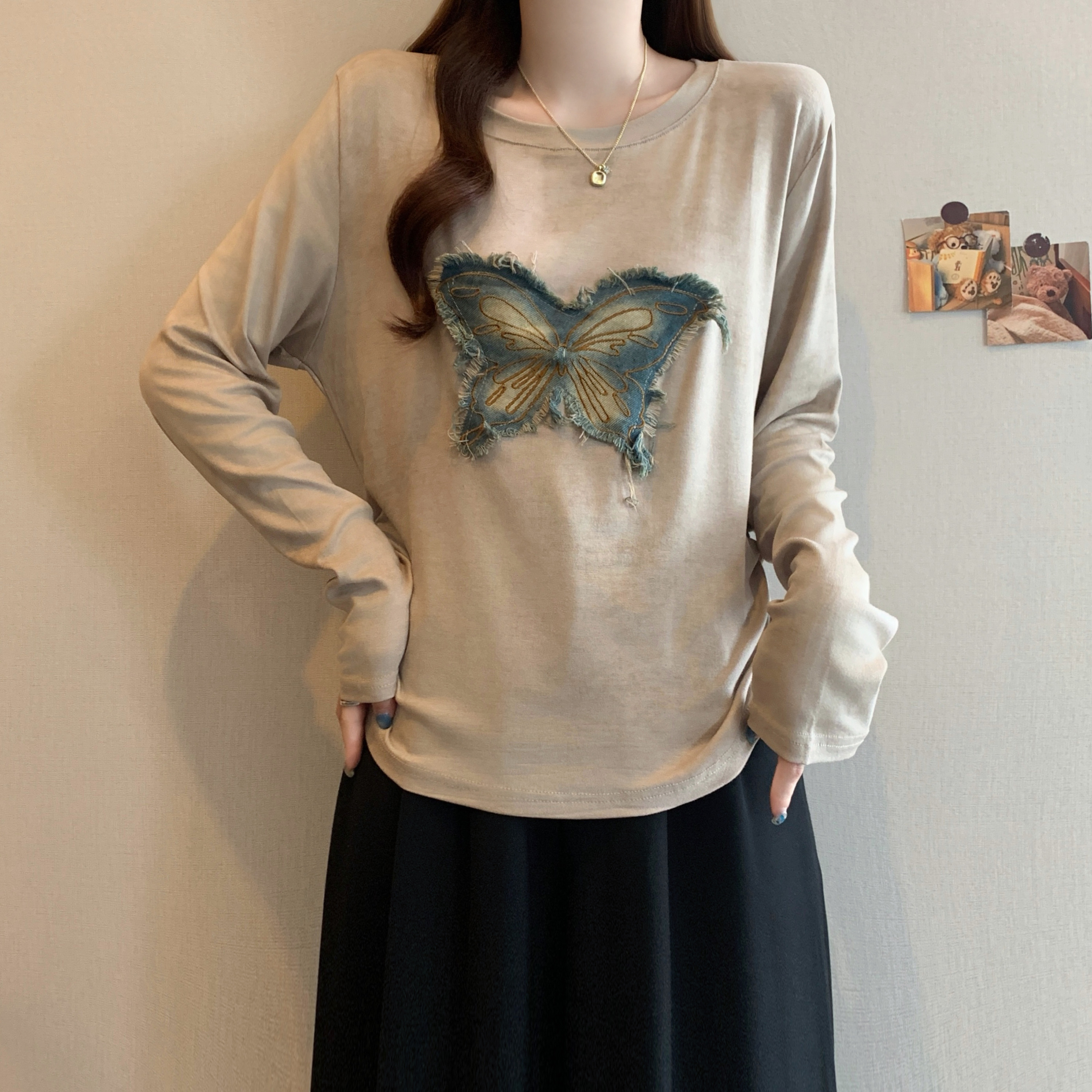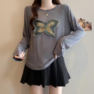 FA49552# 大码女装胖mm美式复古扎染蝴蝶显瘦长袖T恤秋季收腰修身上衣